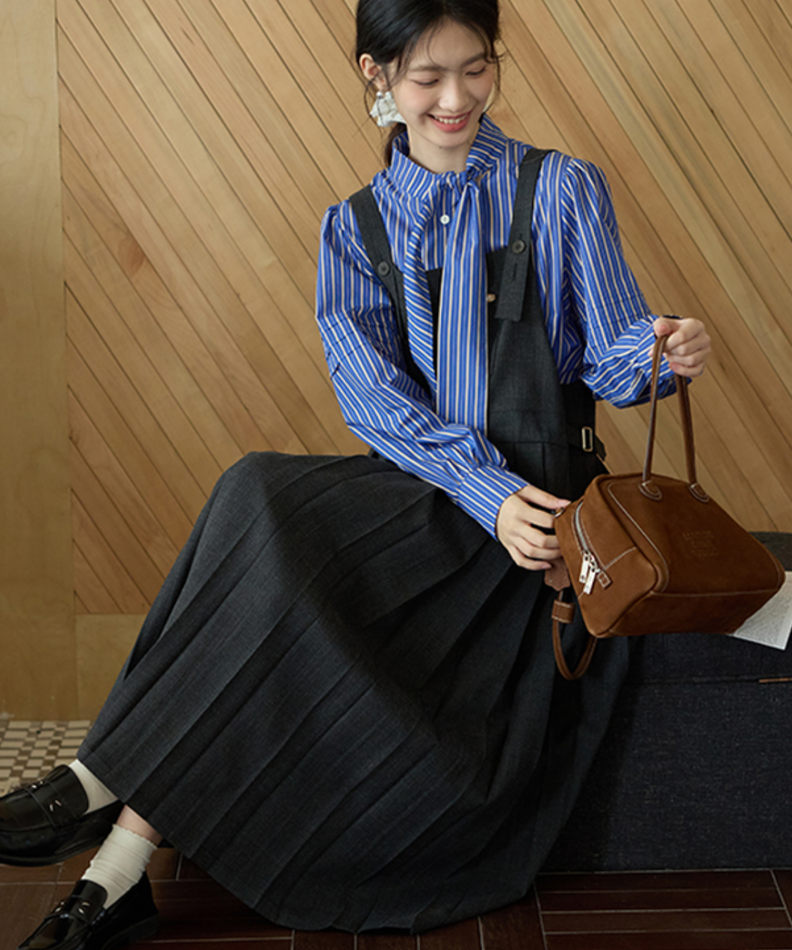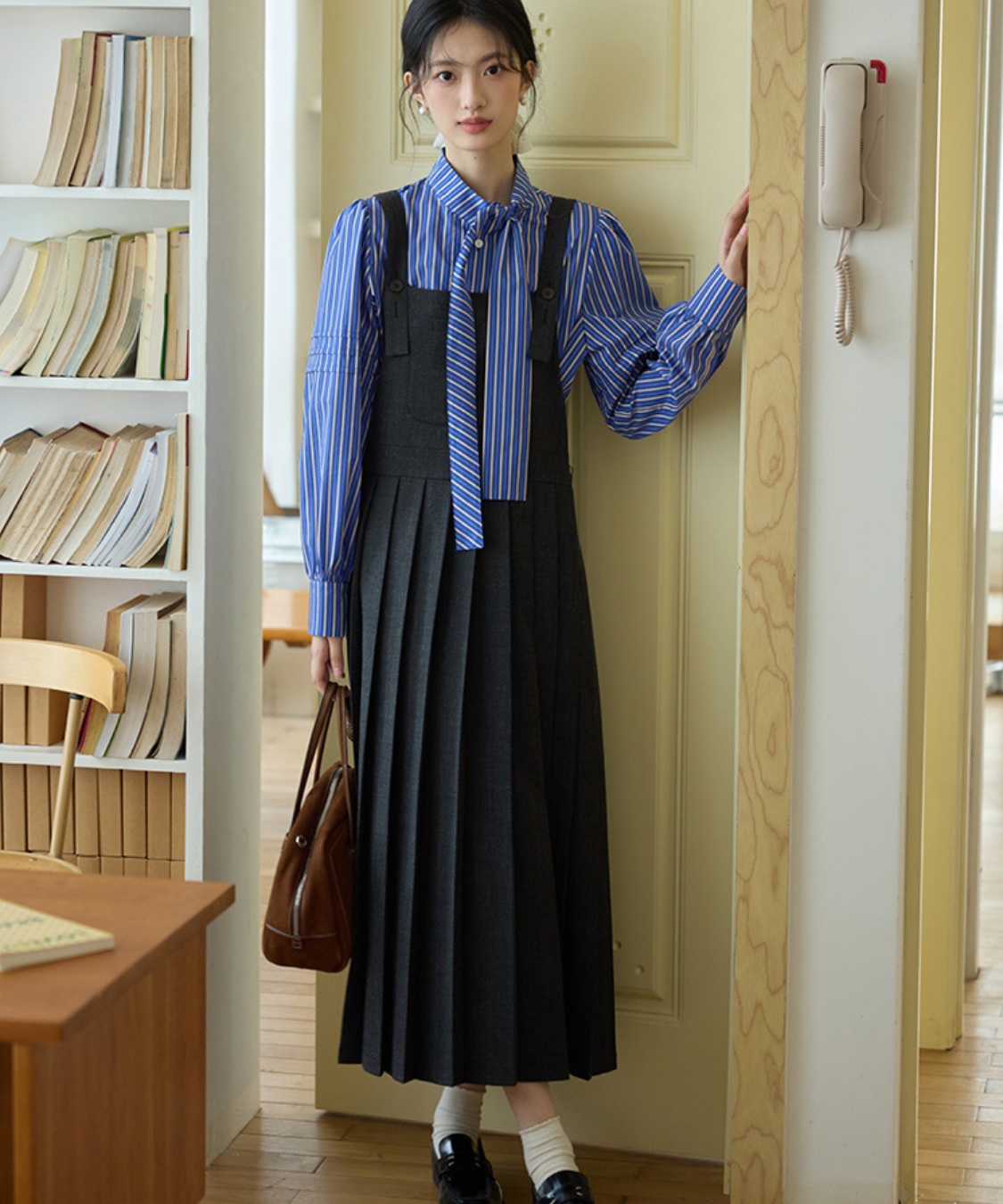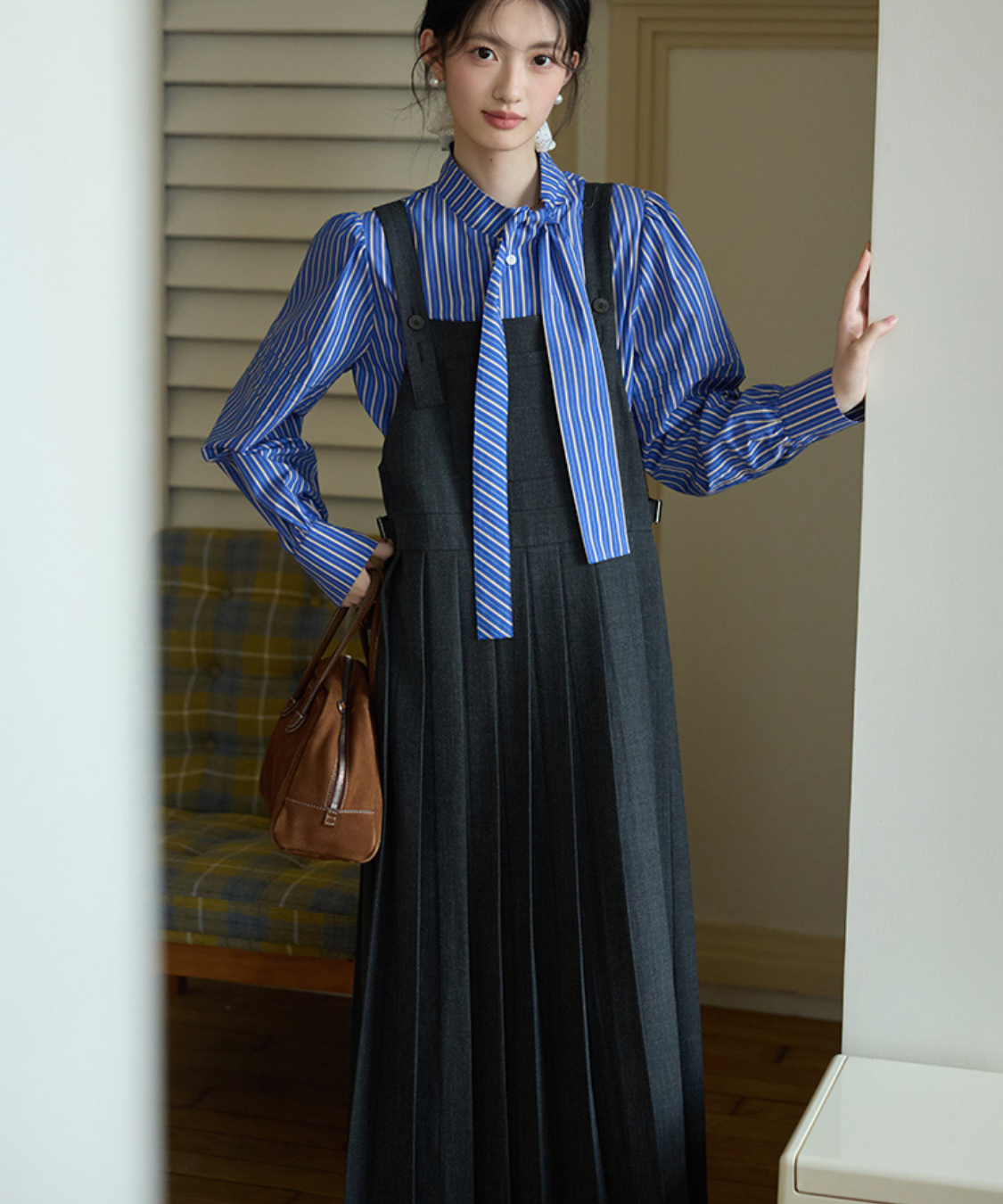 上品なロング丈にボックスプリーツが映える、大人可愛いジャンパースカートです。