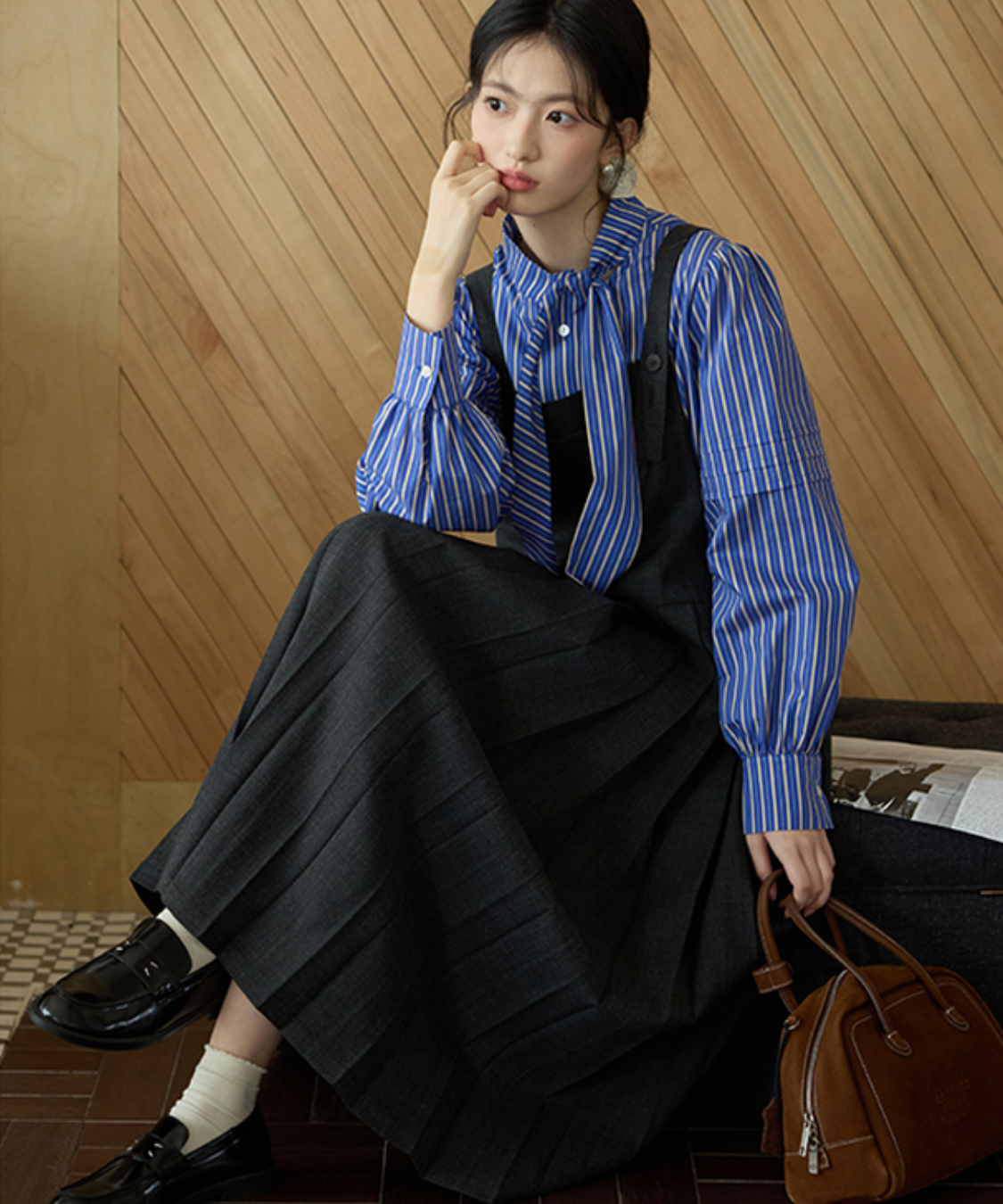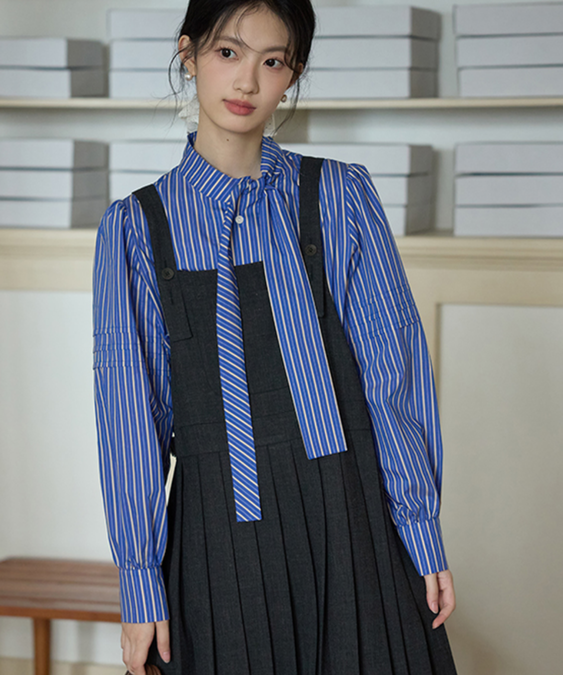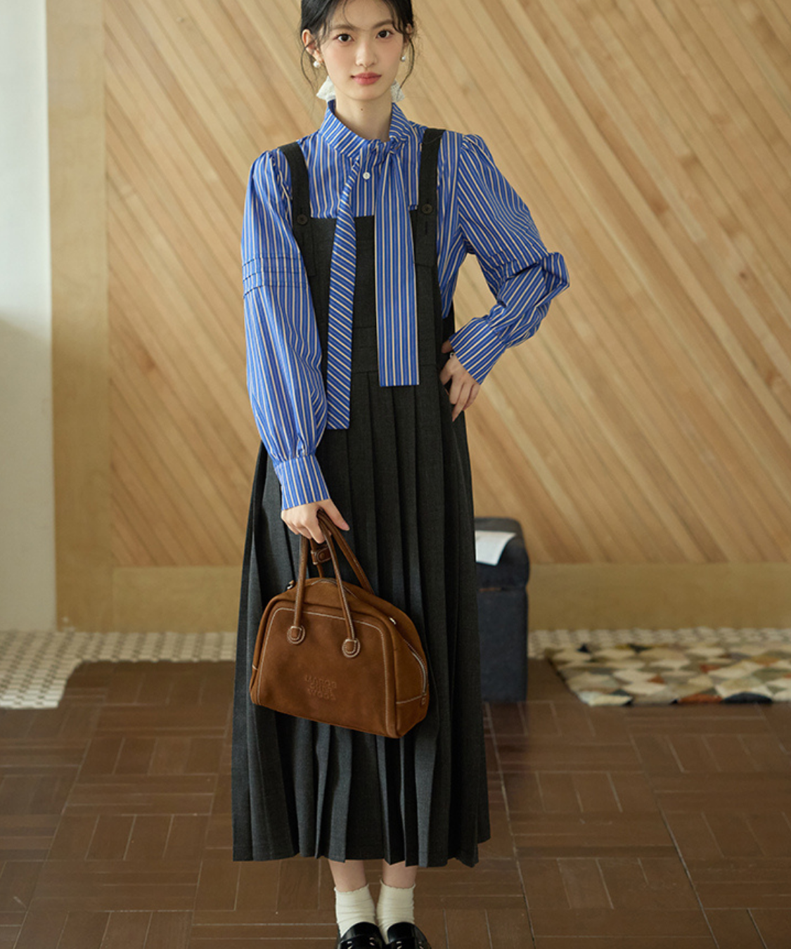上品なロング丈にボックスプリーツが映える、大人可愛いジャンパースカートです。