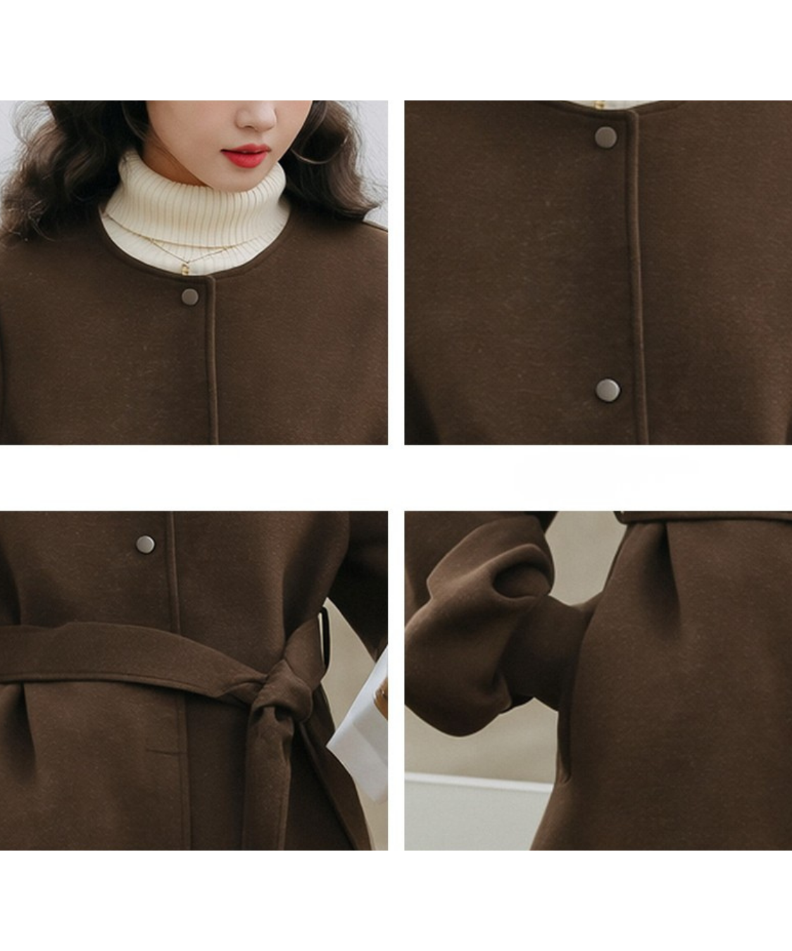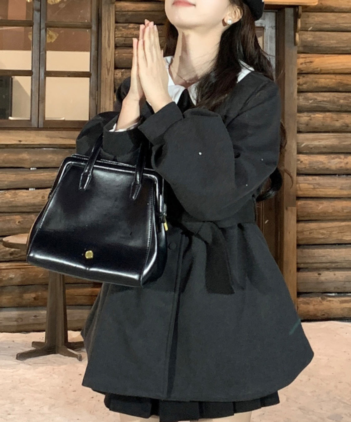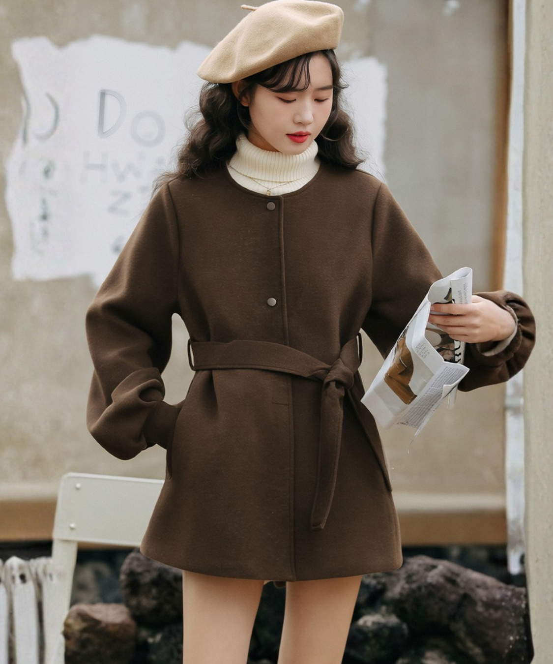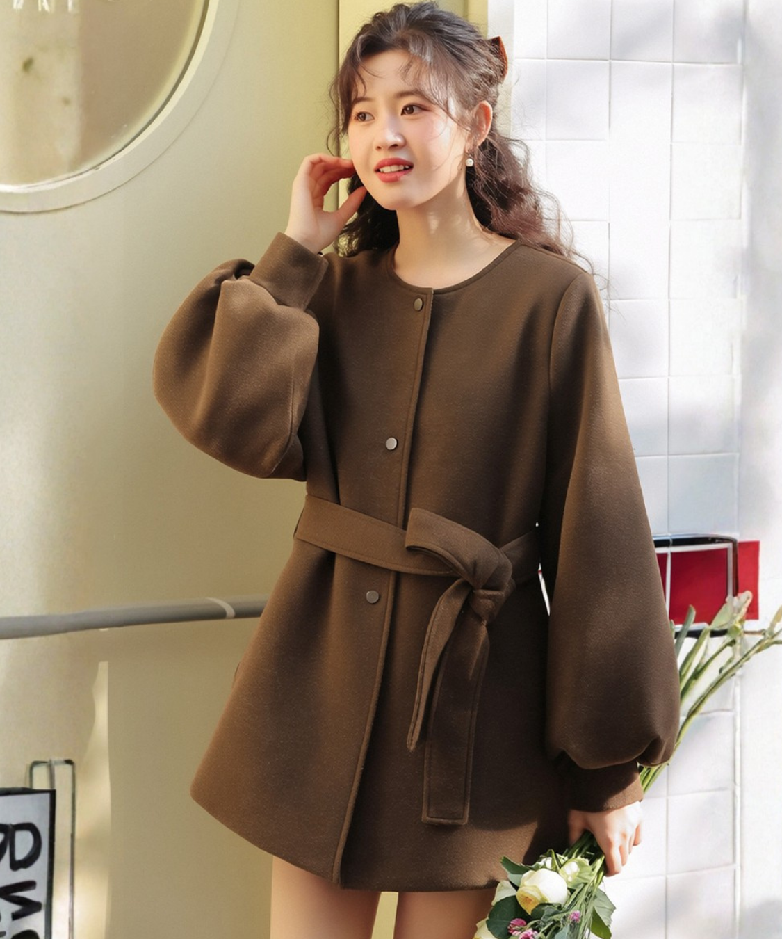 丸みのあるシルエットが可愛らしい、ノーカラーデザインのショートコートです。