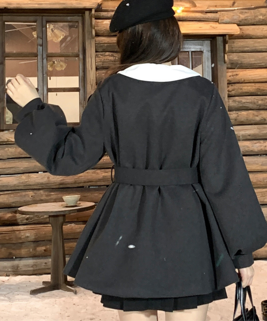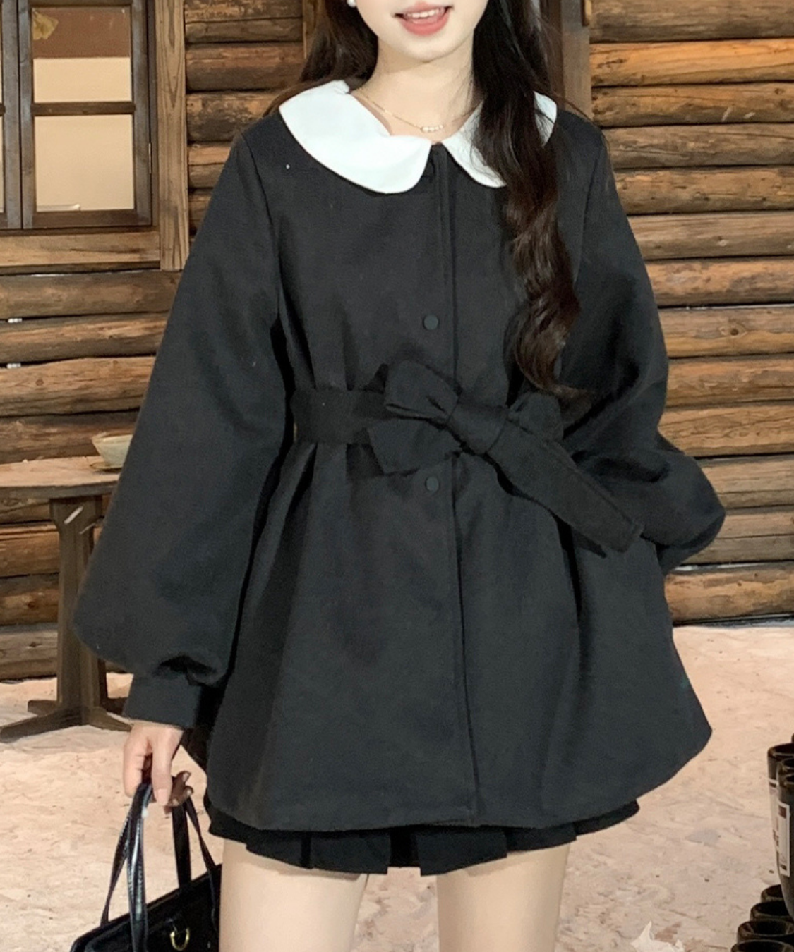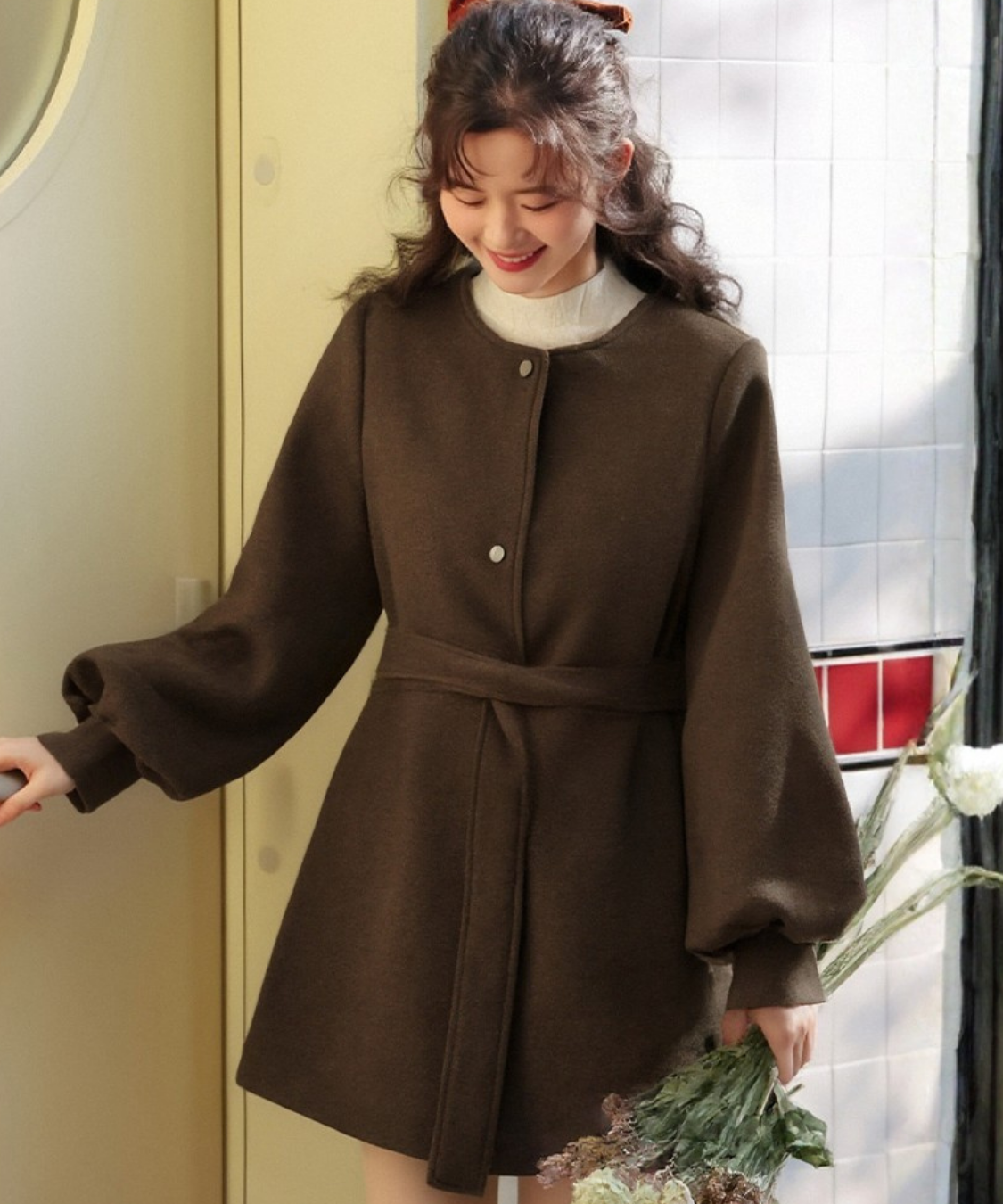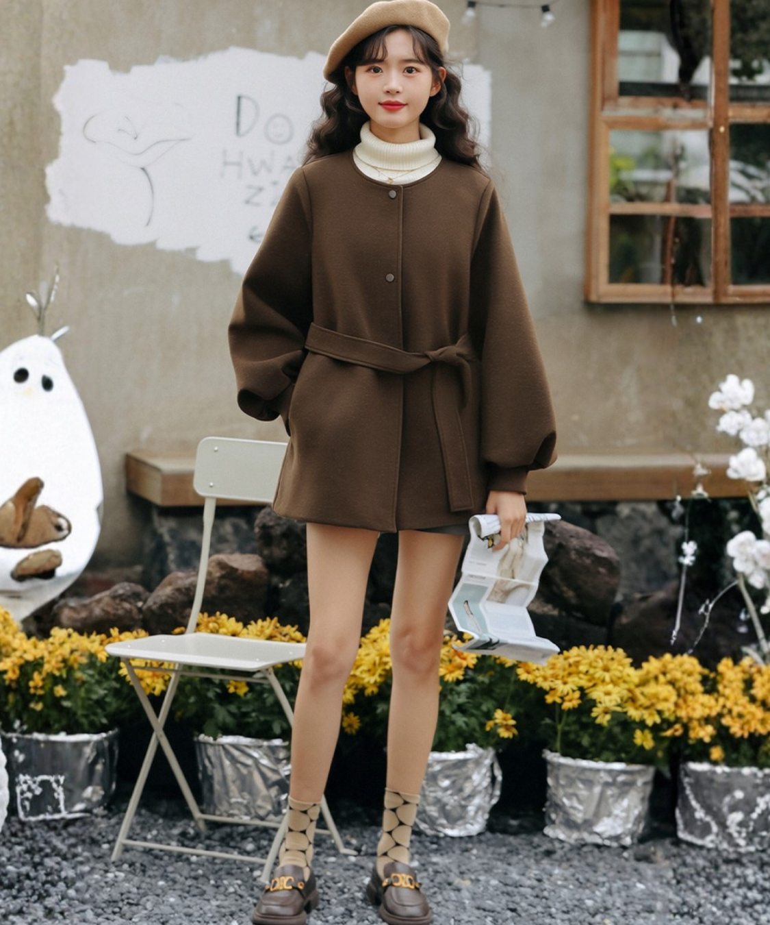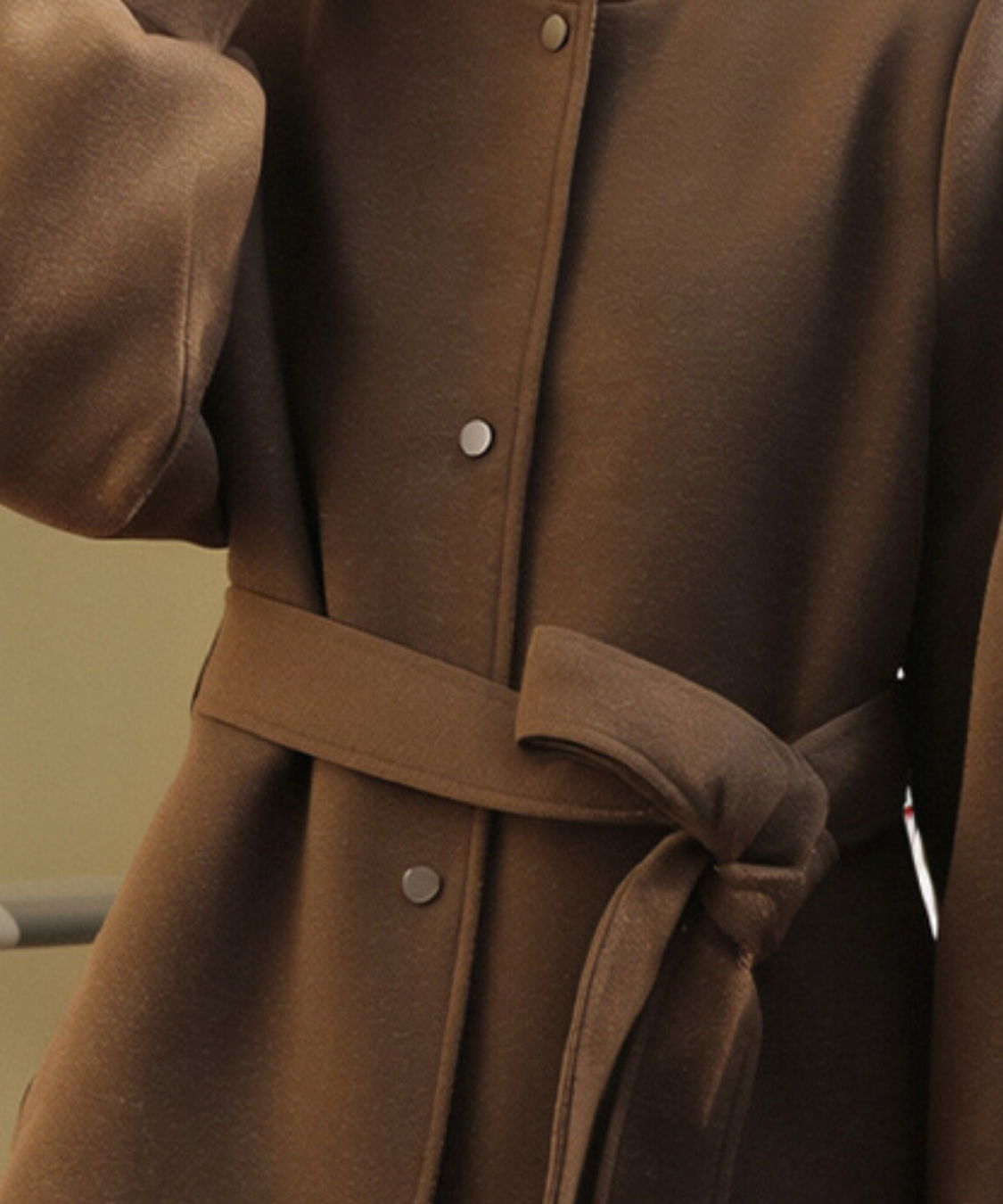 丸みのあるシルエットが可愛らしい、ノーカラーデザインのショートコートです。