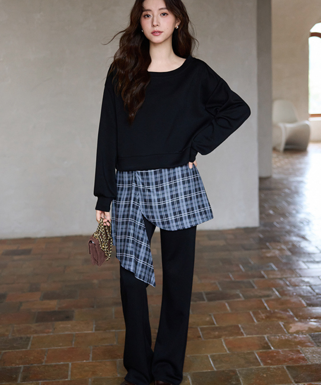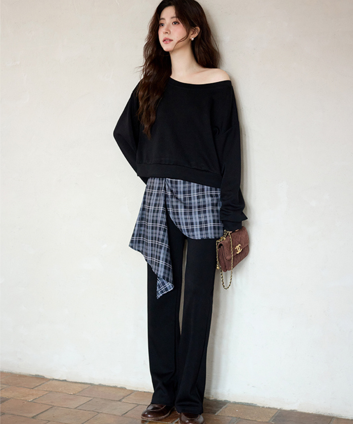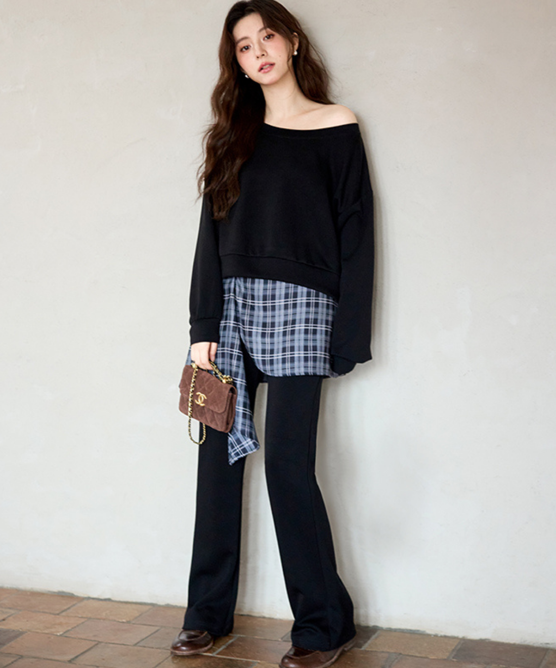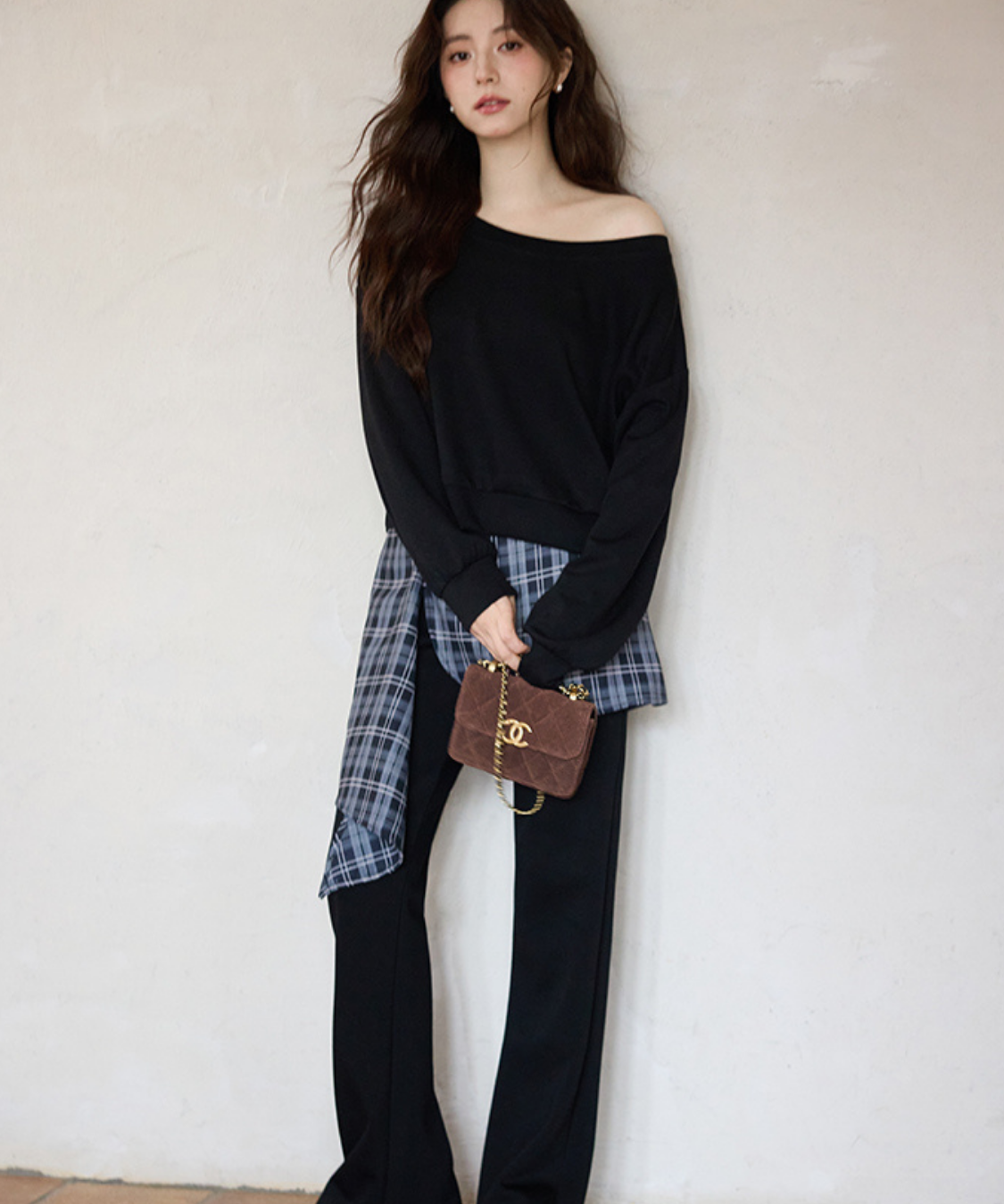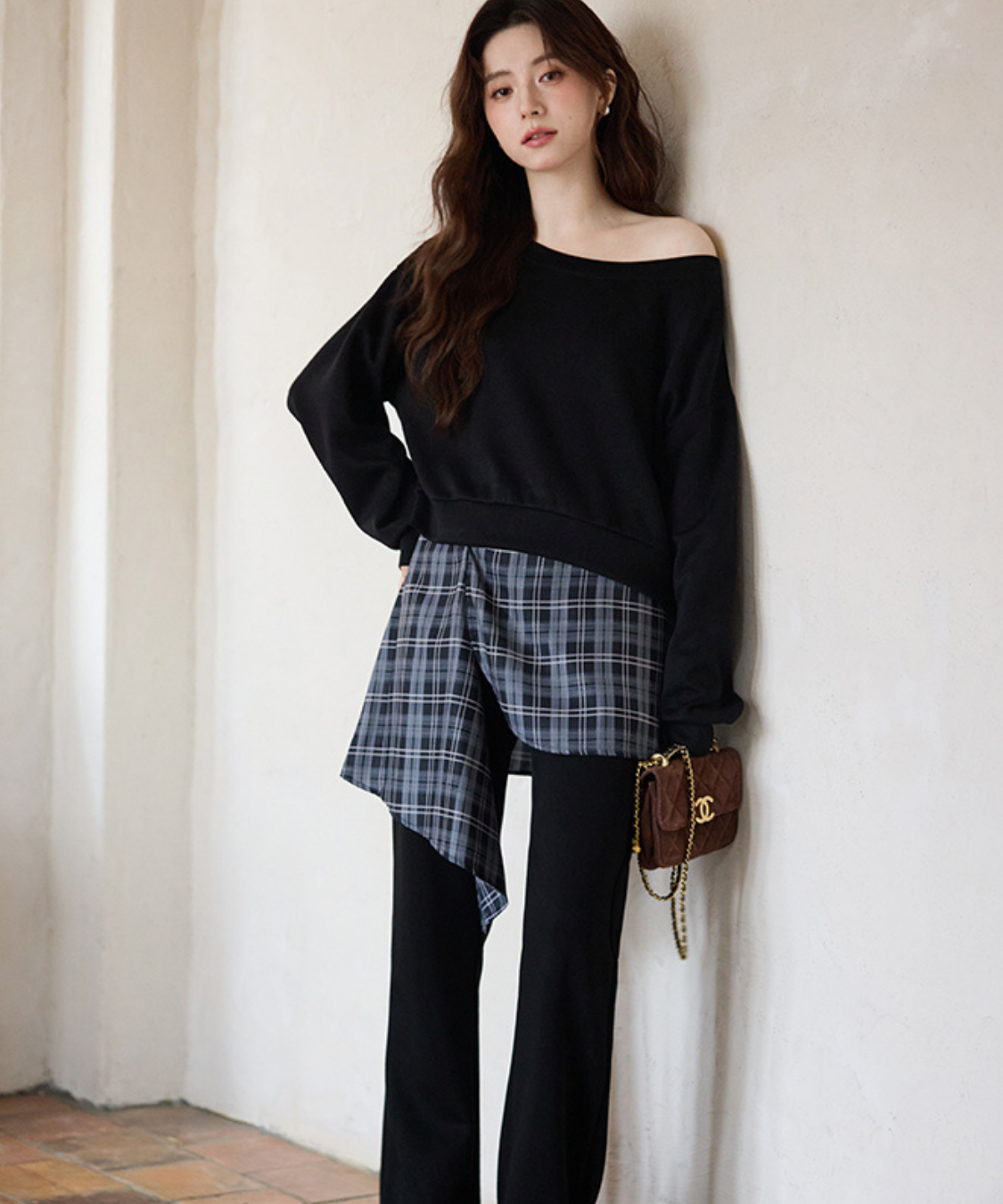 こなれ感のあるオフショルトップスと、チェックレイヤードが目を惹くパンツのセットです。