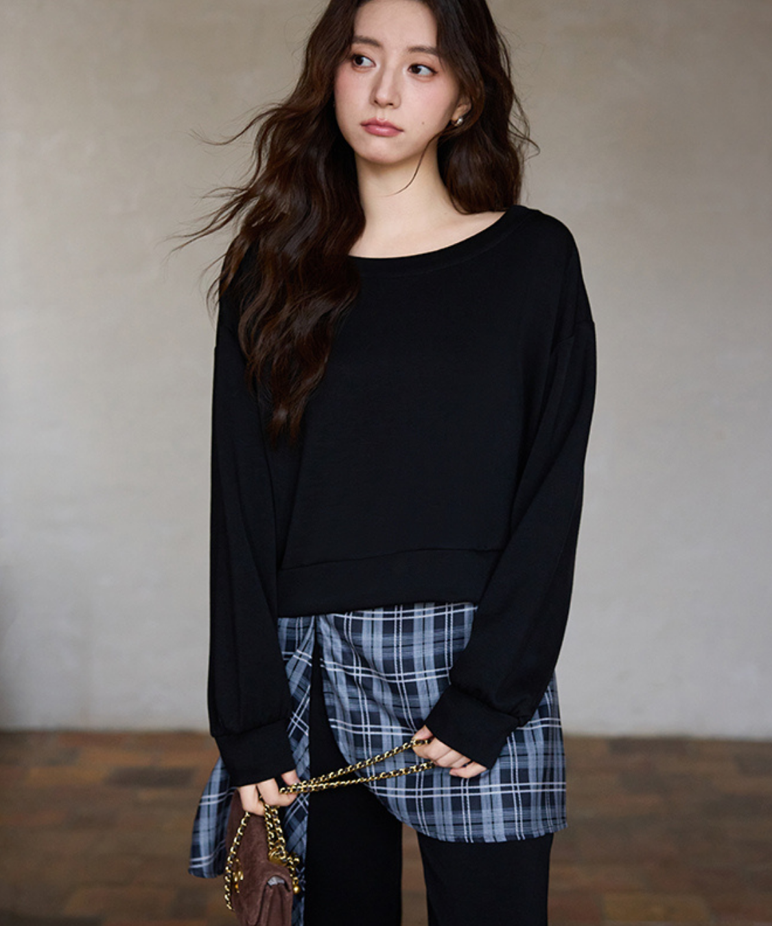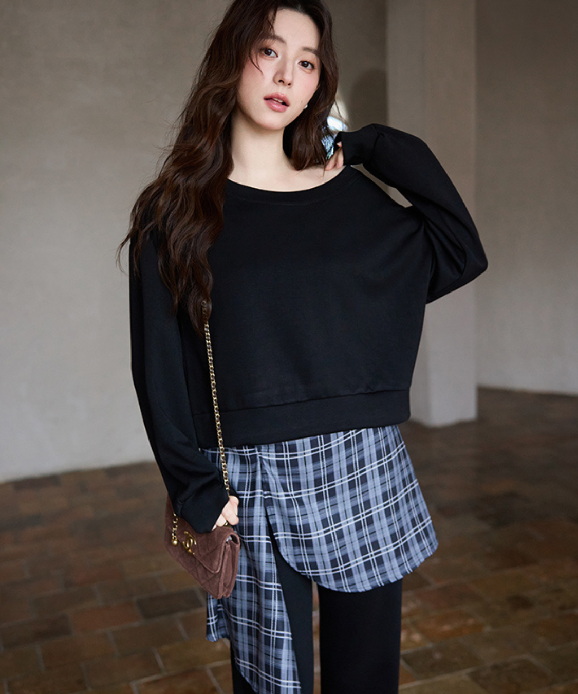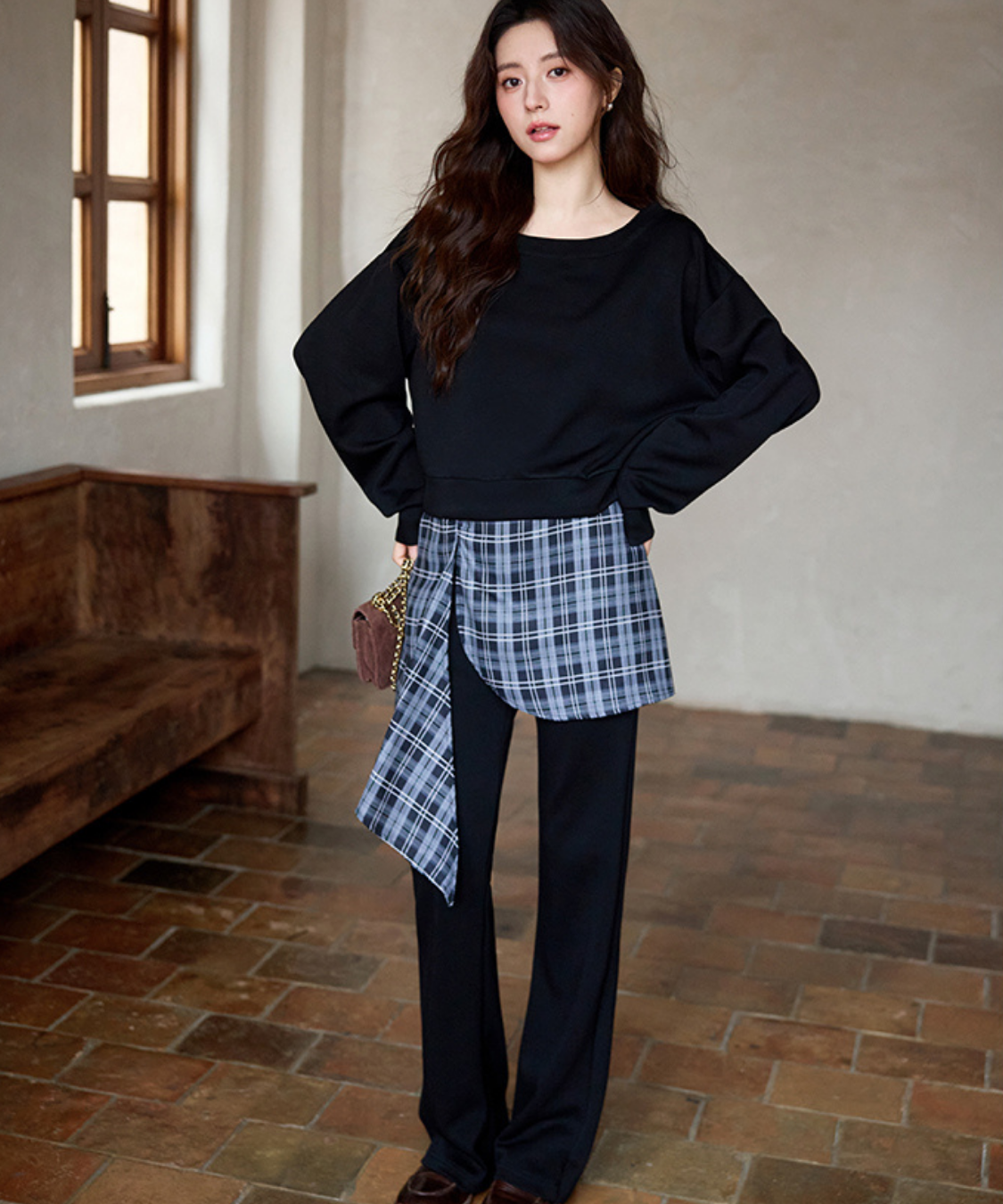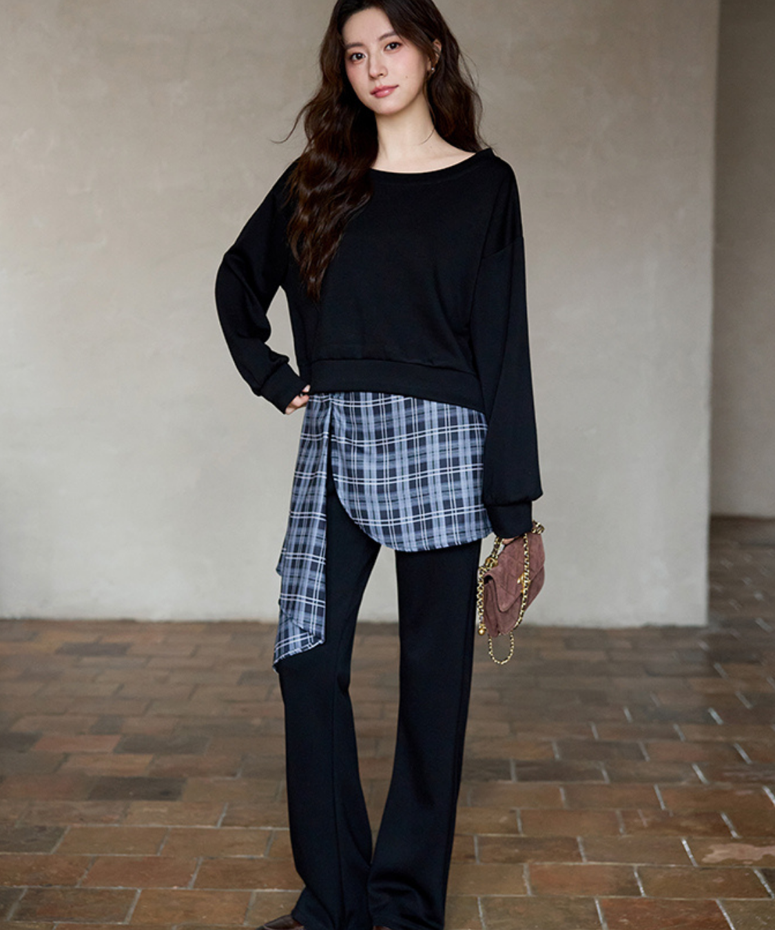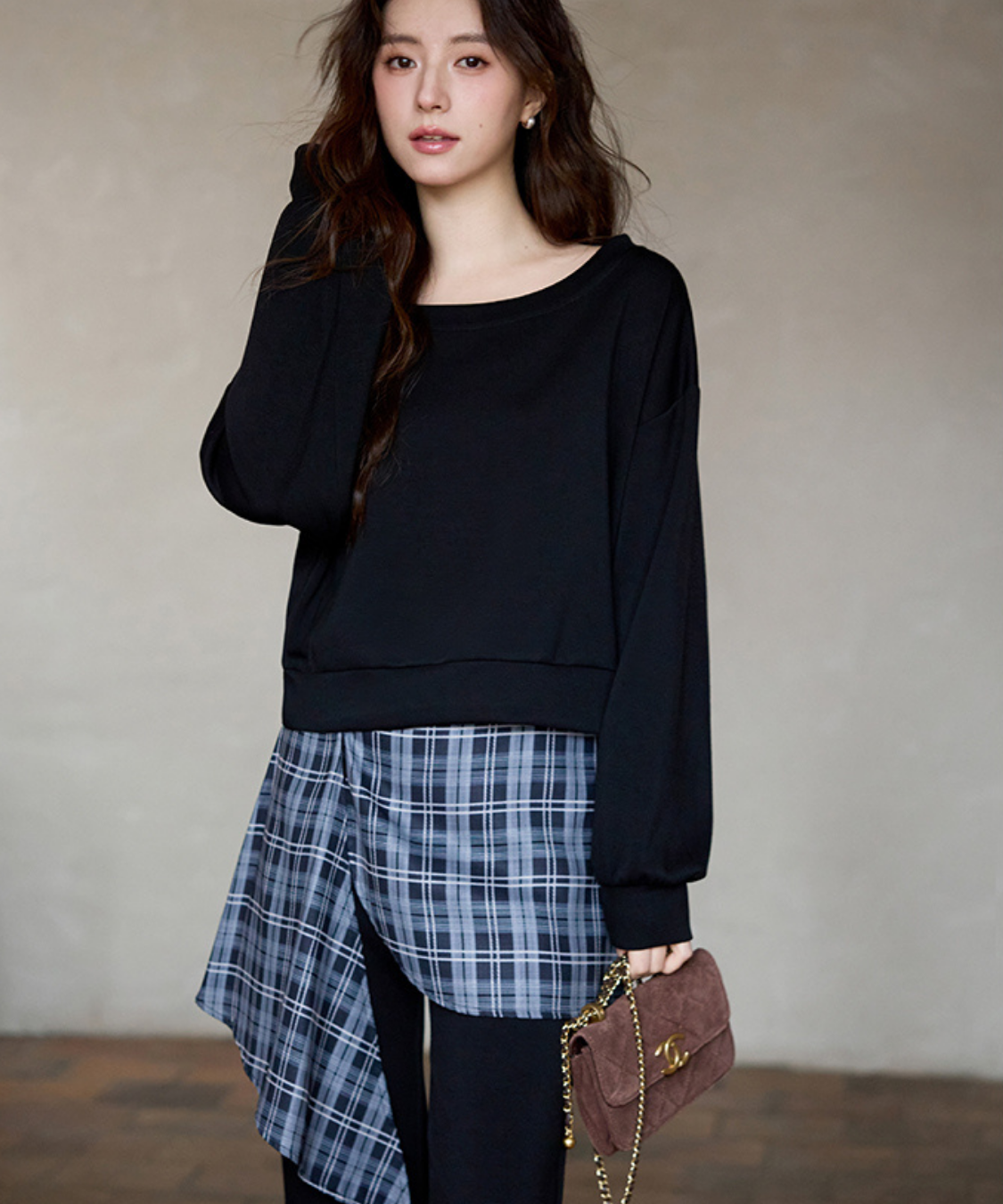 こなれ感のあるオフショルトップスと、チェックレイヤードが目を惹くパンツのセットです。