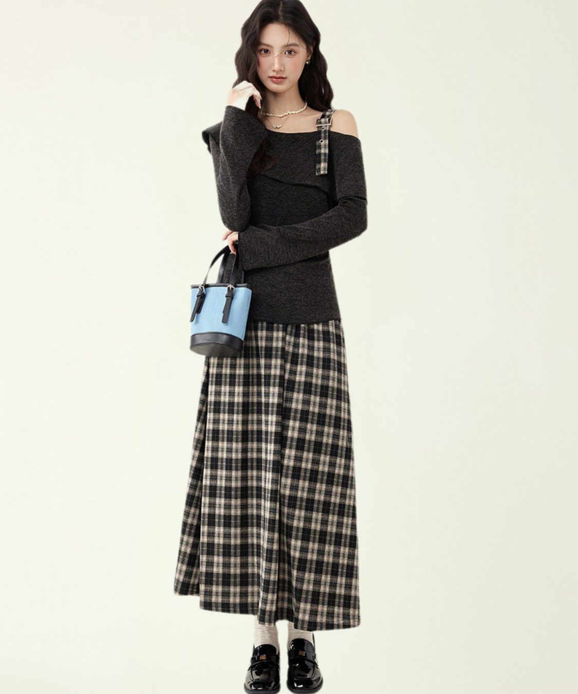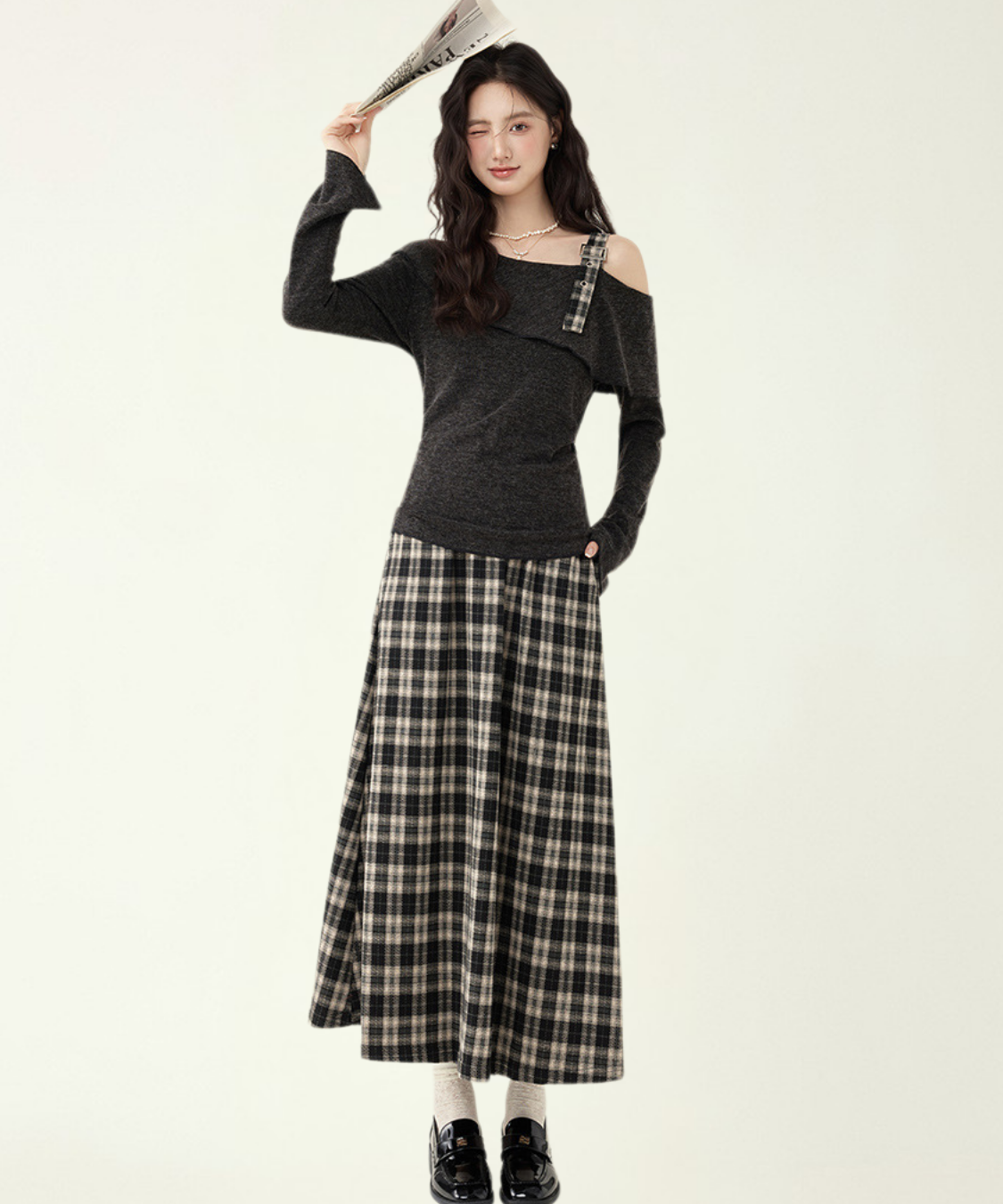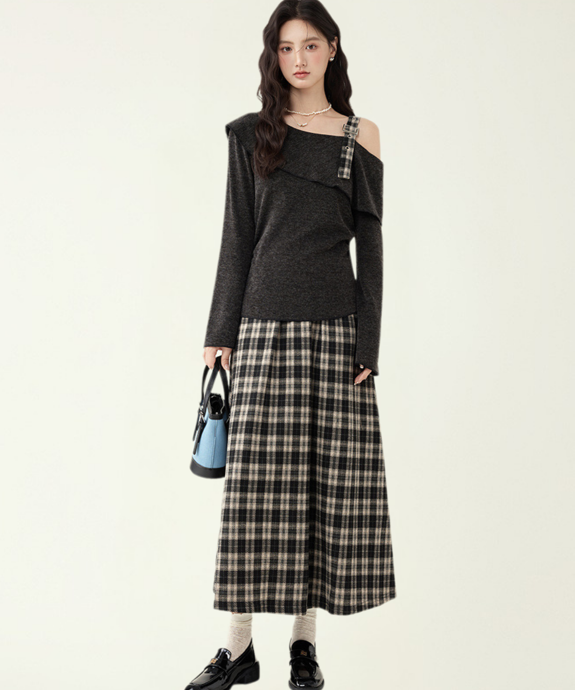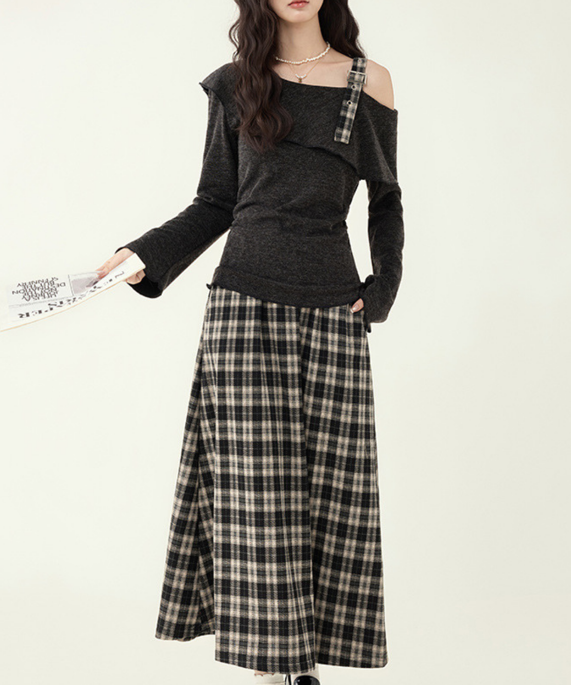 アシンメトリーボートネックトップス+チェックフレアスカート 2点セット