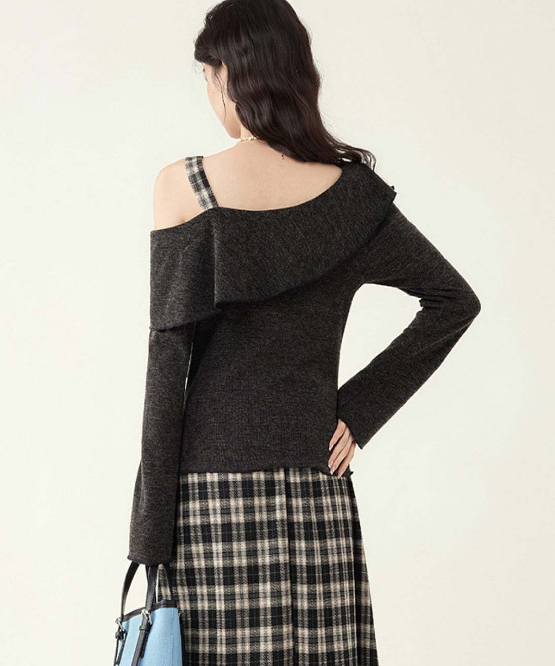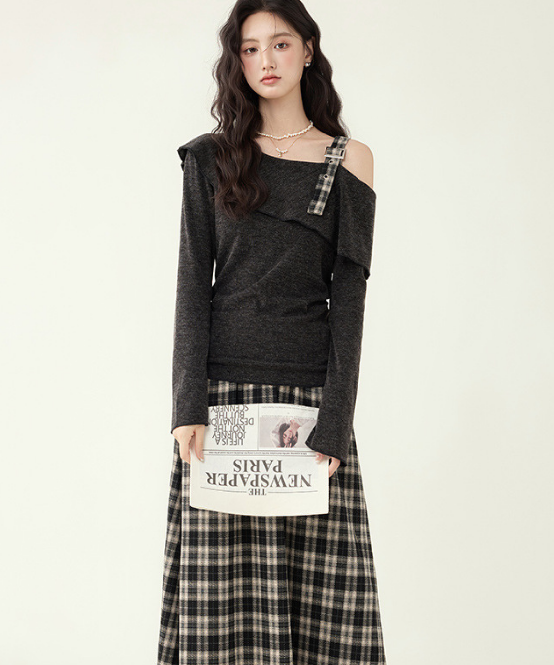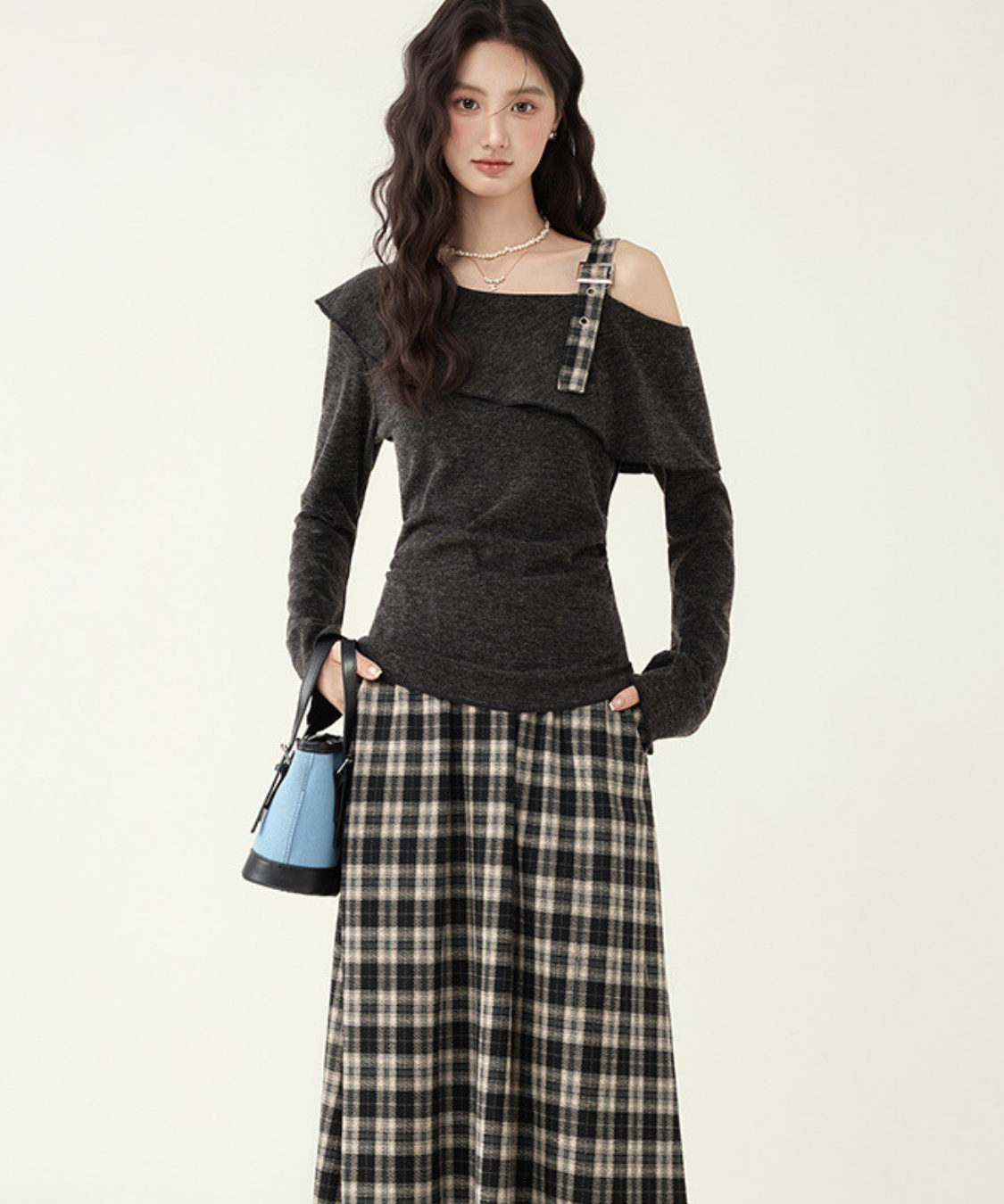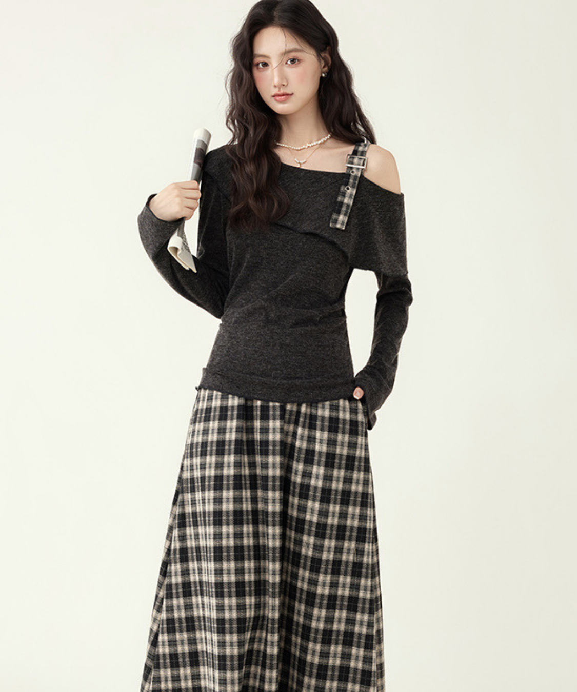 アシンメトリーボートネックトップス+チェックフレアスカート 2点セット