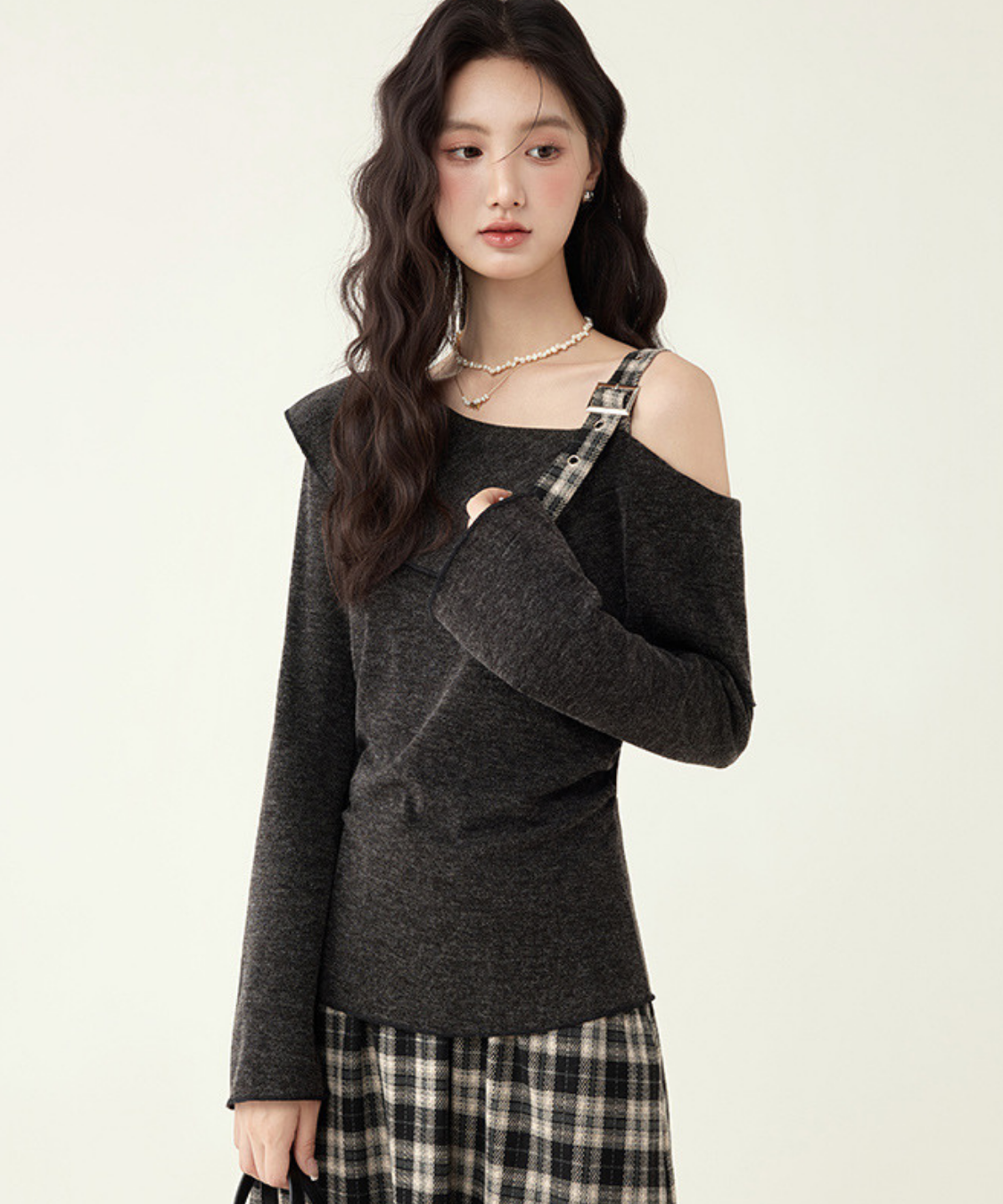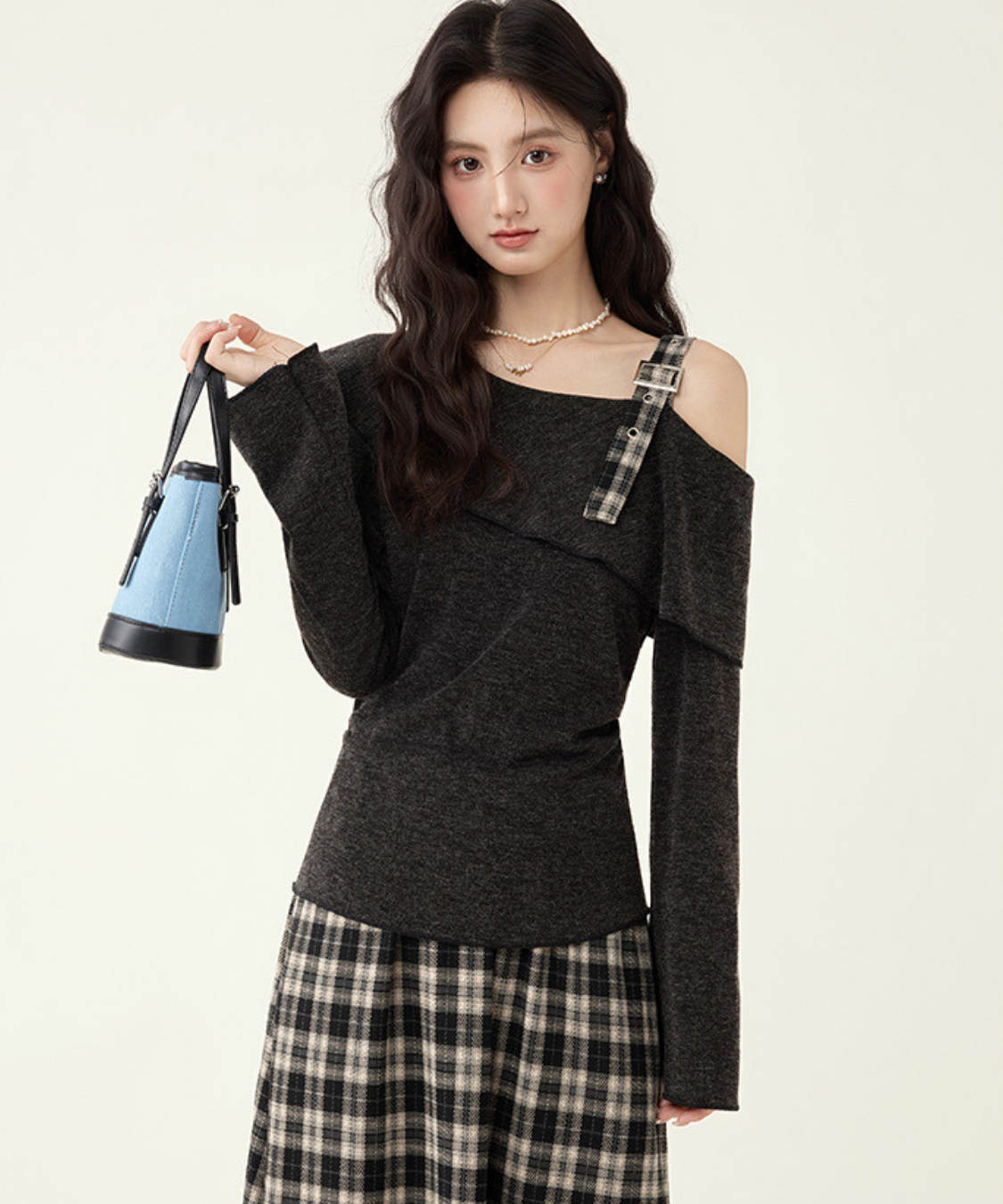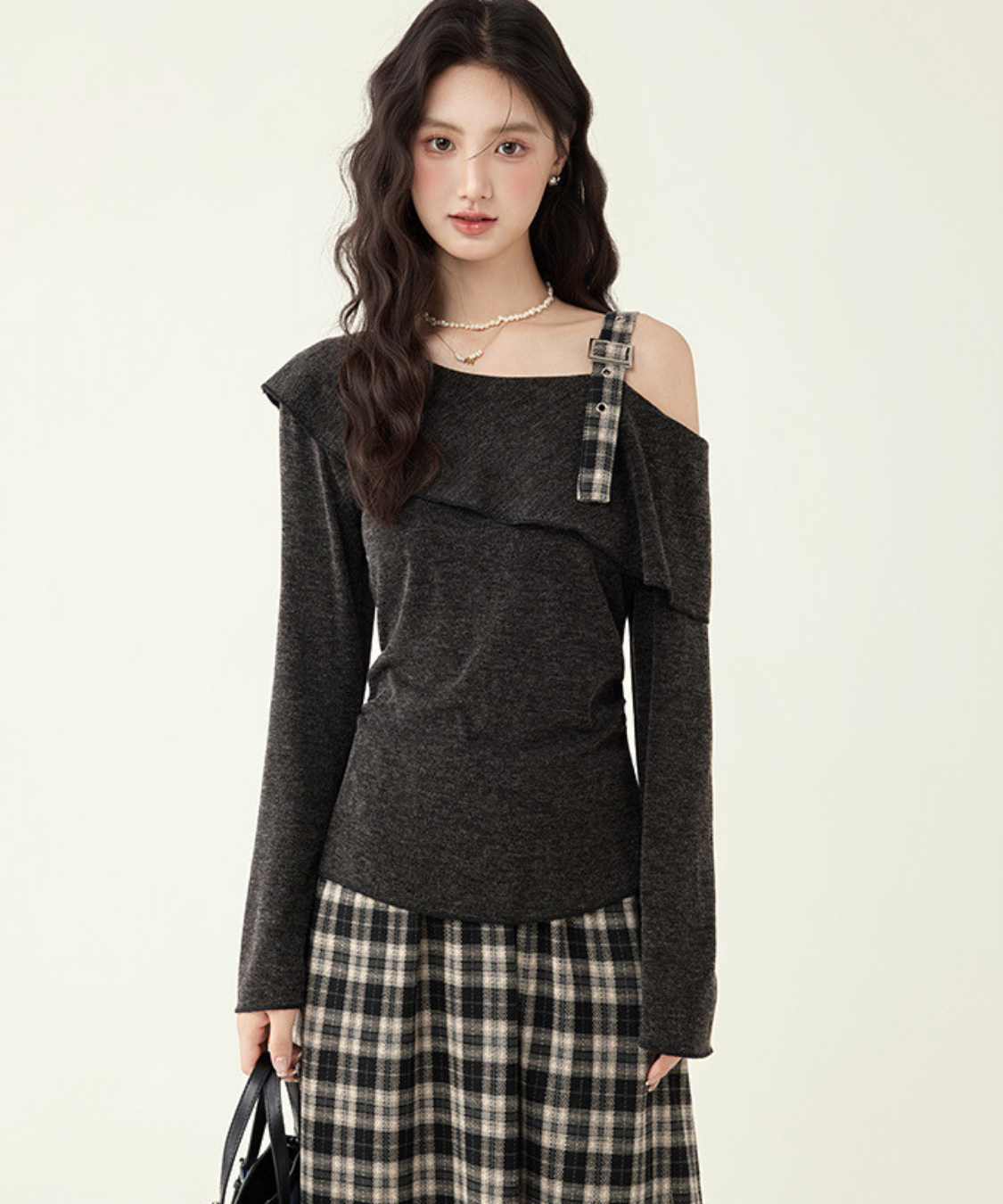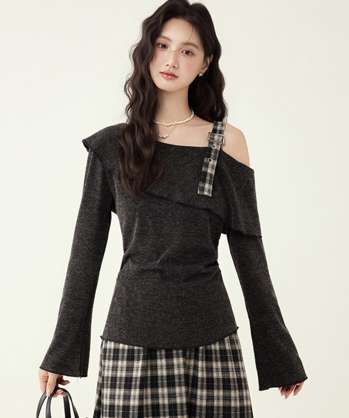 アシンメトリーボートネックトップス+チェックフレアスカート 2点セット