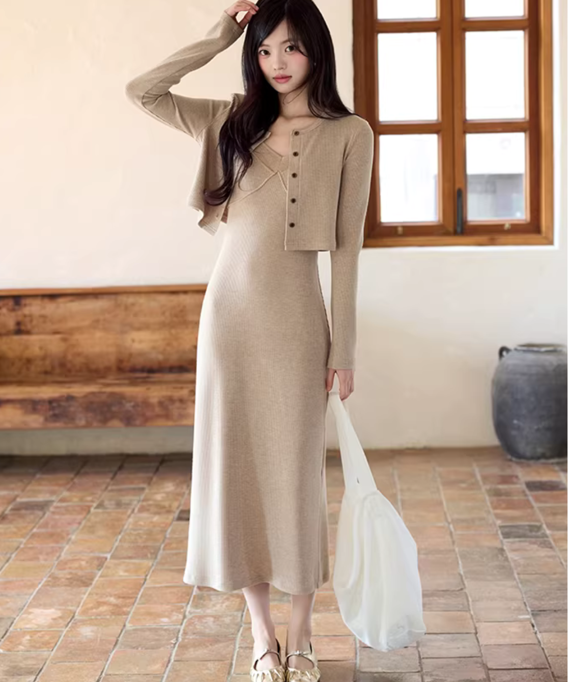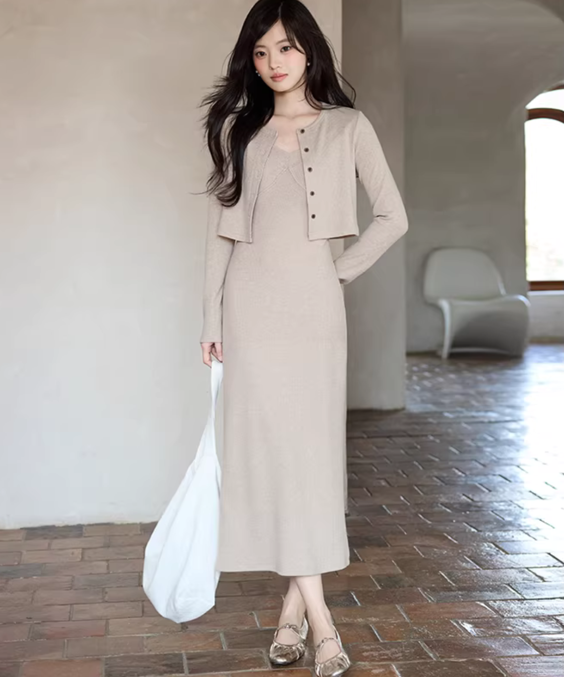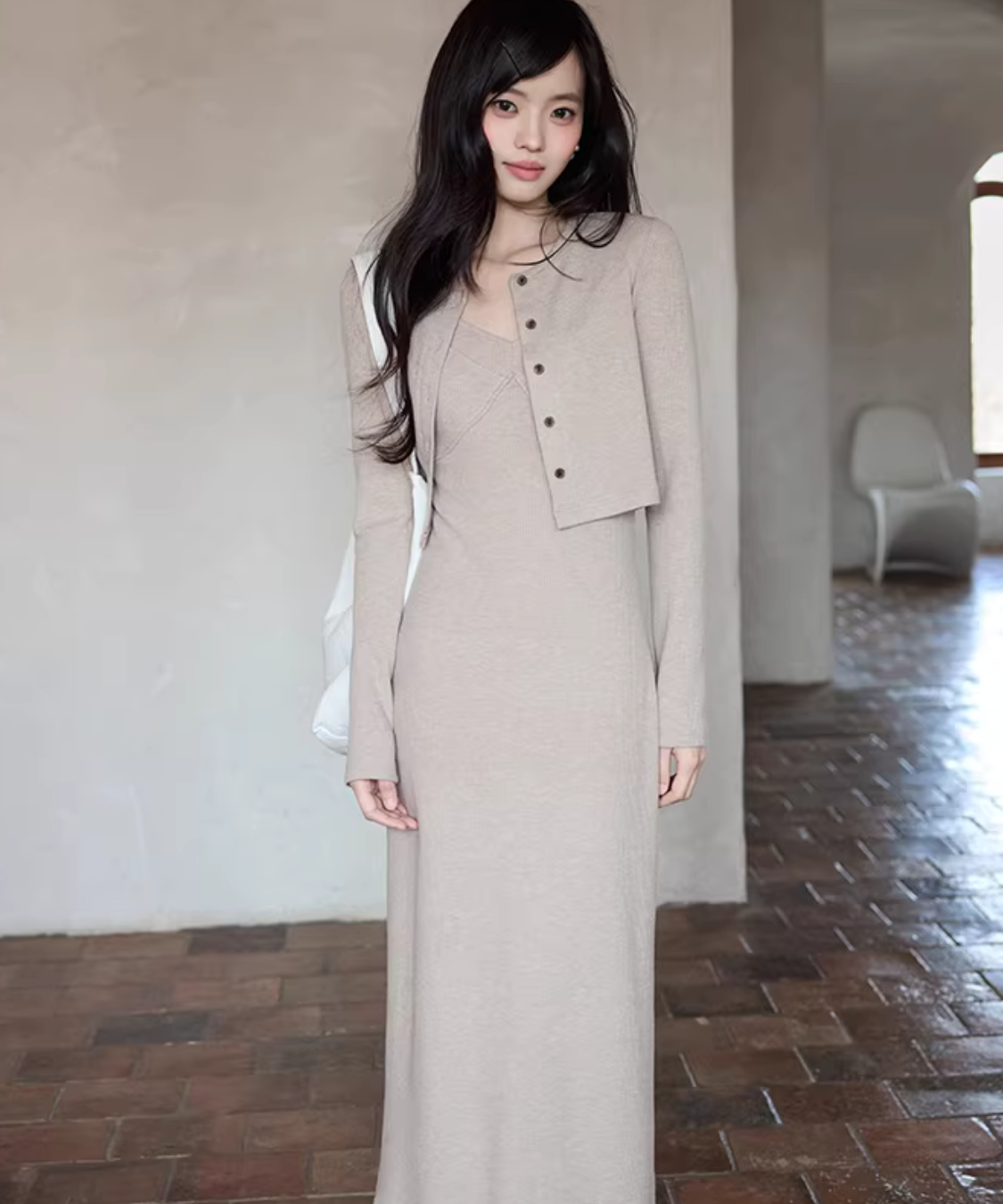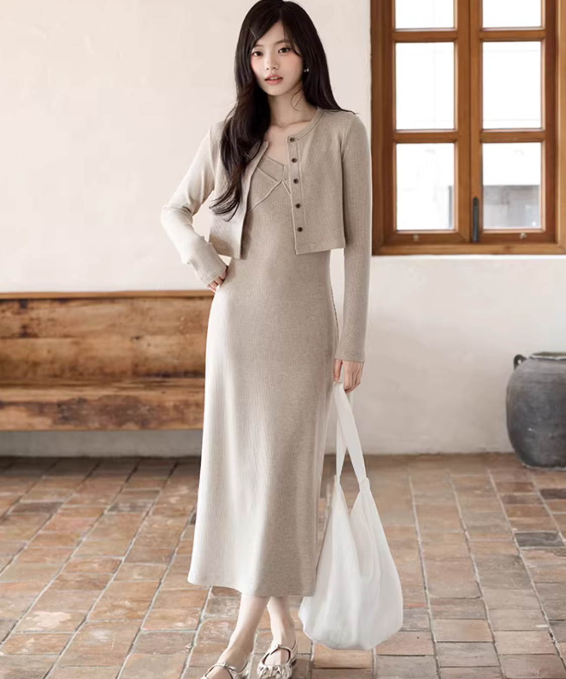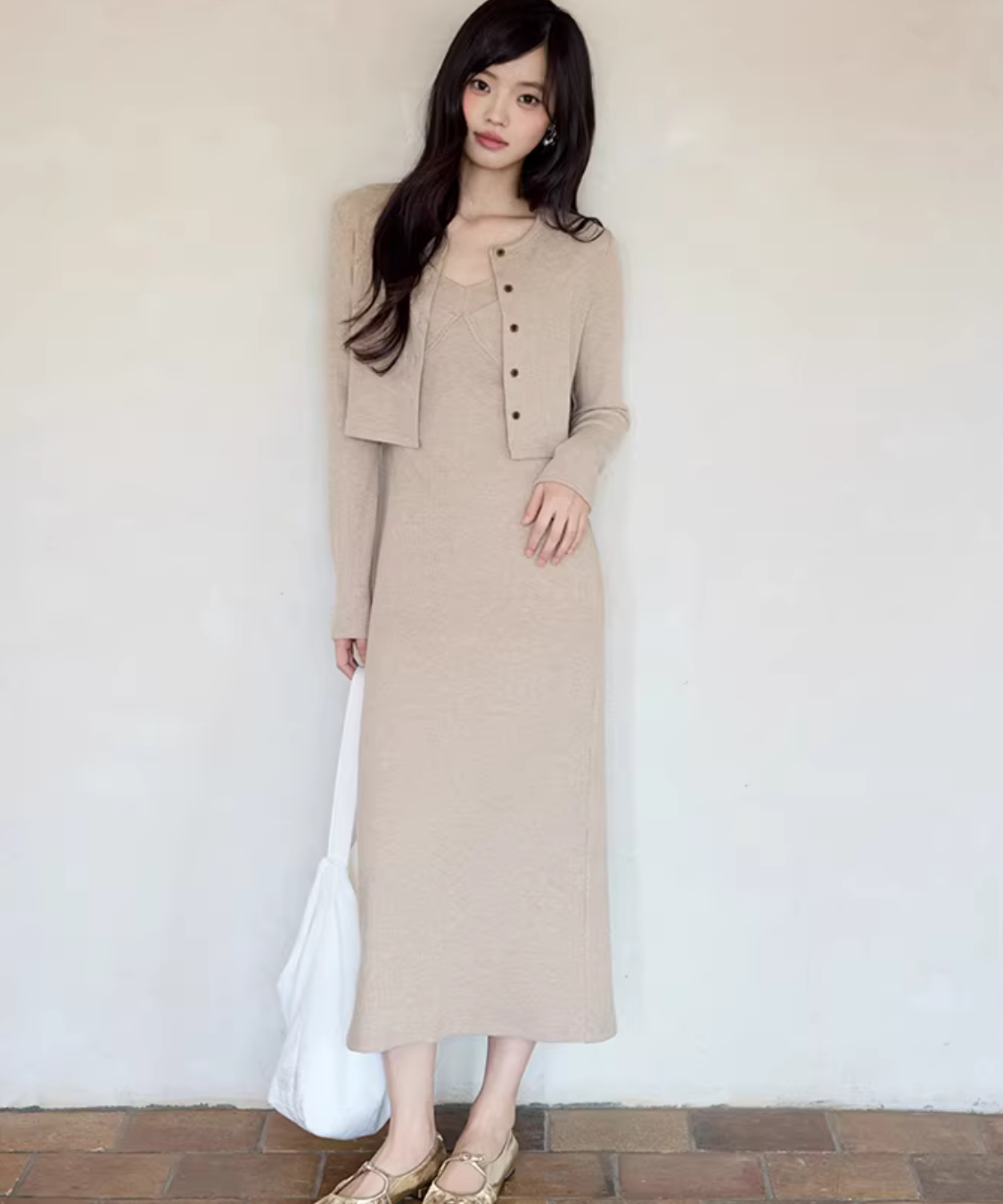 華奢見えするニットキャミワンピにショートカーデを重ねた、簡単に完成するセットアイテムです。