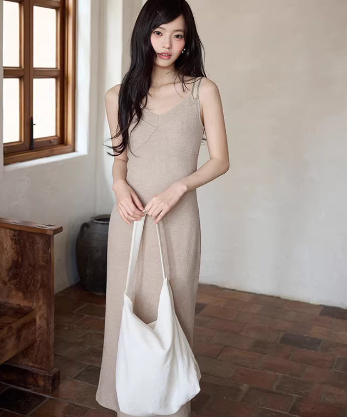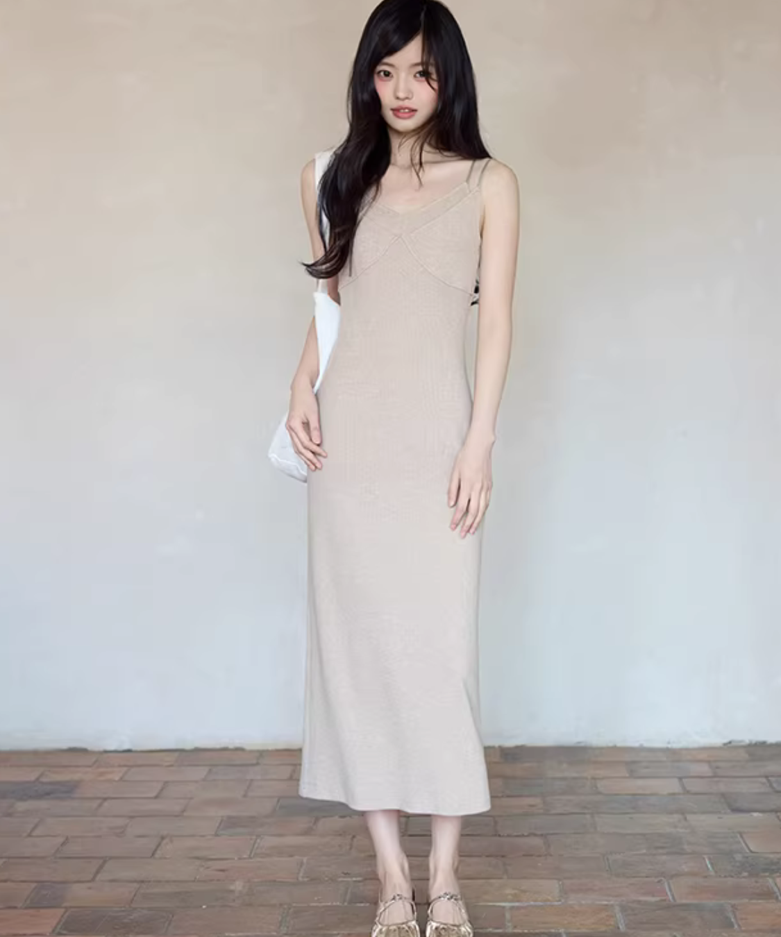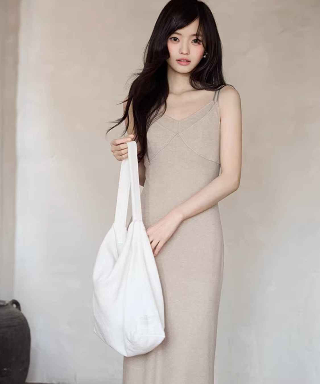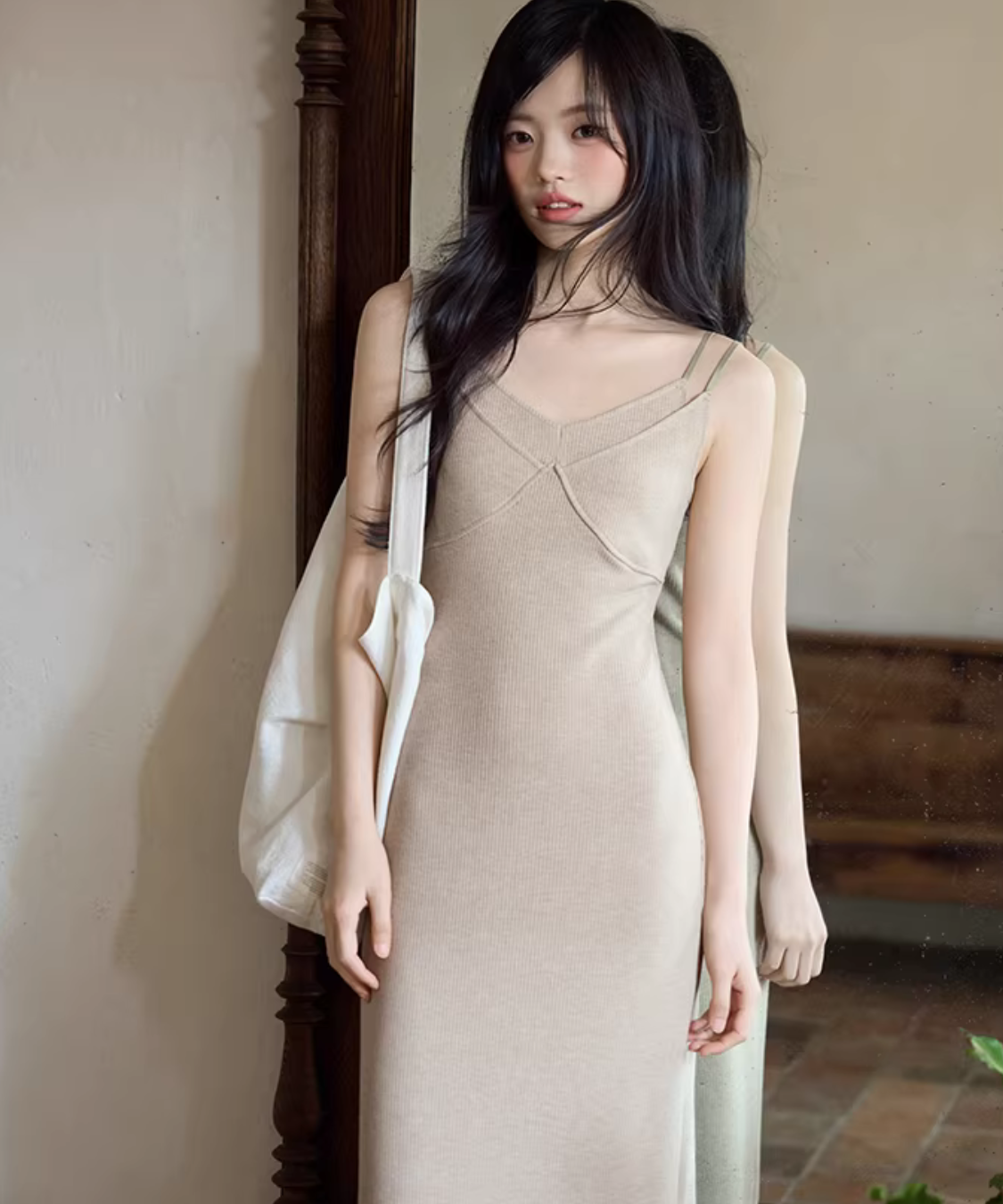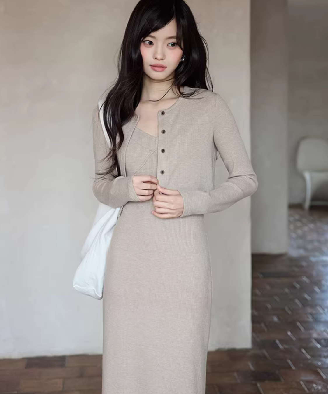 華奢見えするニットキャミワンピにショートカーデを重ねた、簡単に完成するセットアイテムです。