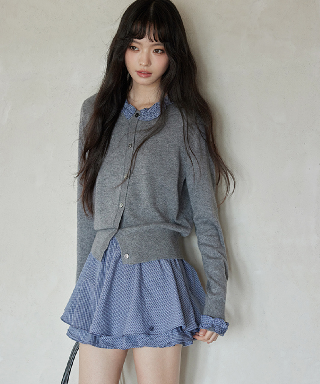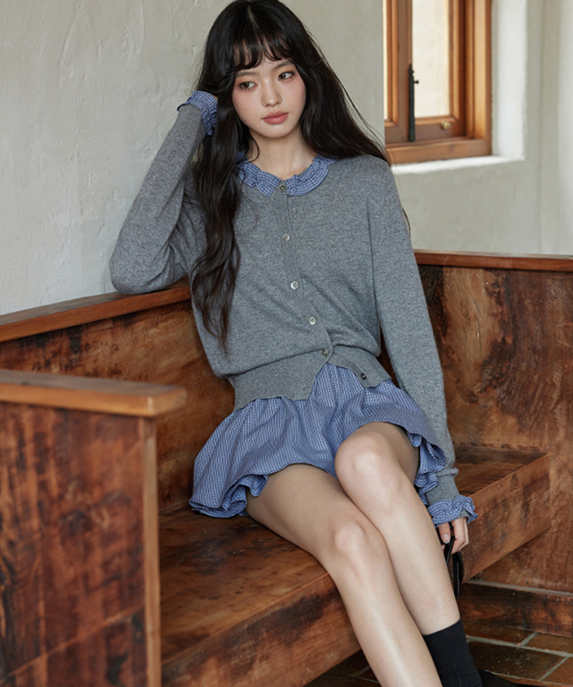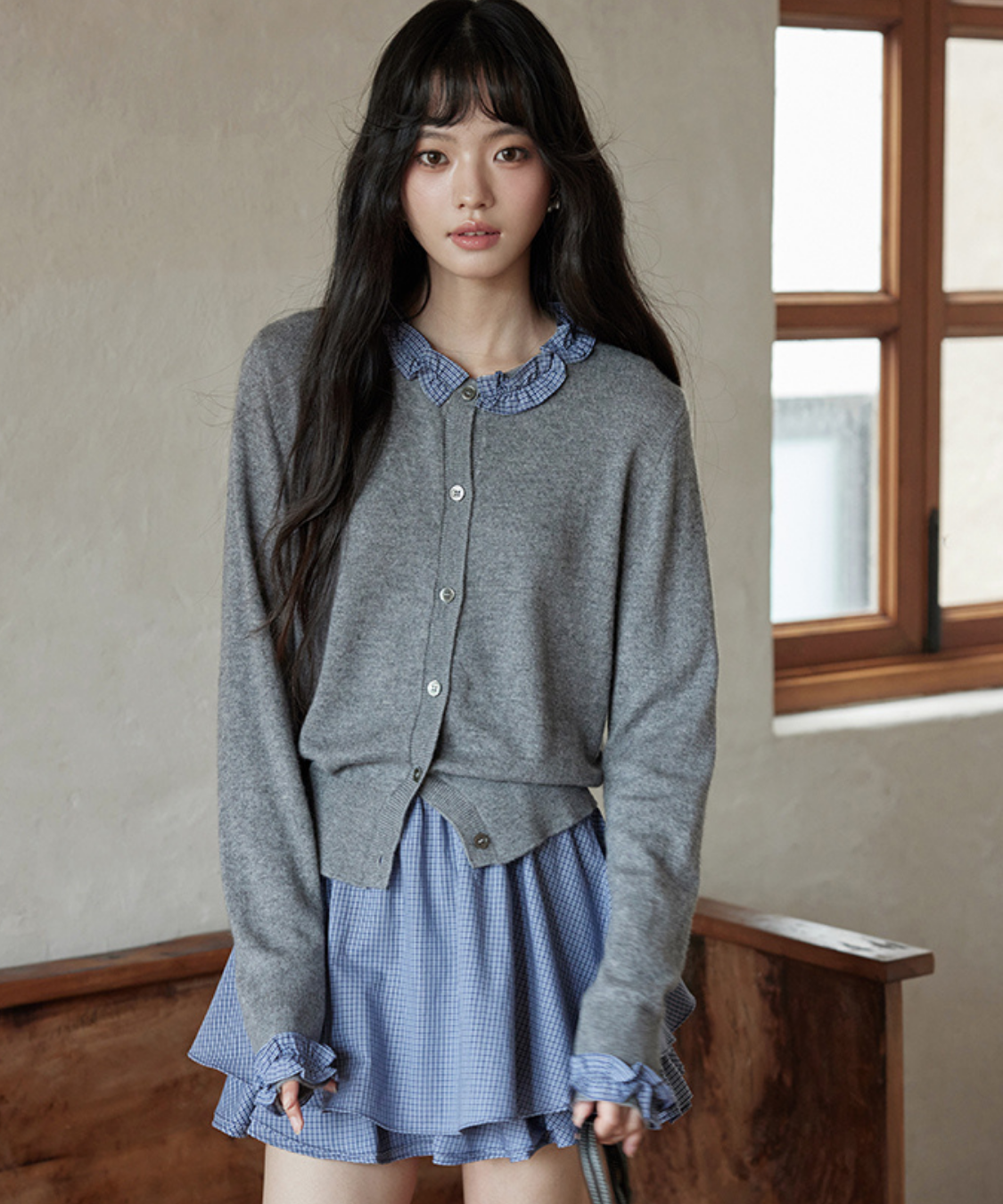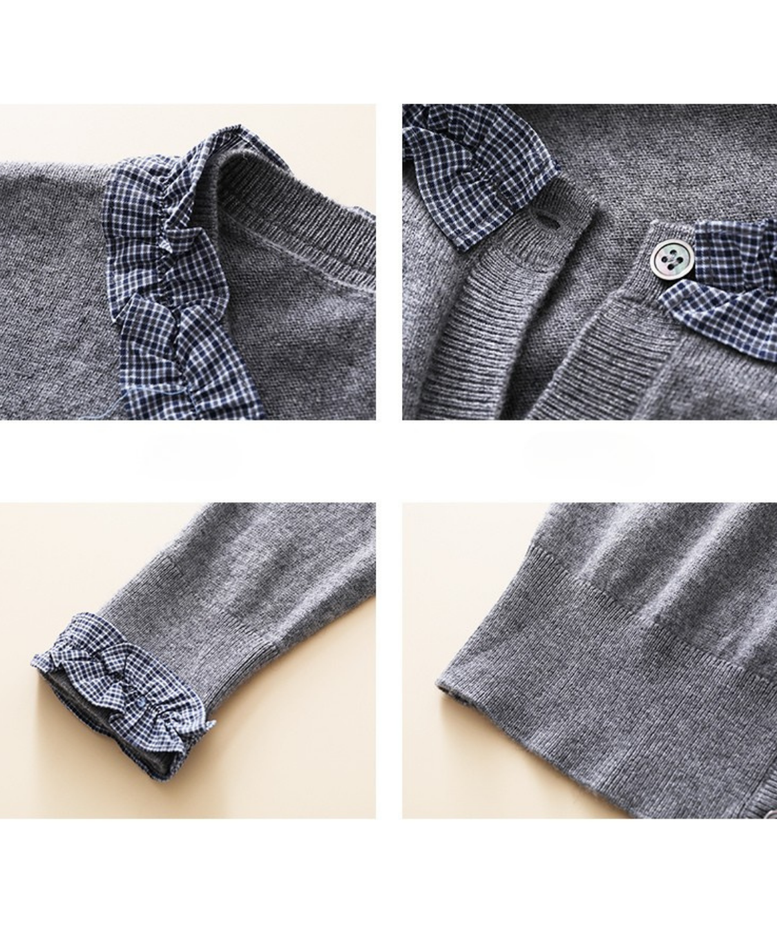 襟元と袖口のチェック柄フリルが可愛らしいアクセントになったカーディガンです。