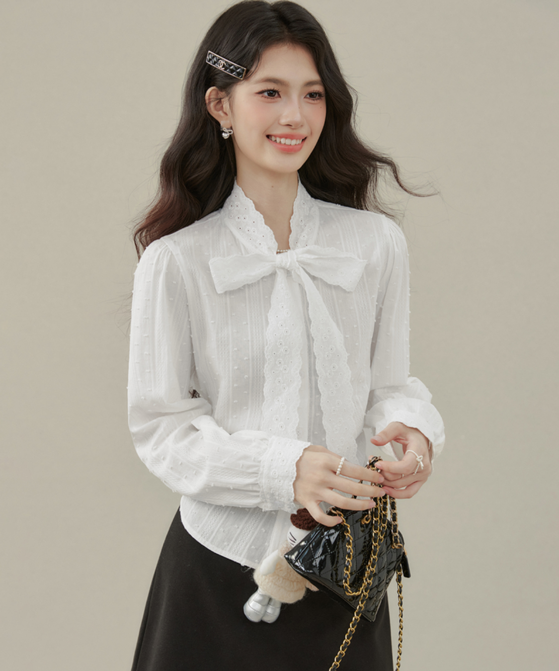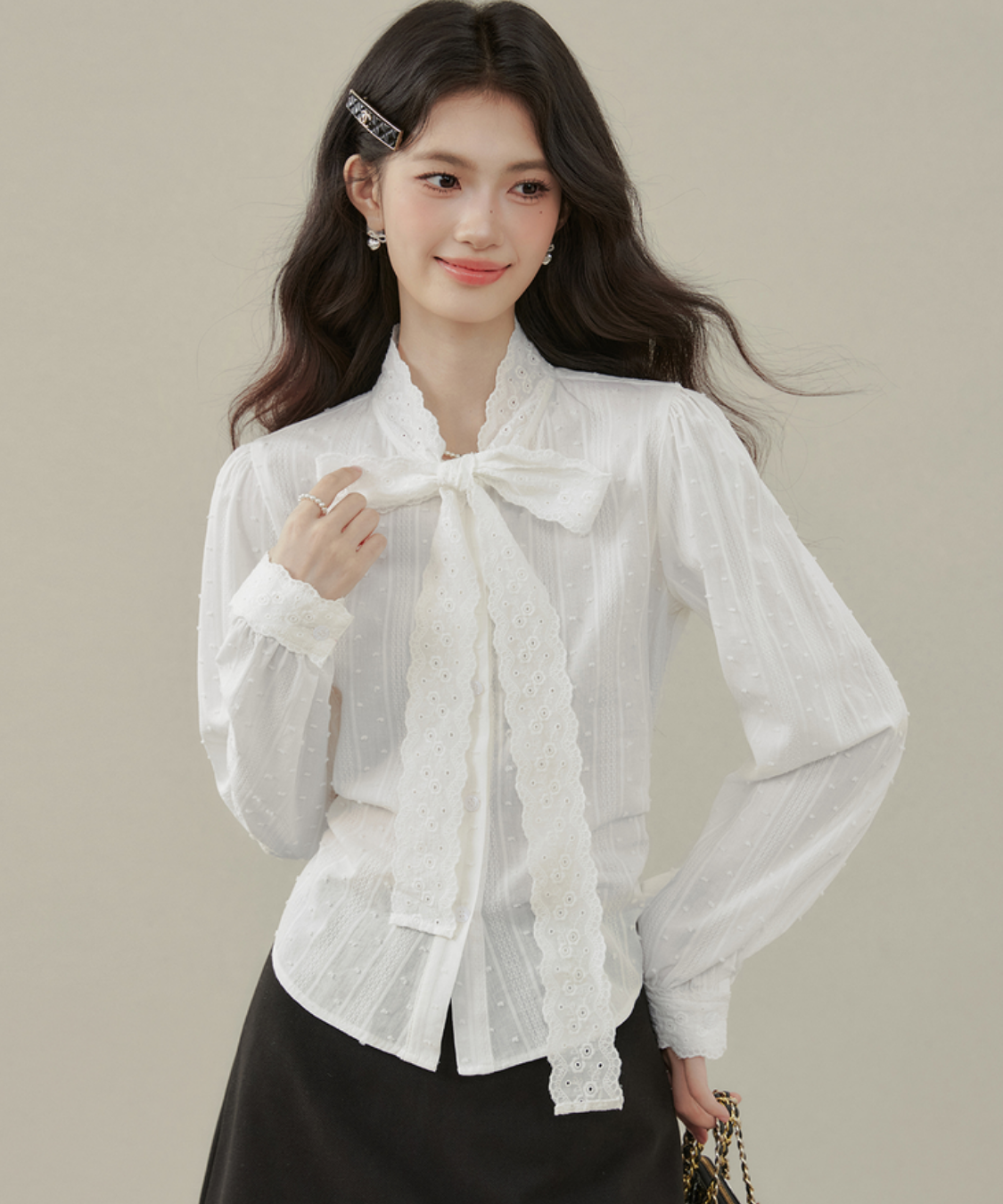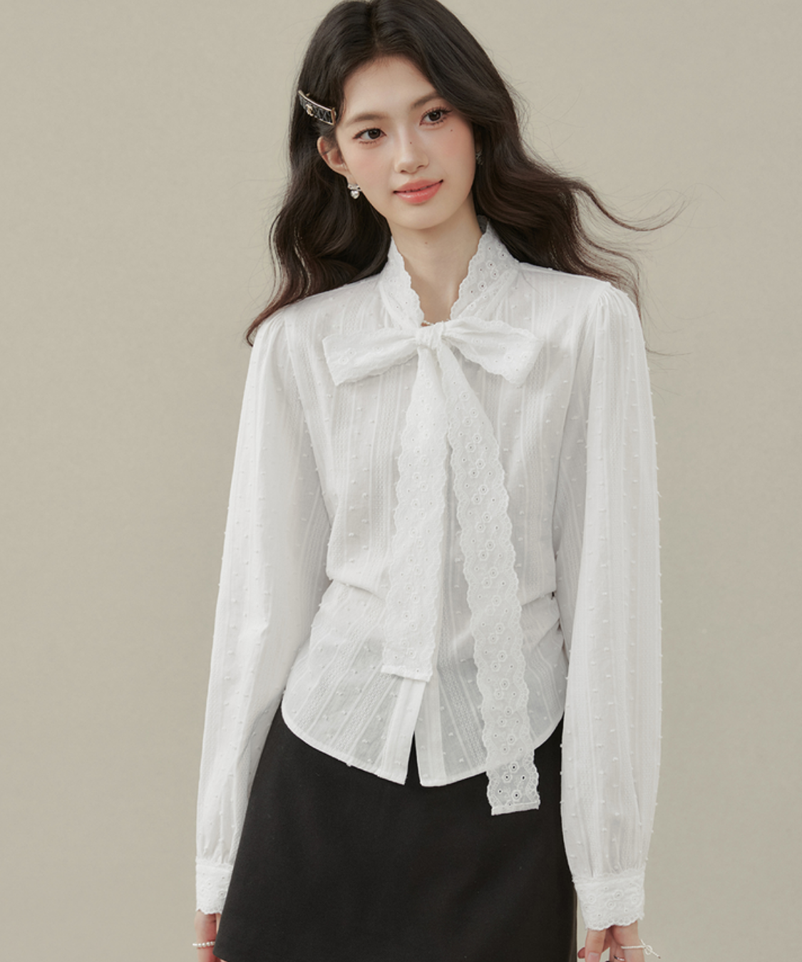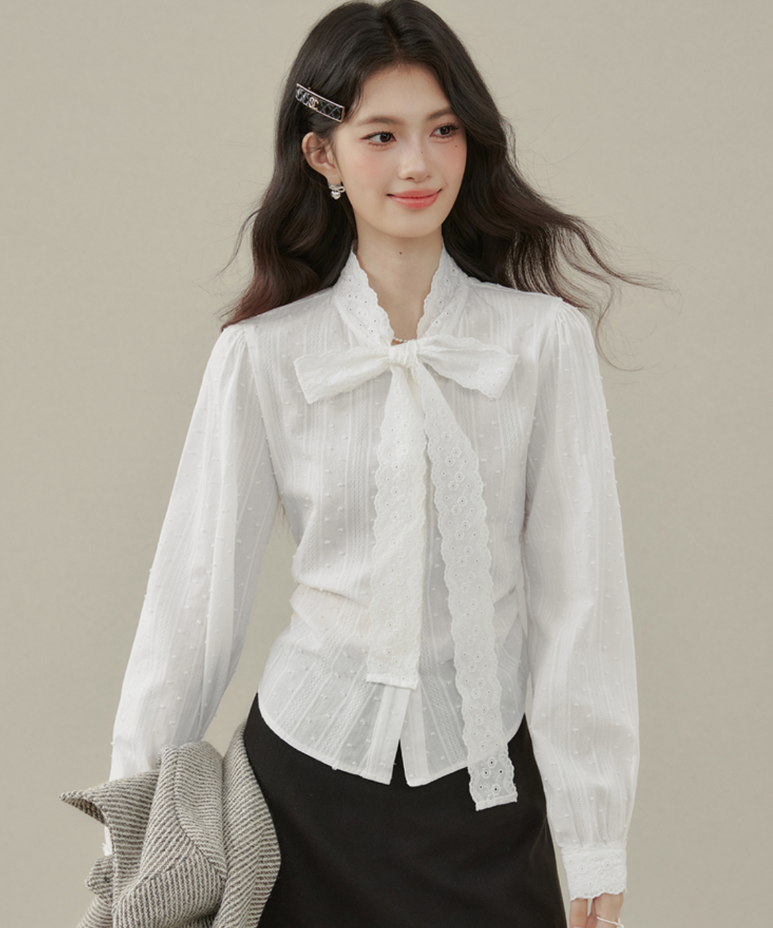 繊細なドビー織りとレースボウタイが華やかさを引き立てるクラシカルなブラウスです。