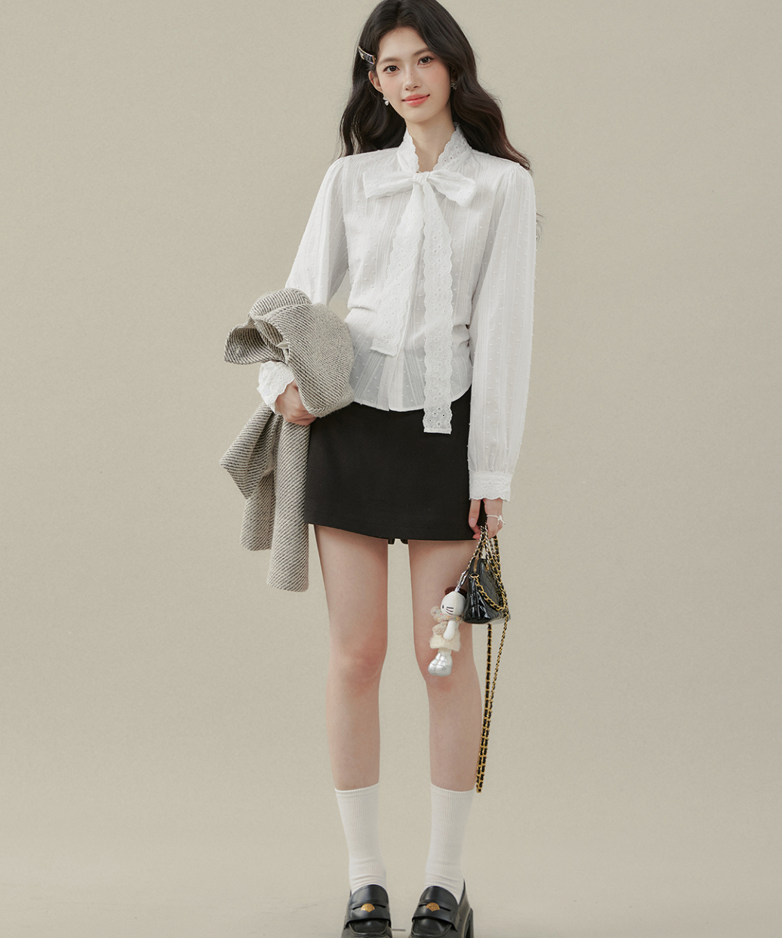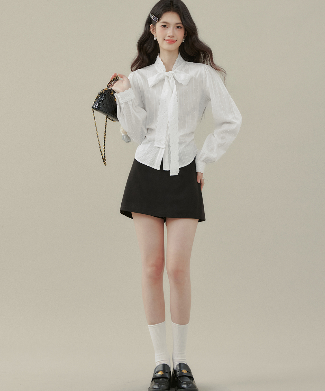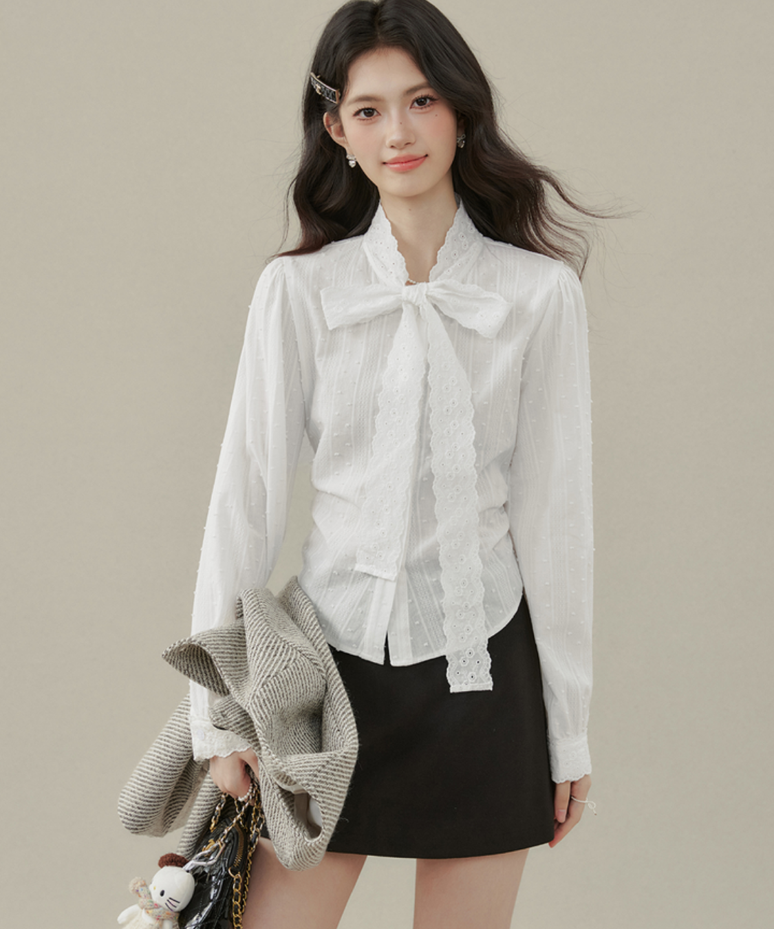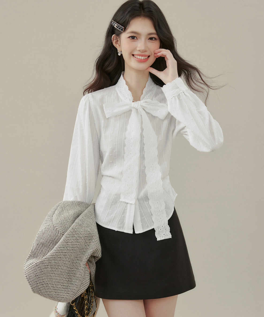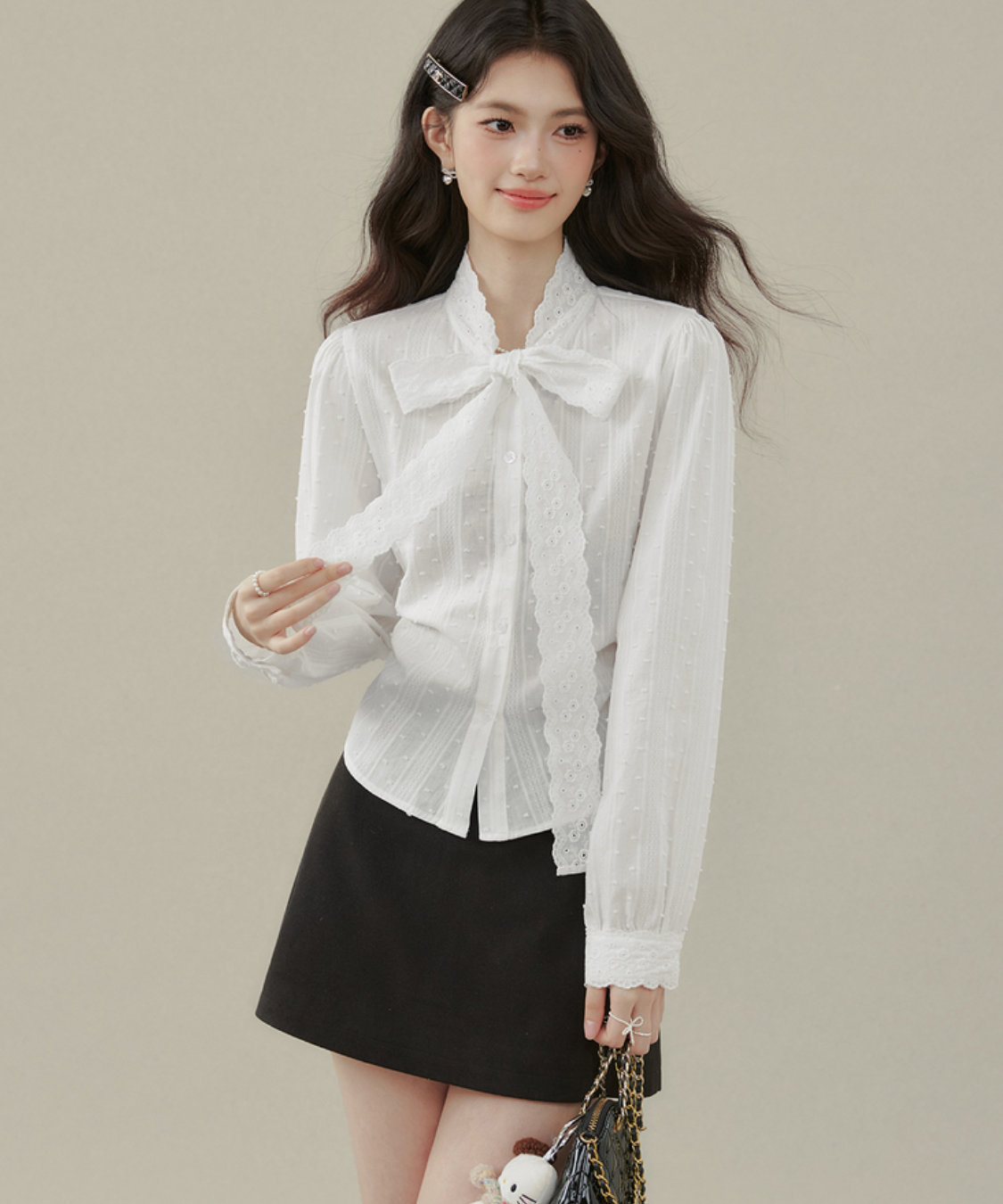 繊細なドビー織りとレースボウタイが華やかさを引き立てるクラシカルなブラウスです。