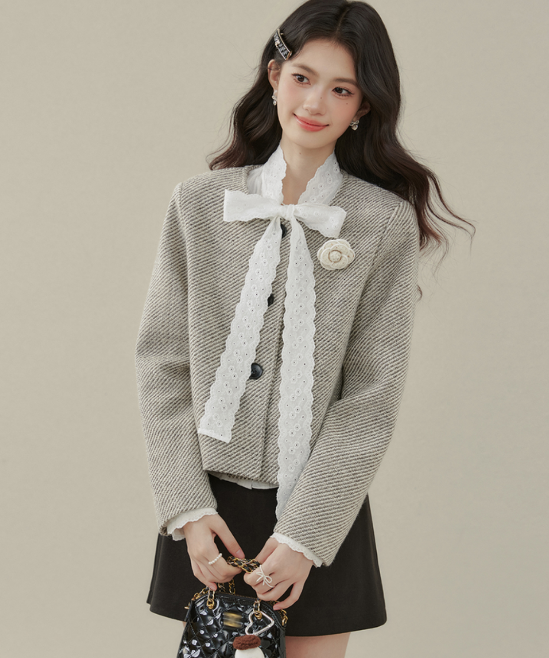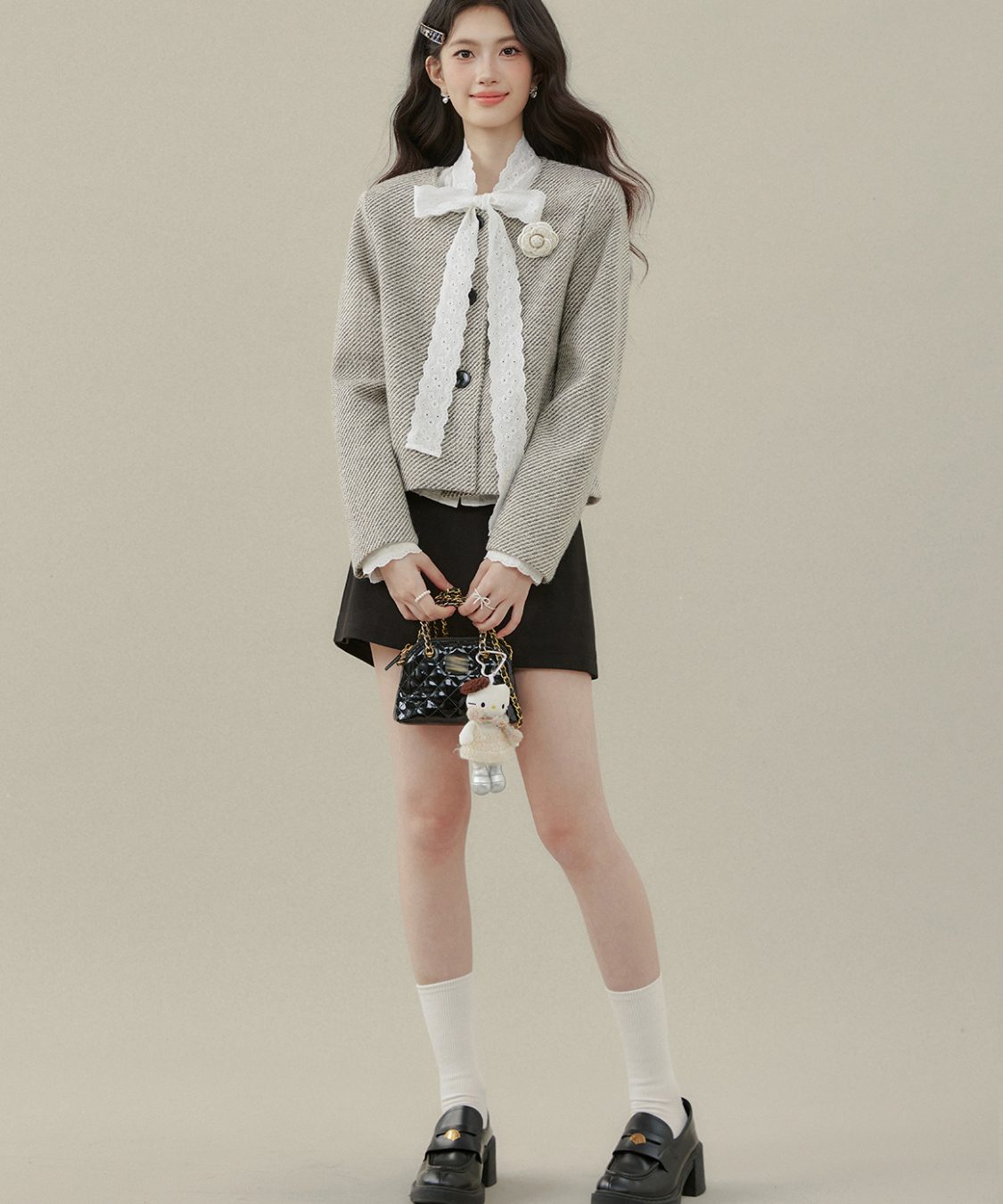 襟元や袖口にもレースをあしらい、上品でフェミニンな印象に仕上げました♡