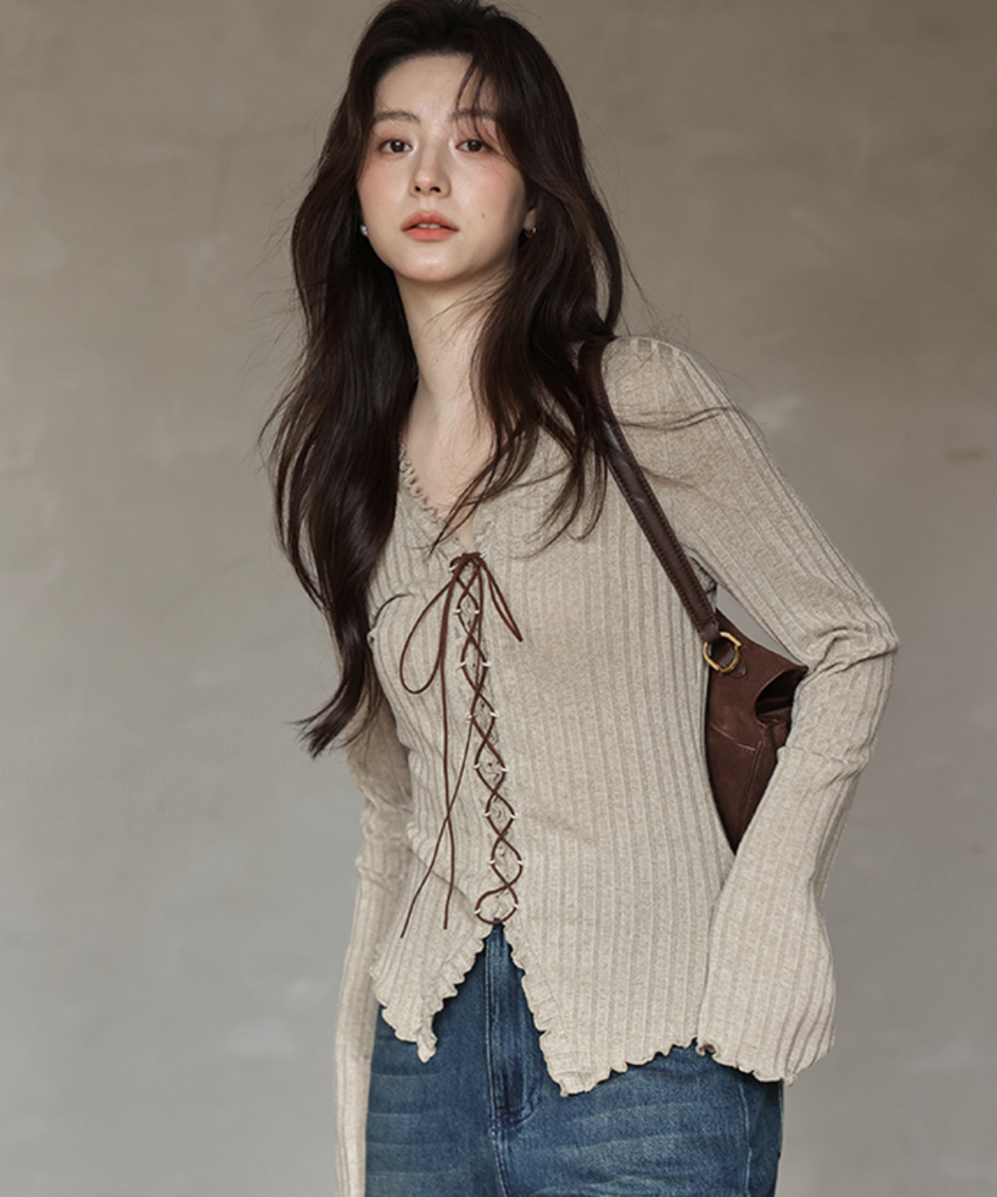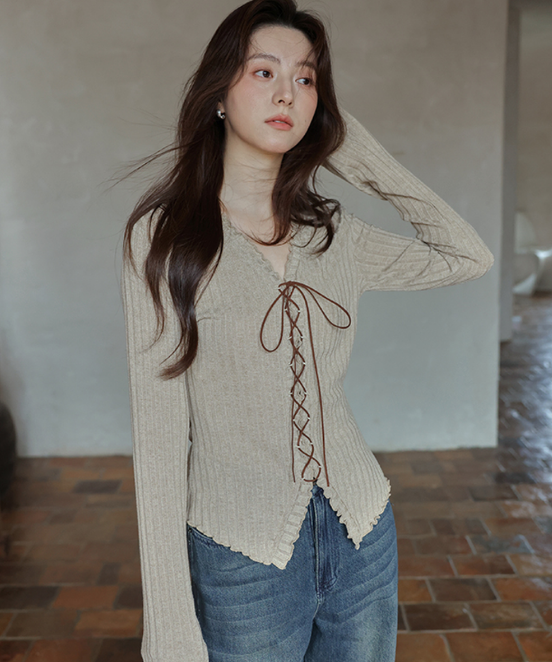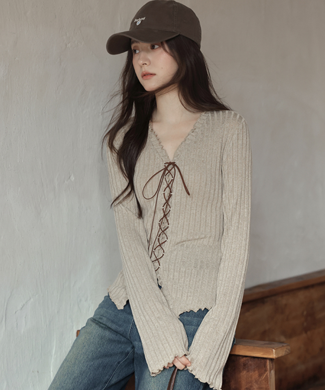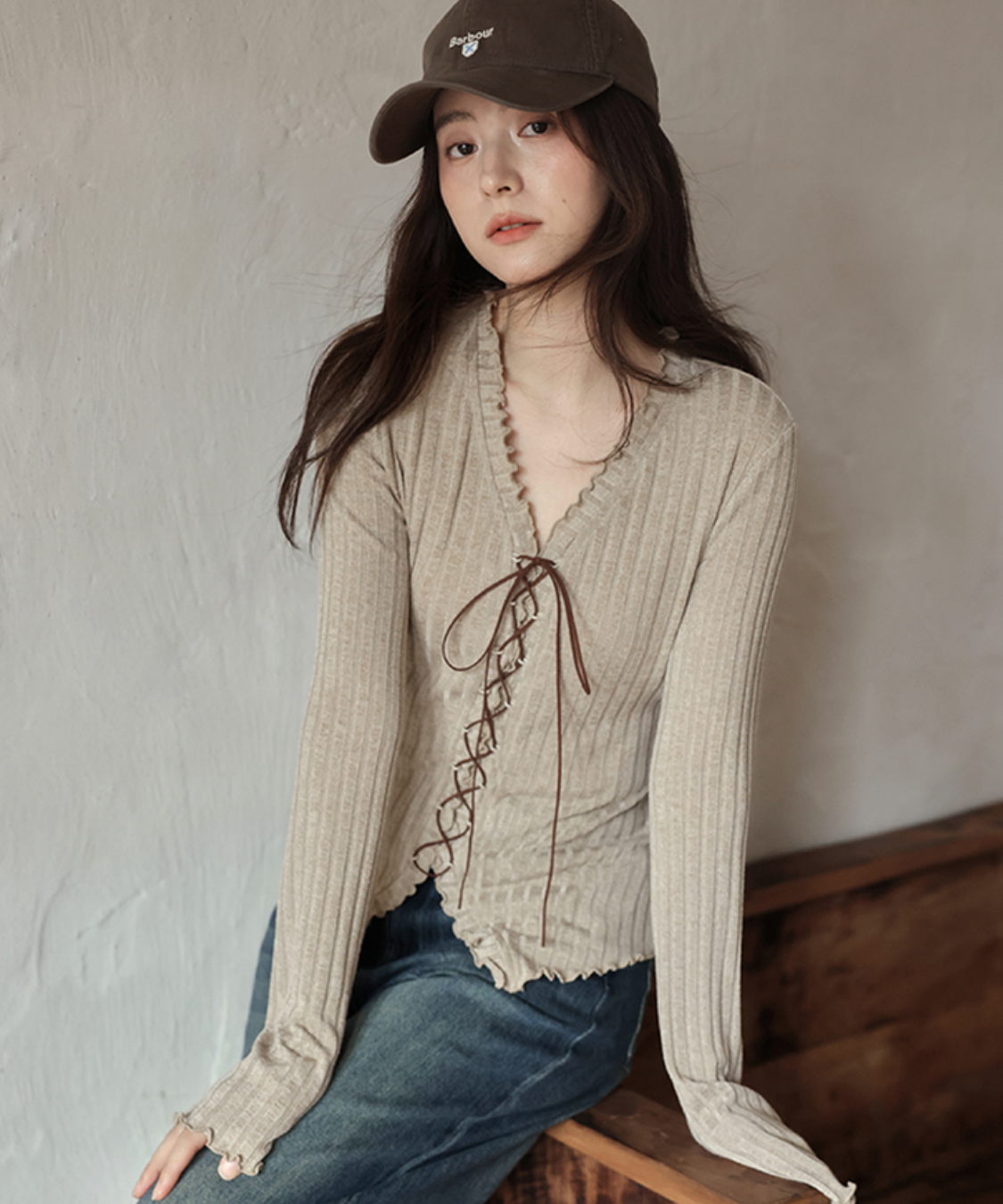 レースアップデザインが視線を引く、フェミニンムード漂うリブカットソーです。