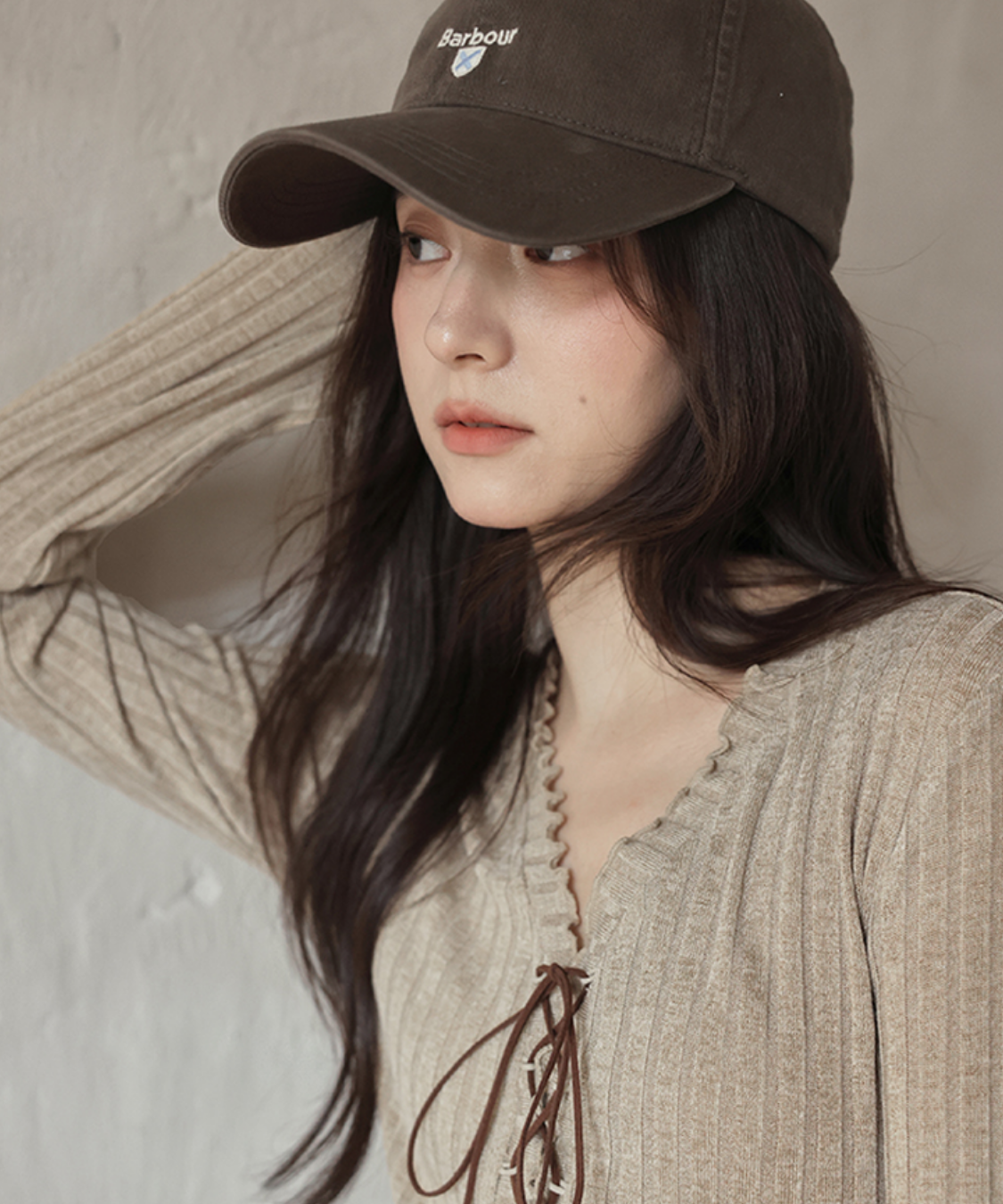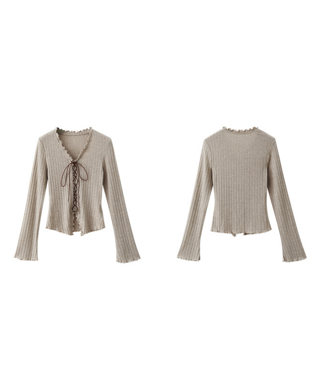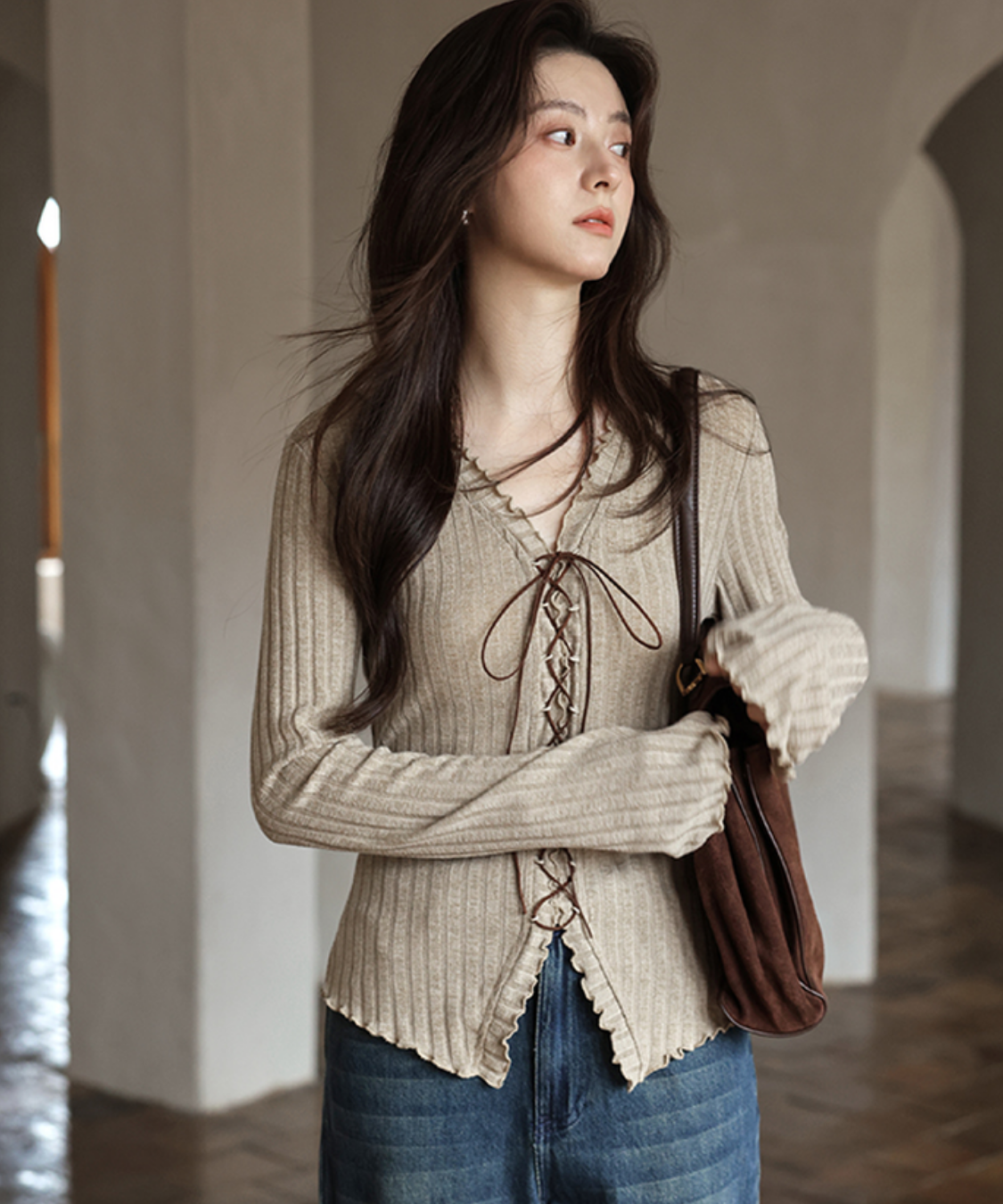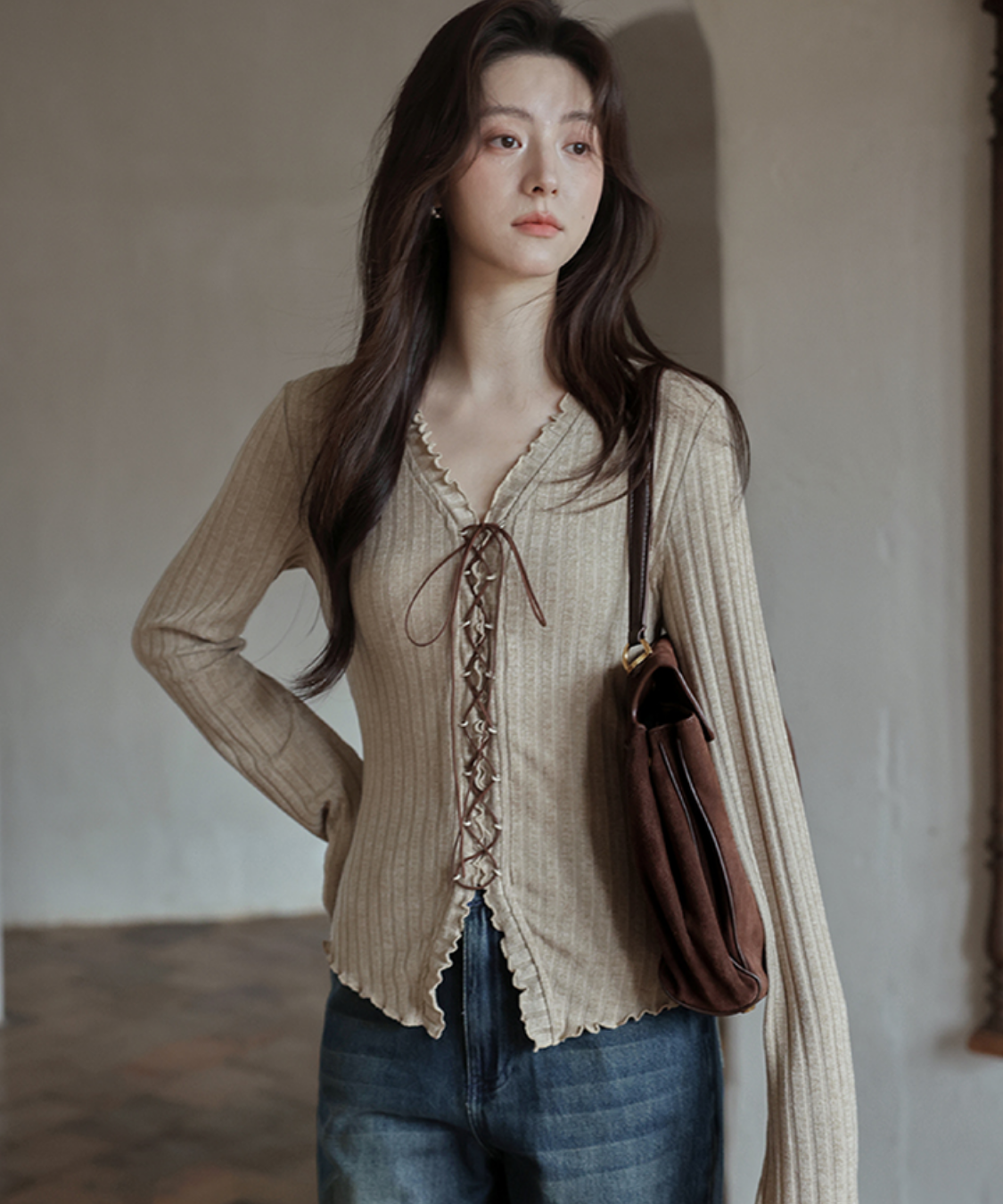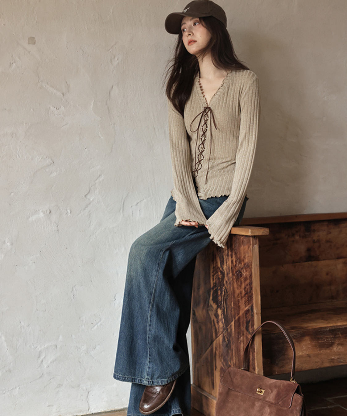 レースアップデザインが視線を引く、フェミニンムード漂うリブカットソーです。