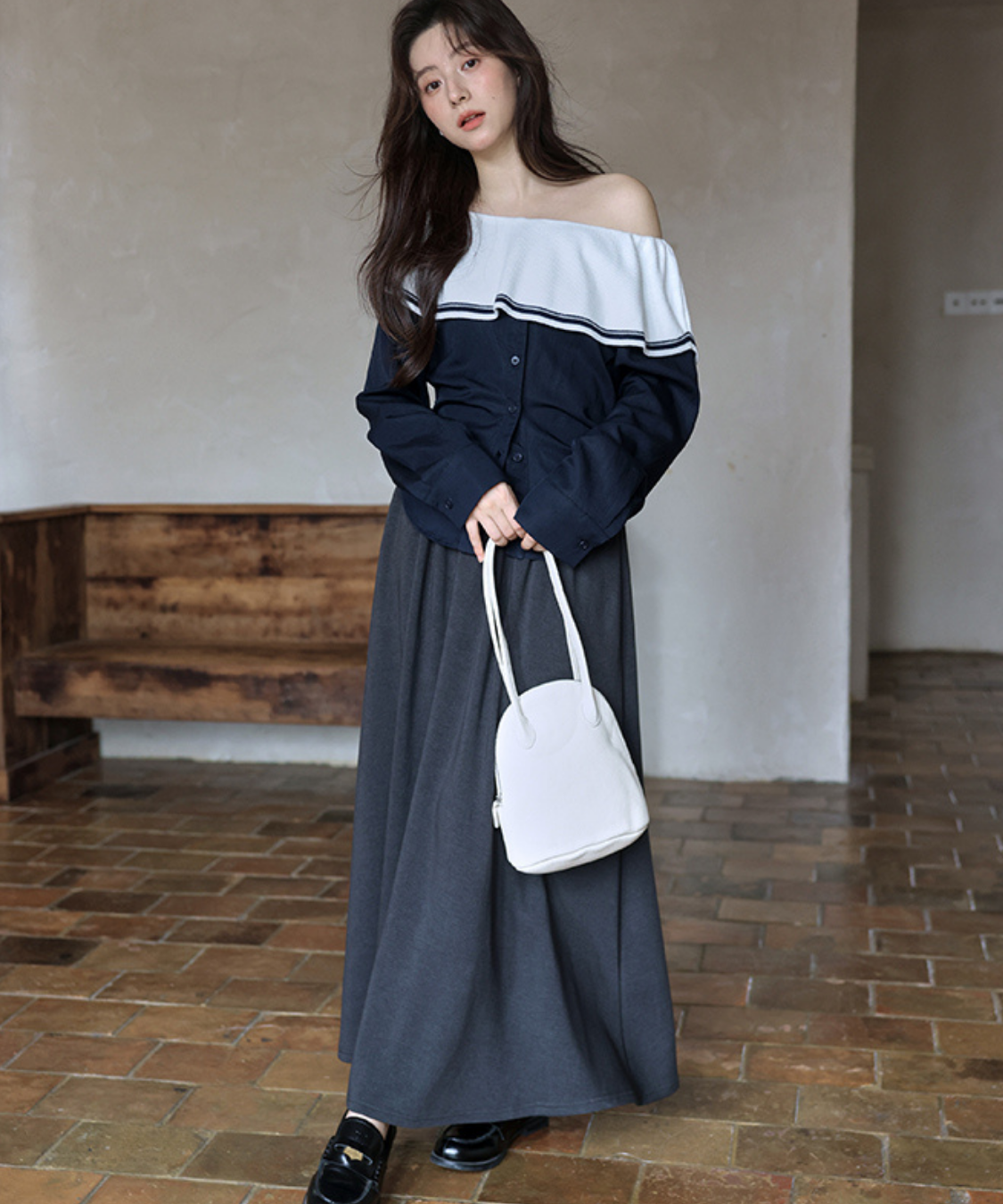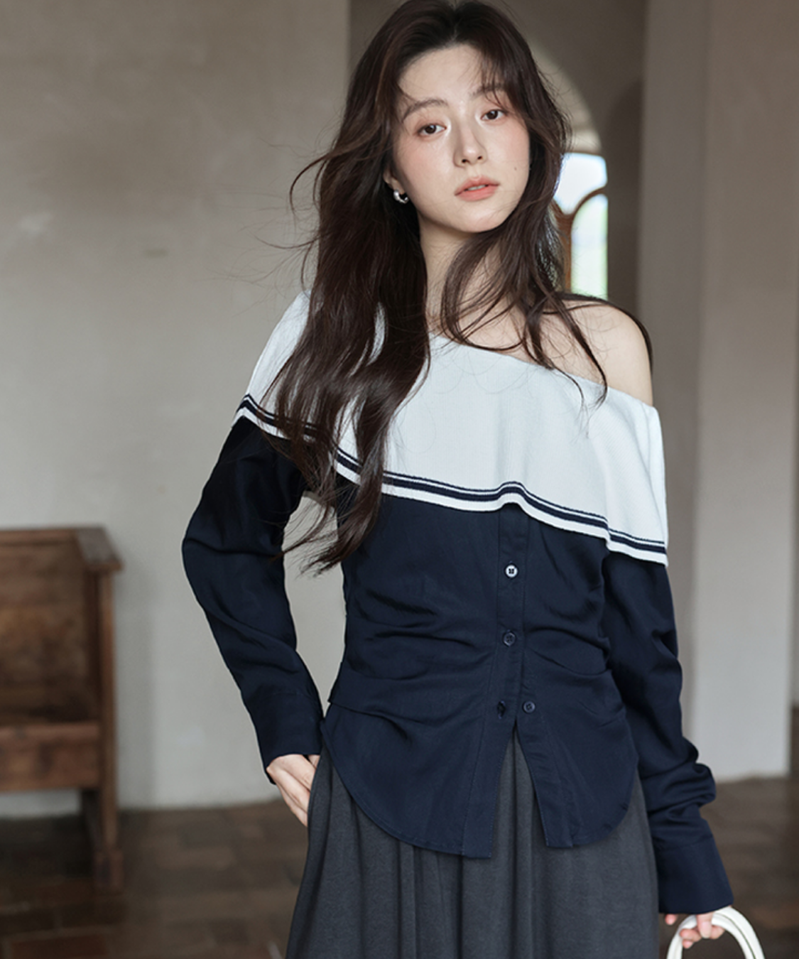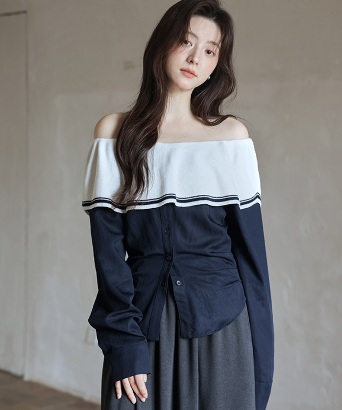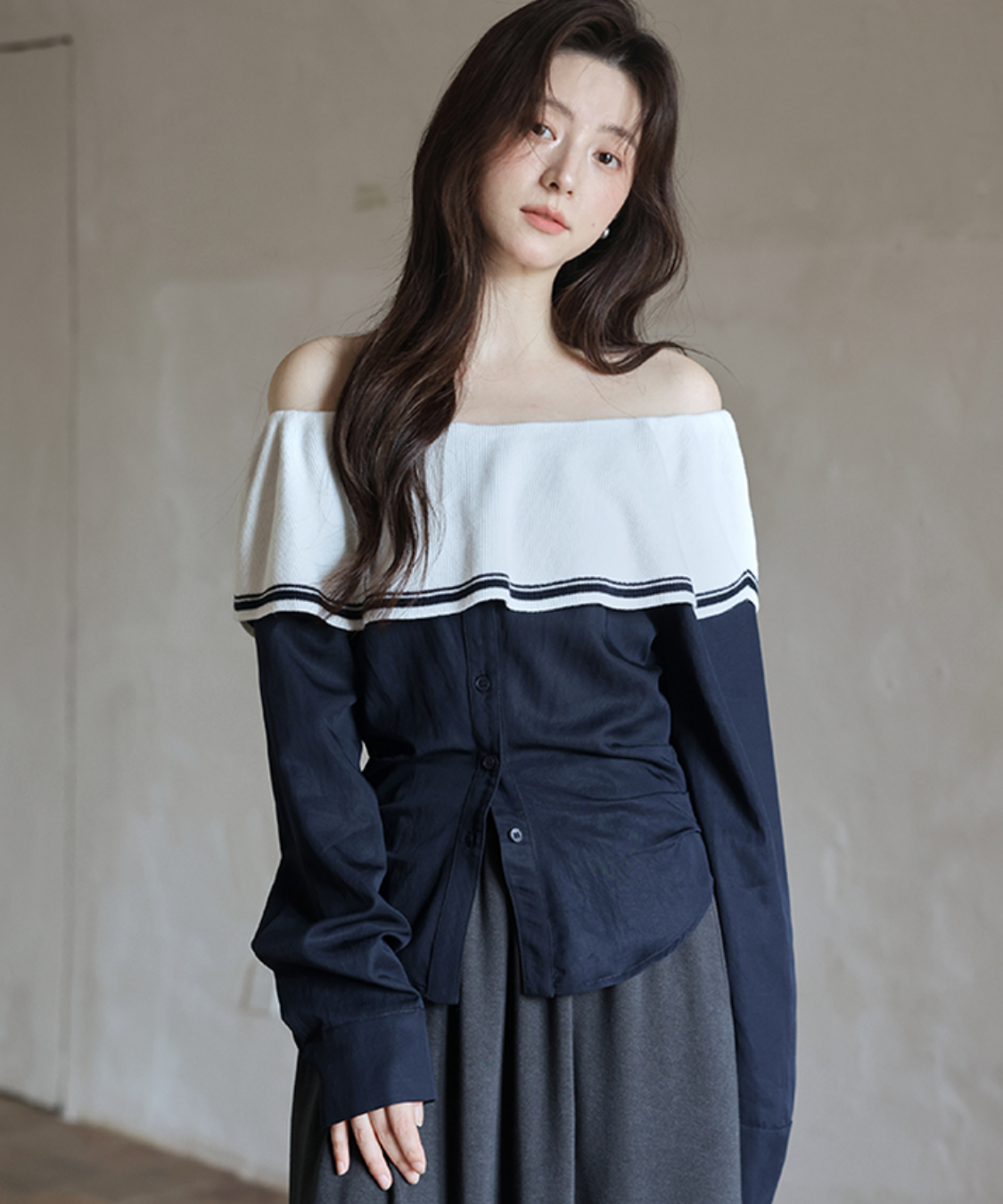 オフショルダーのデザインでデコルテを美しく見せてくれるトップスです。