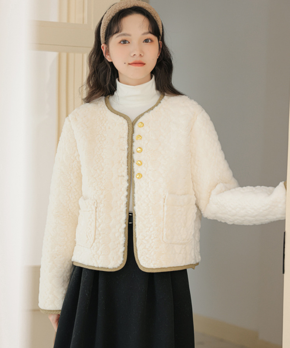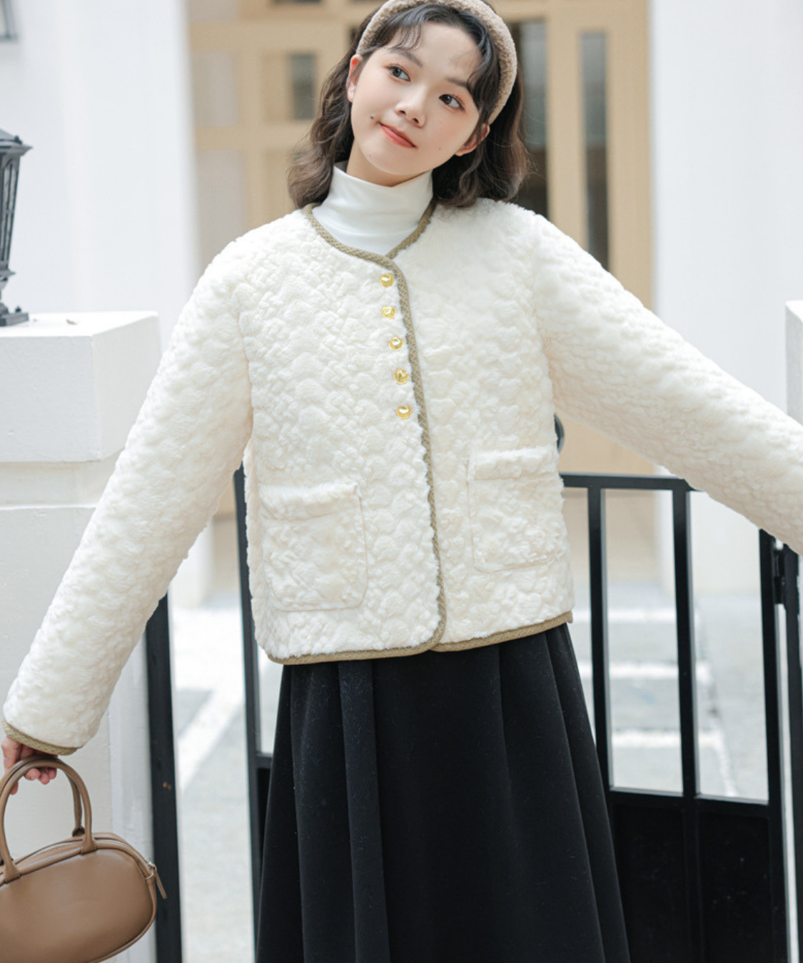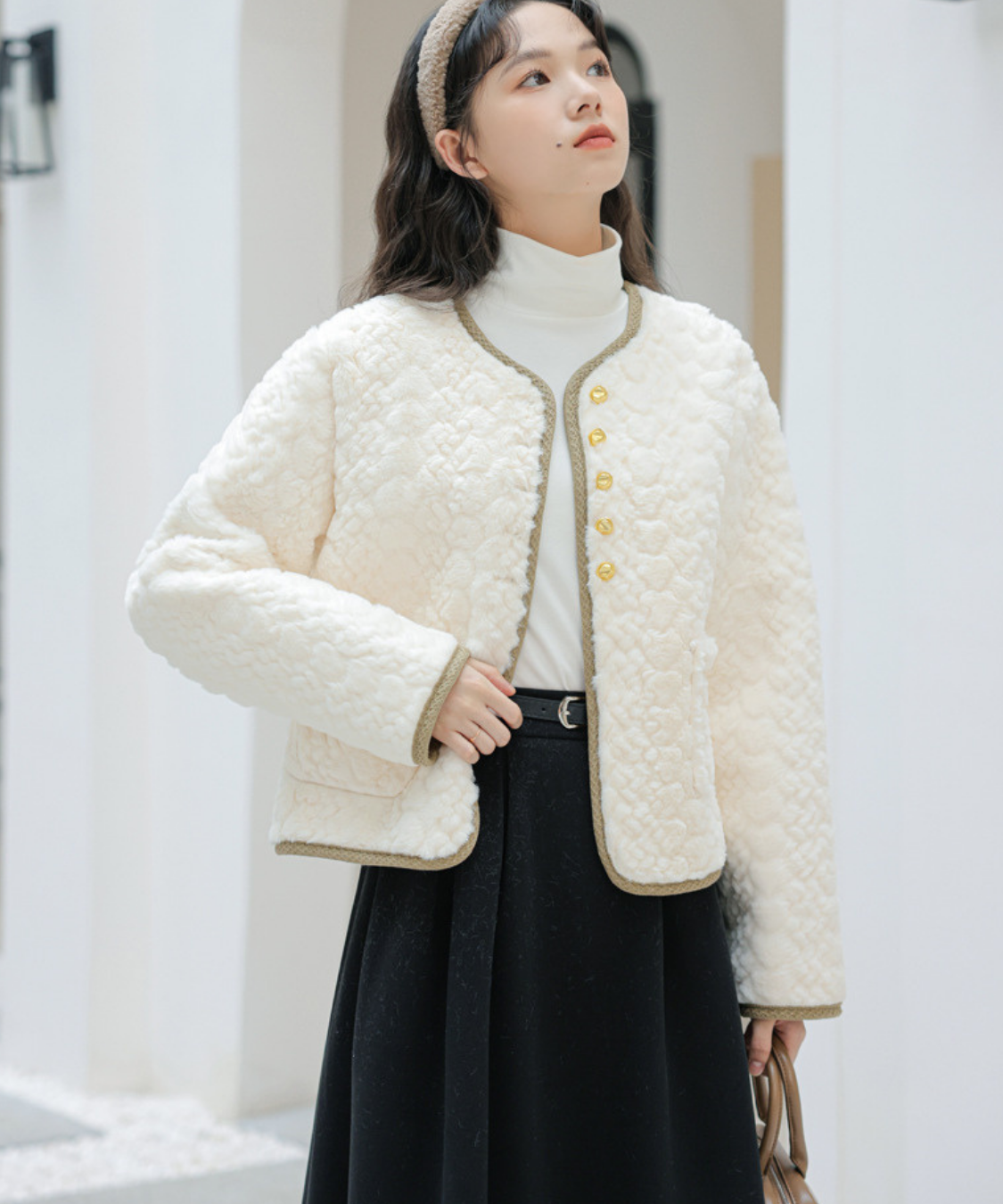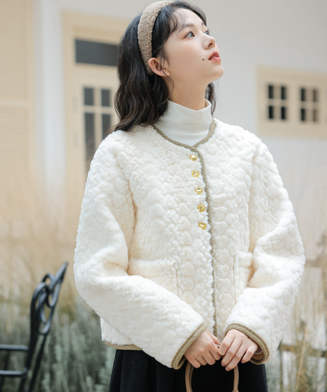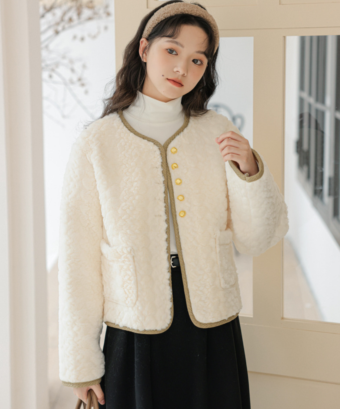 ふんわりとしたボア素材がシーズンムードを高めてくれるノーカラージャケットです。