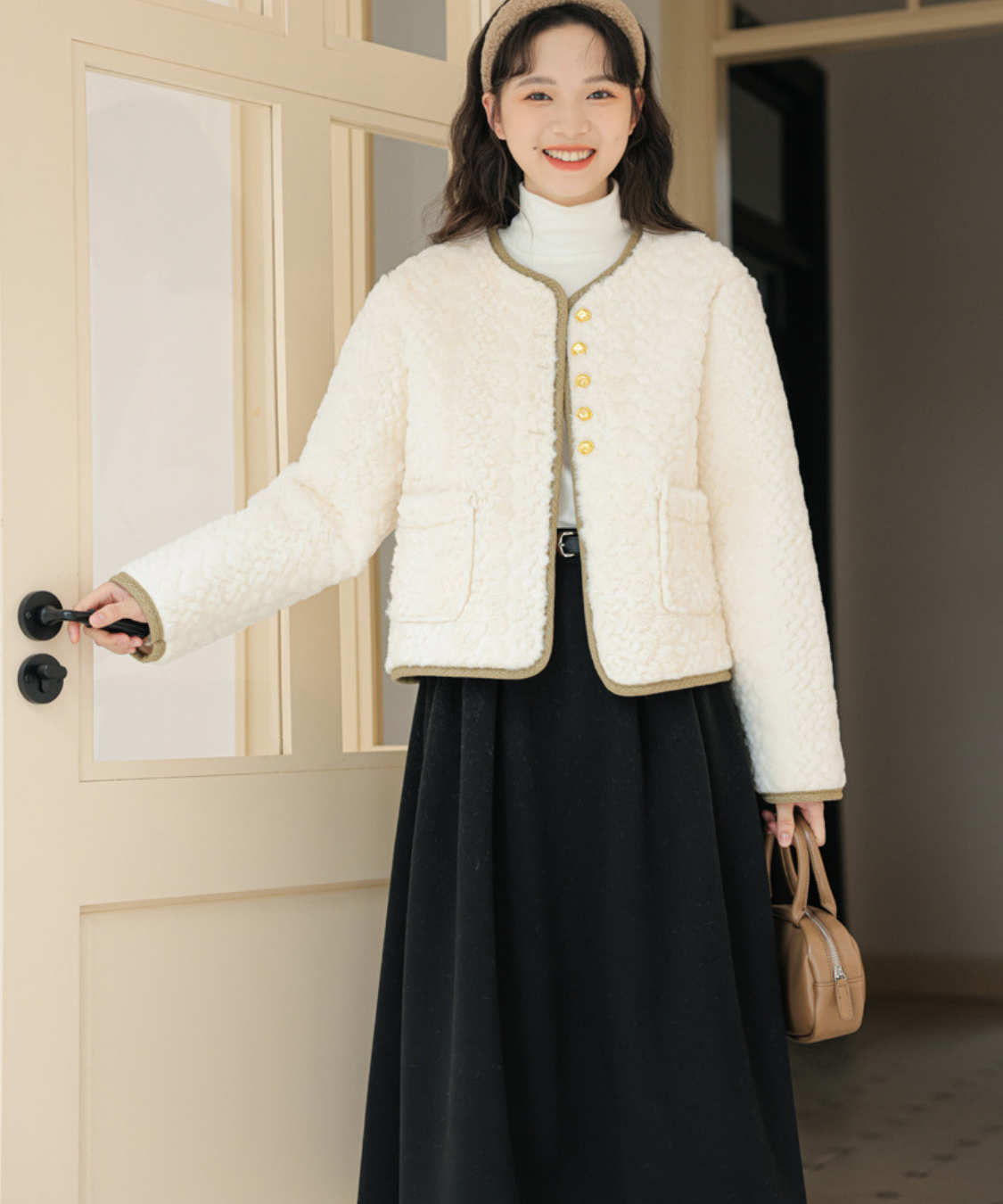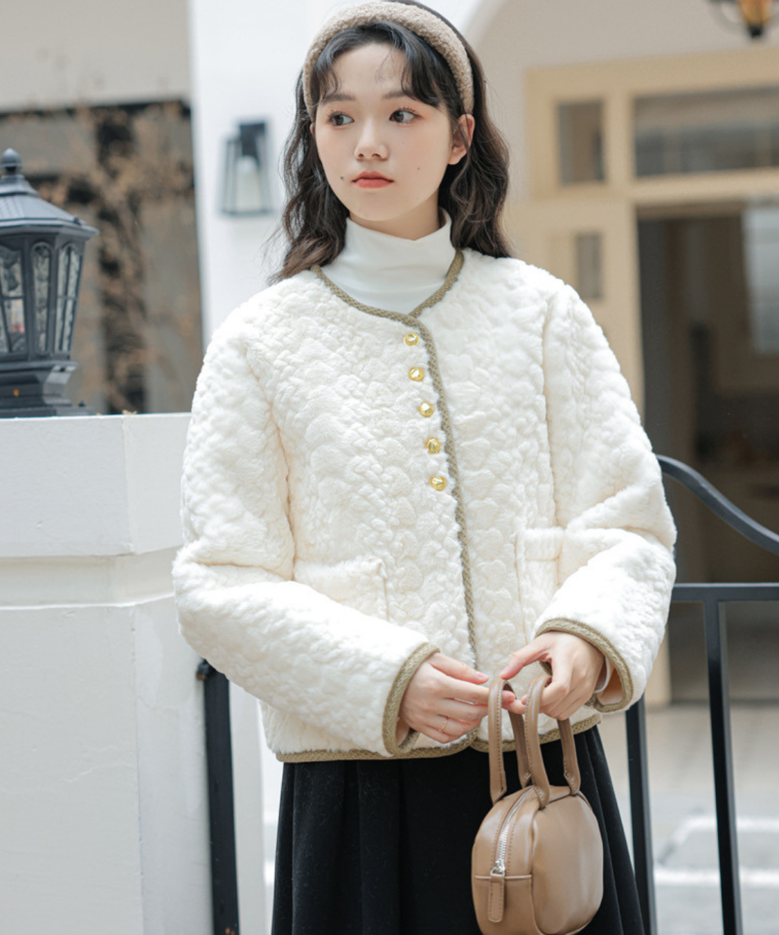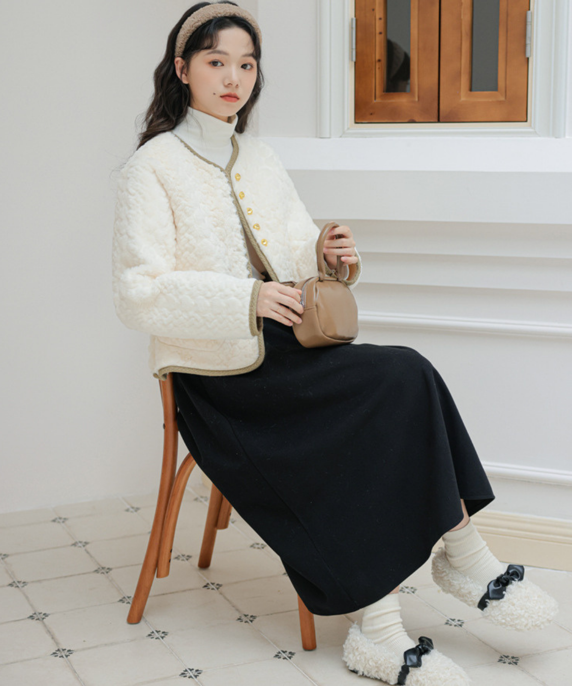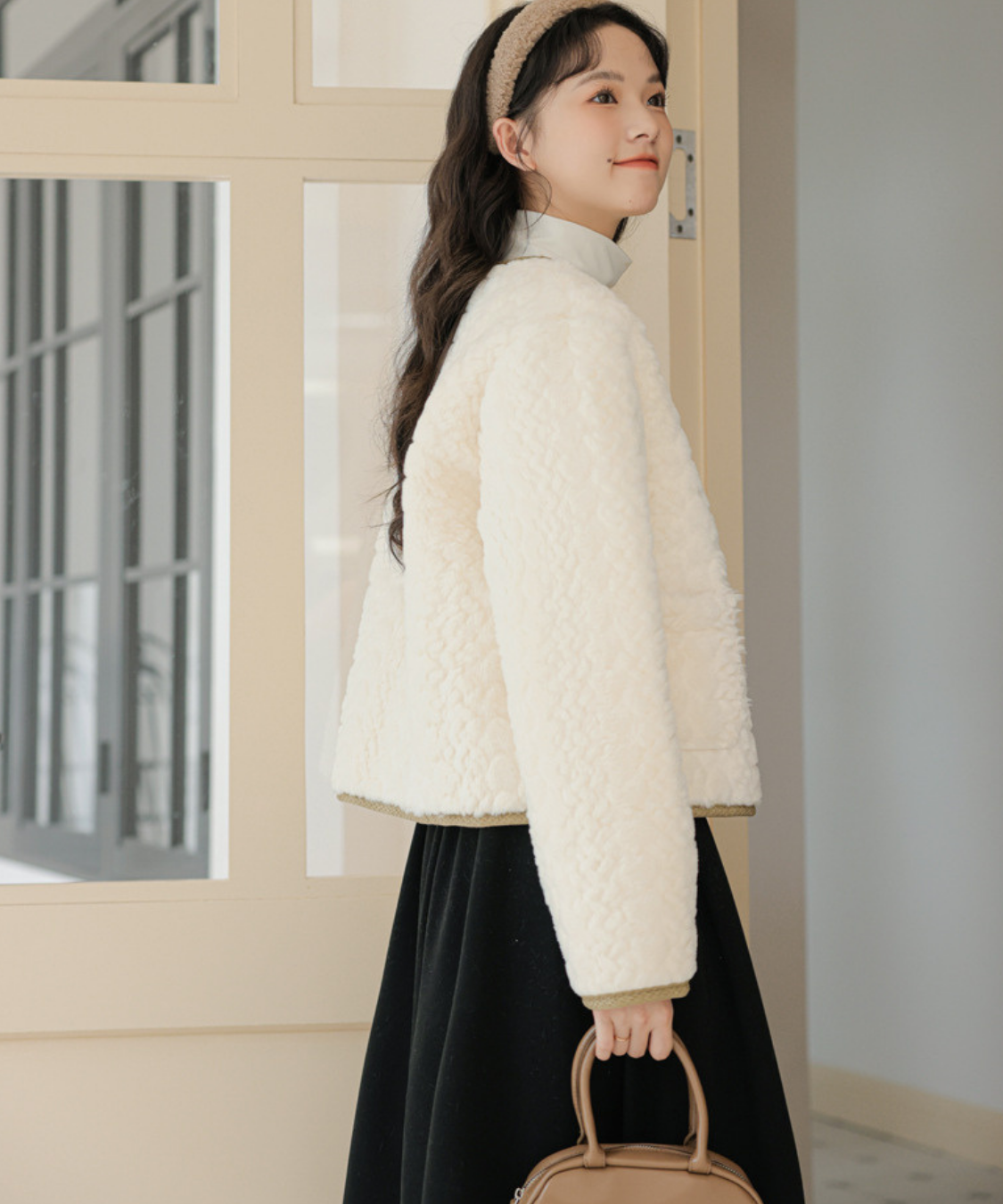 ふんわりとしたボア素材がシーズンムードを高めてくれるノーカラージャケットです。
