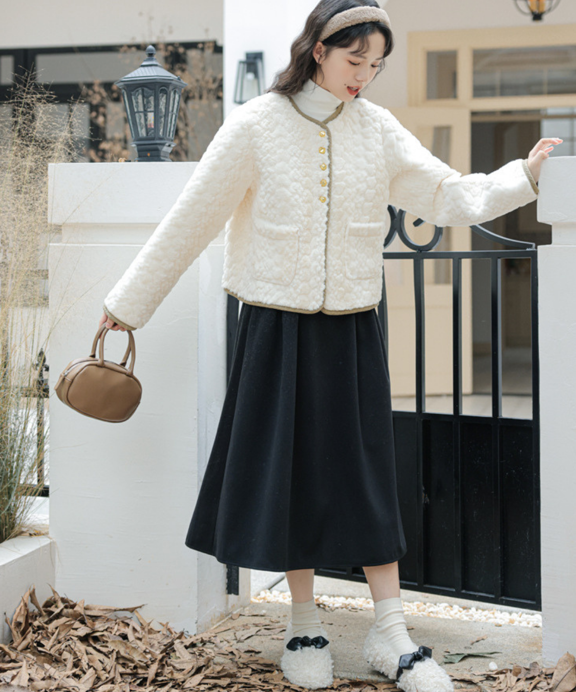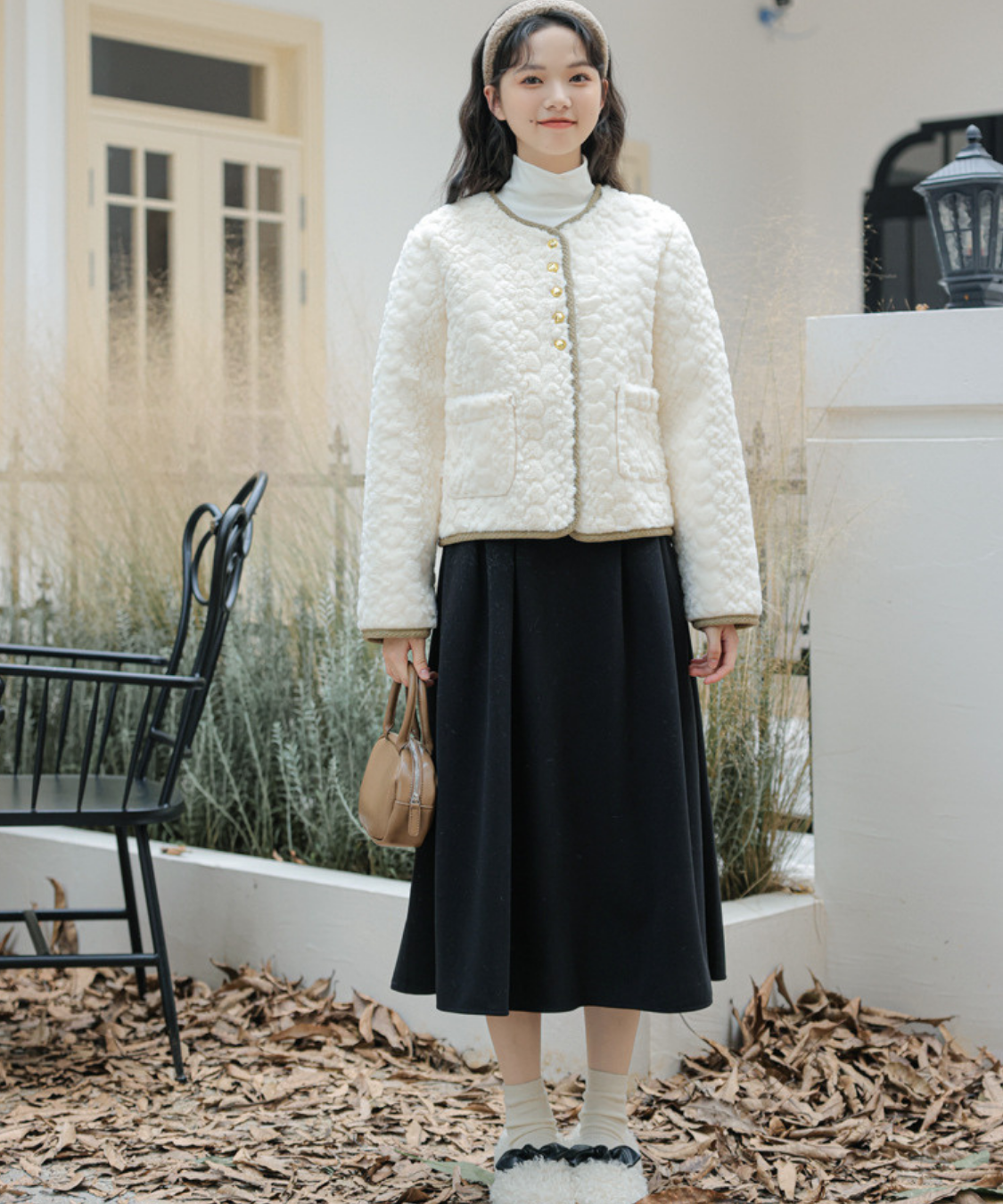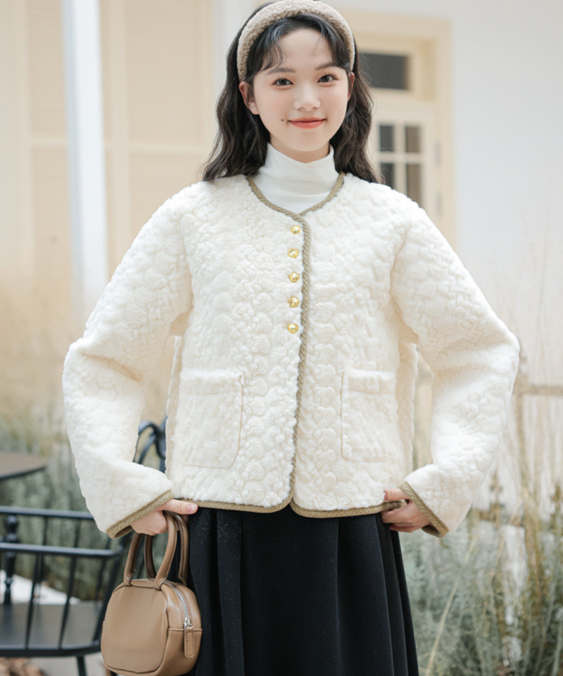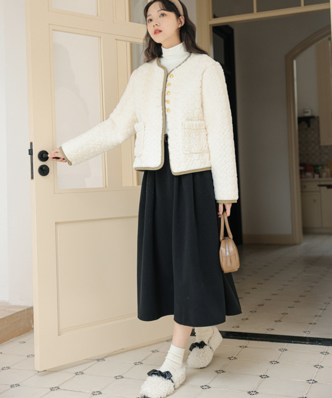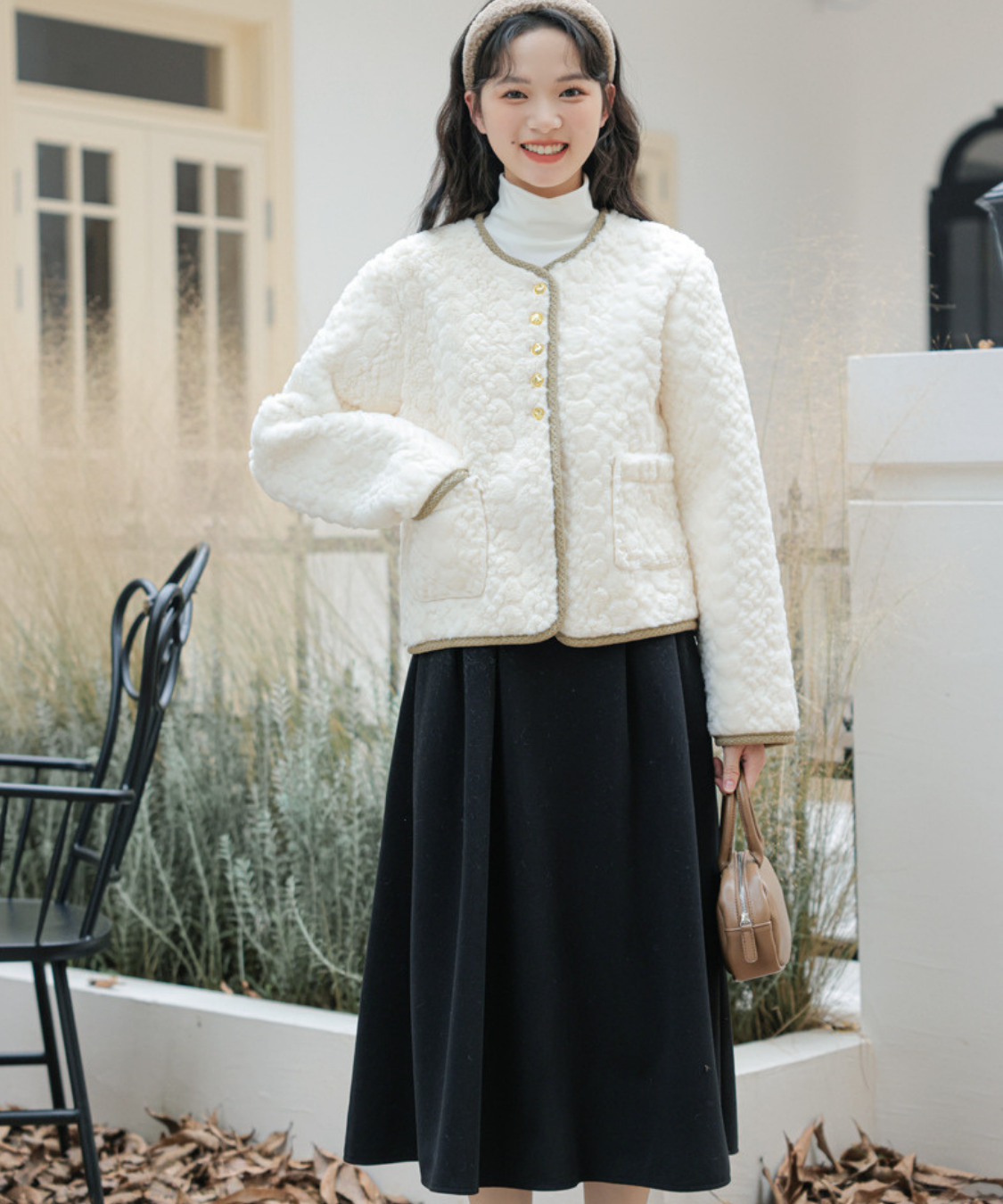 ふんわりとしたボア素材がシーズンムードを高めてくれるノーカラージャケットです。