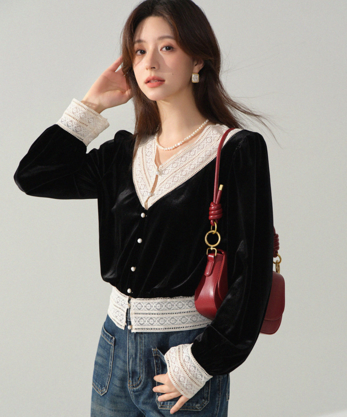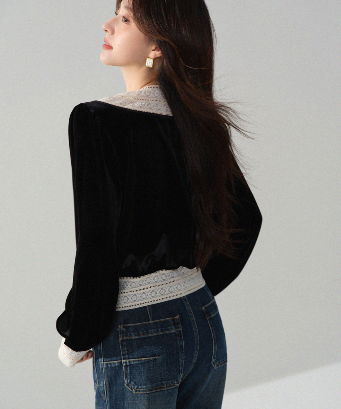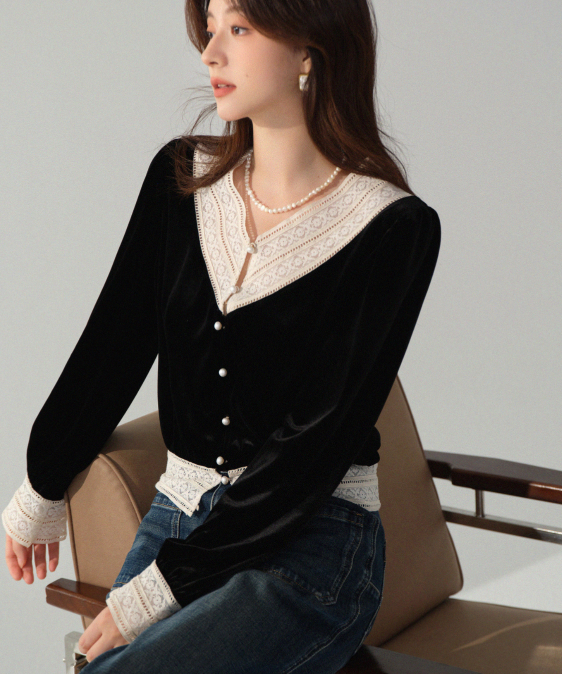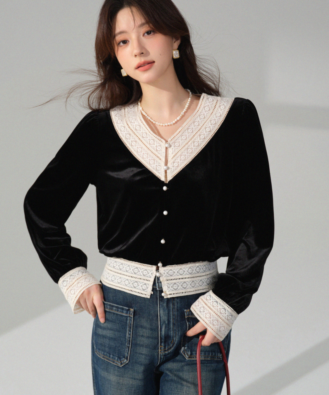 艶やかなベロア素材にレースを施した、クラシカルな雰囲気漂う上品ブラウスです。