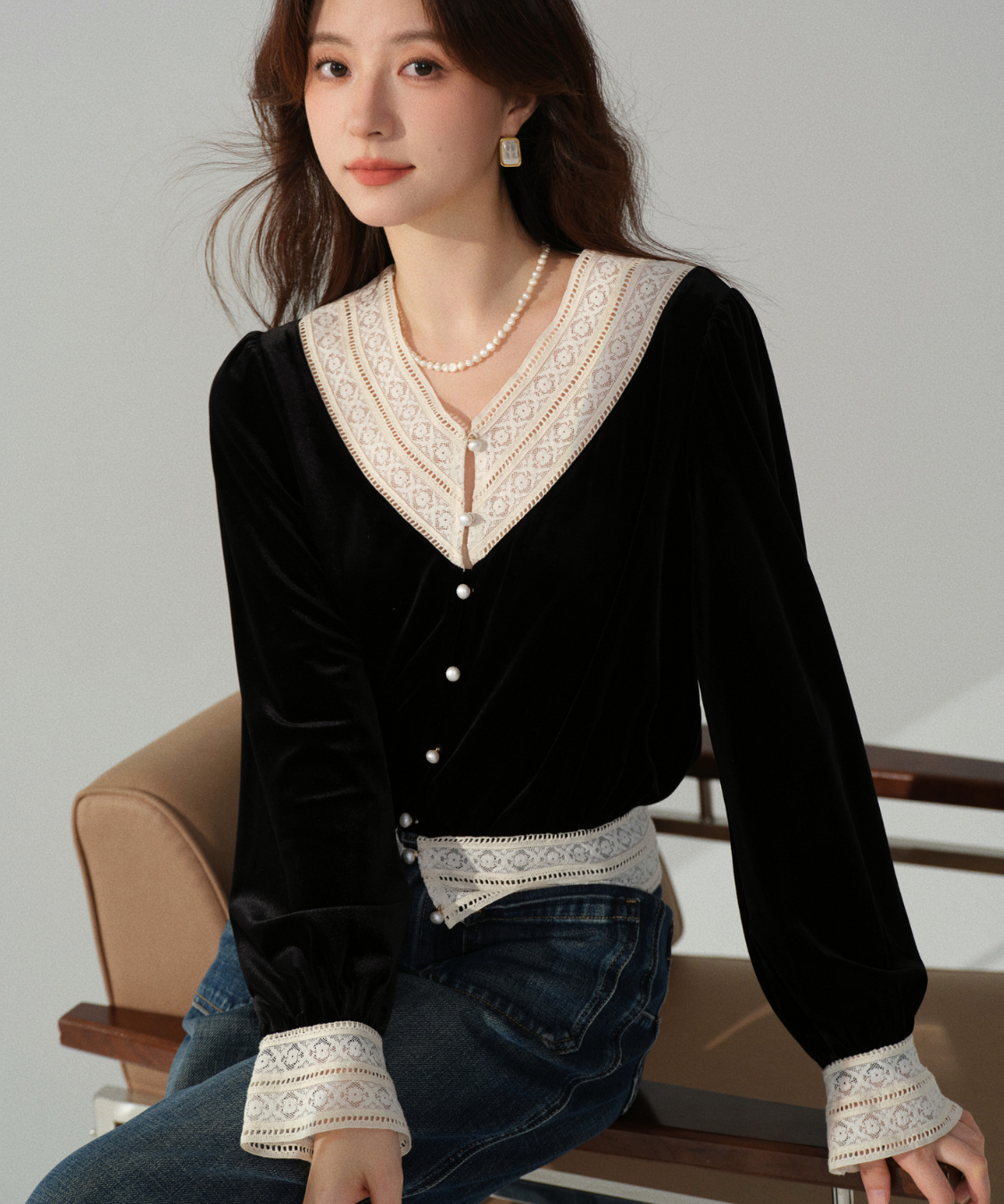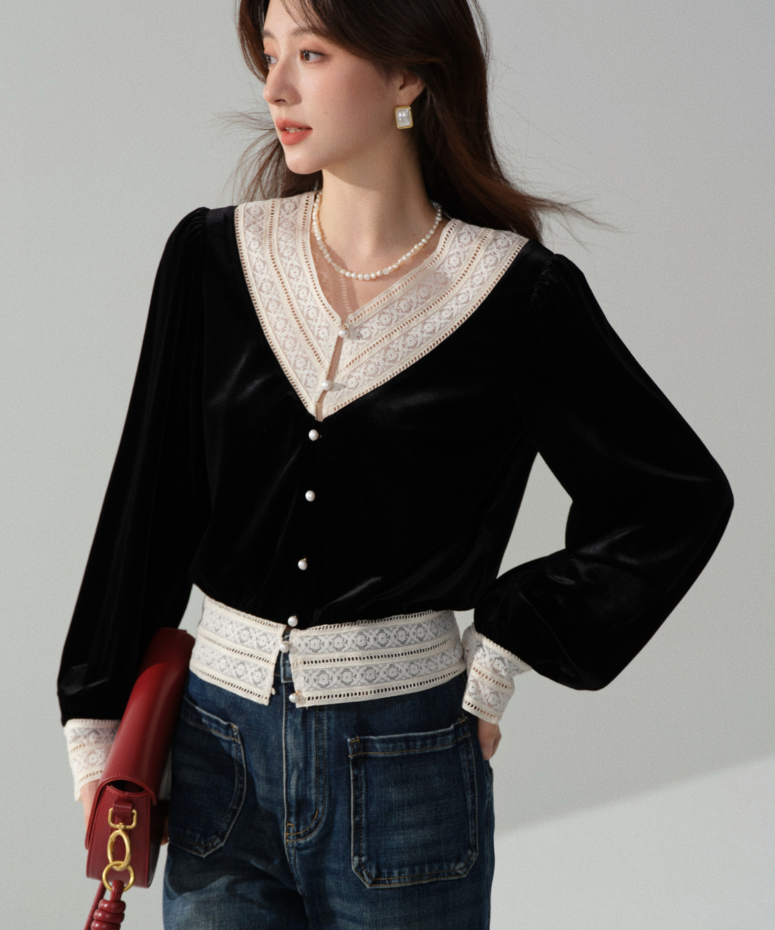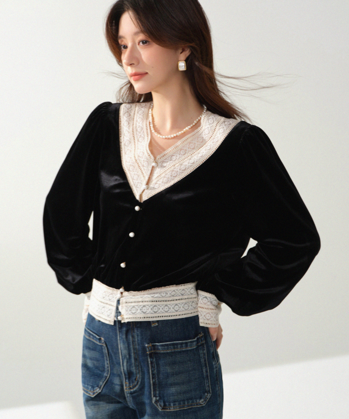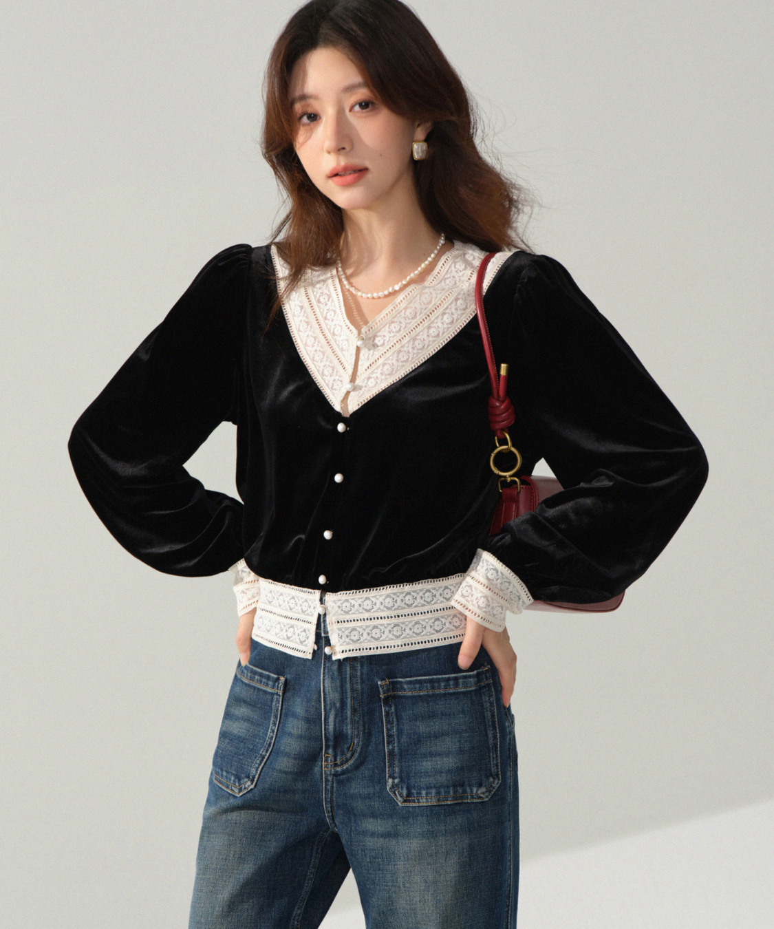 艶やかなベロア素材にレースを施した、クラシカルな雰囲気漂う上品ブラウスです。