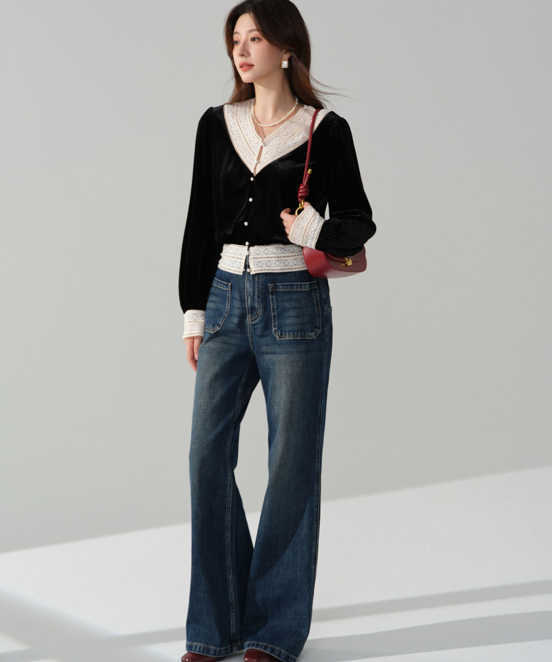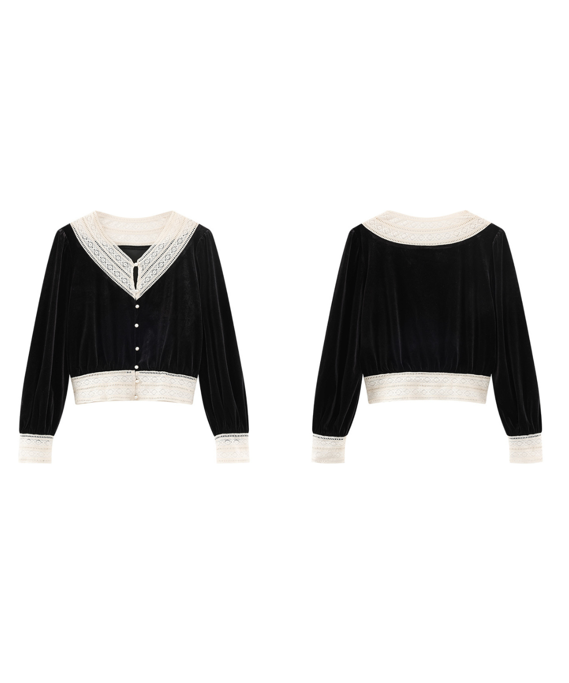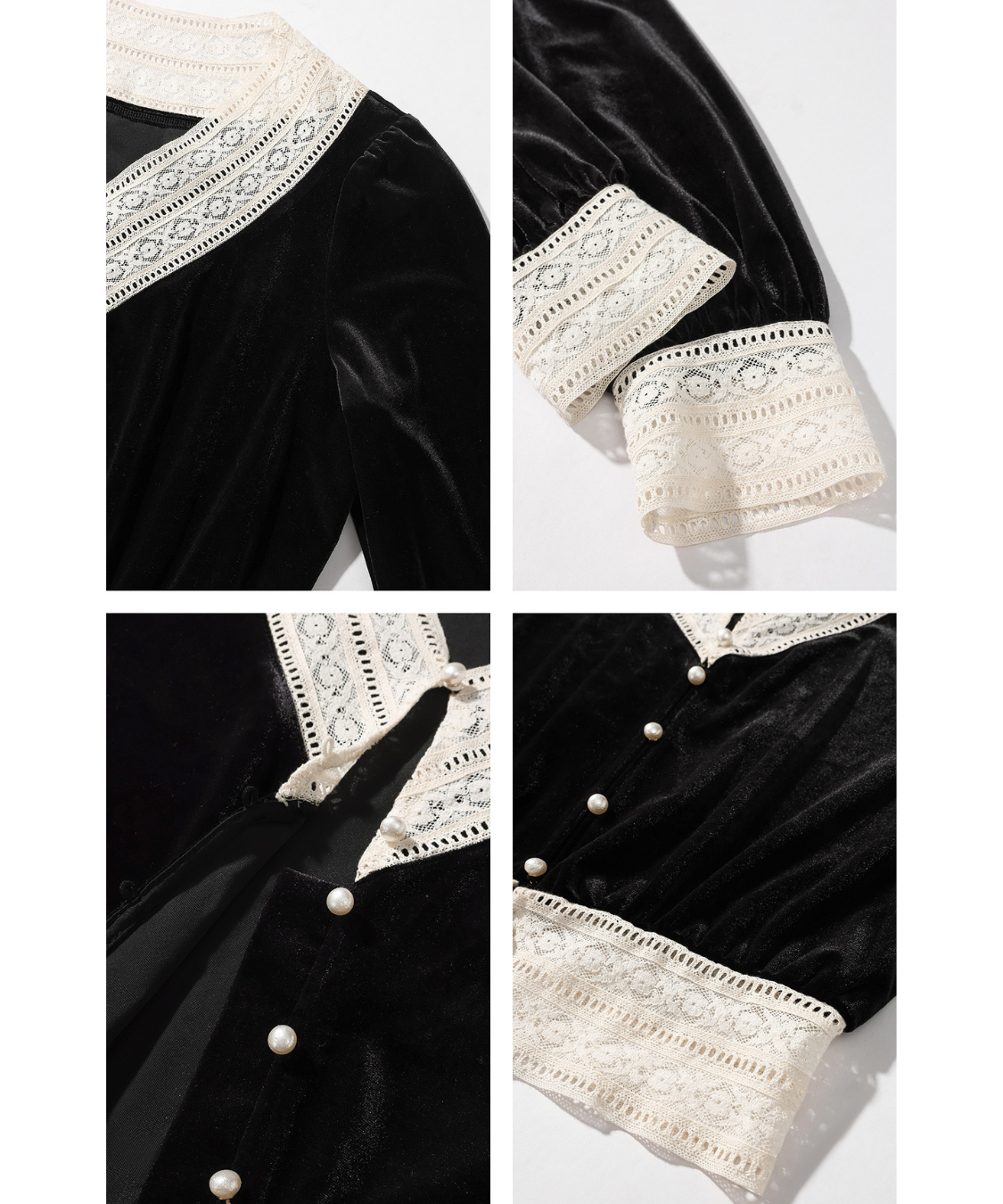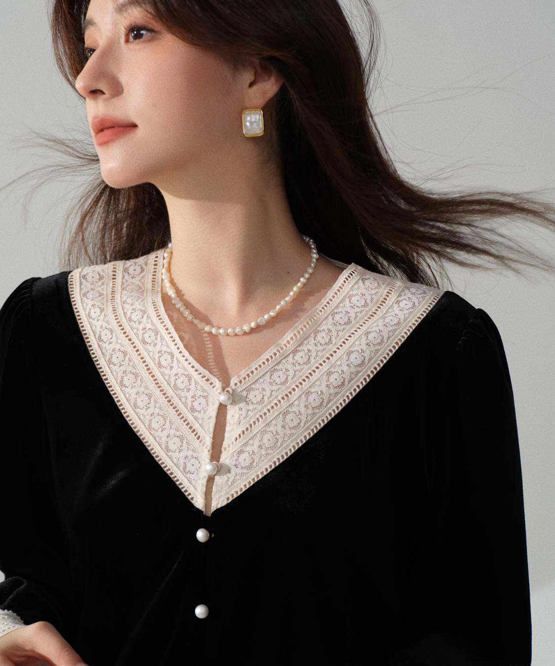 艶やかなベロア素材にレースを施した、クラシカルな雰囲気漂う上品ブラウスです。