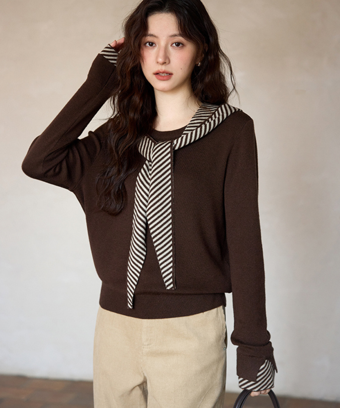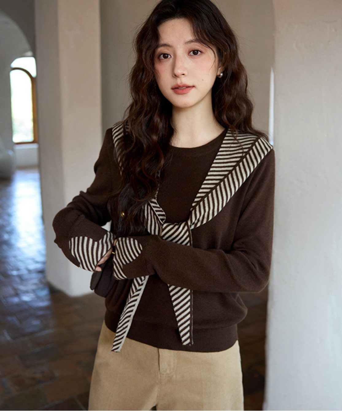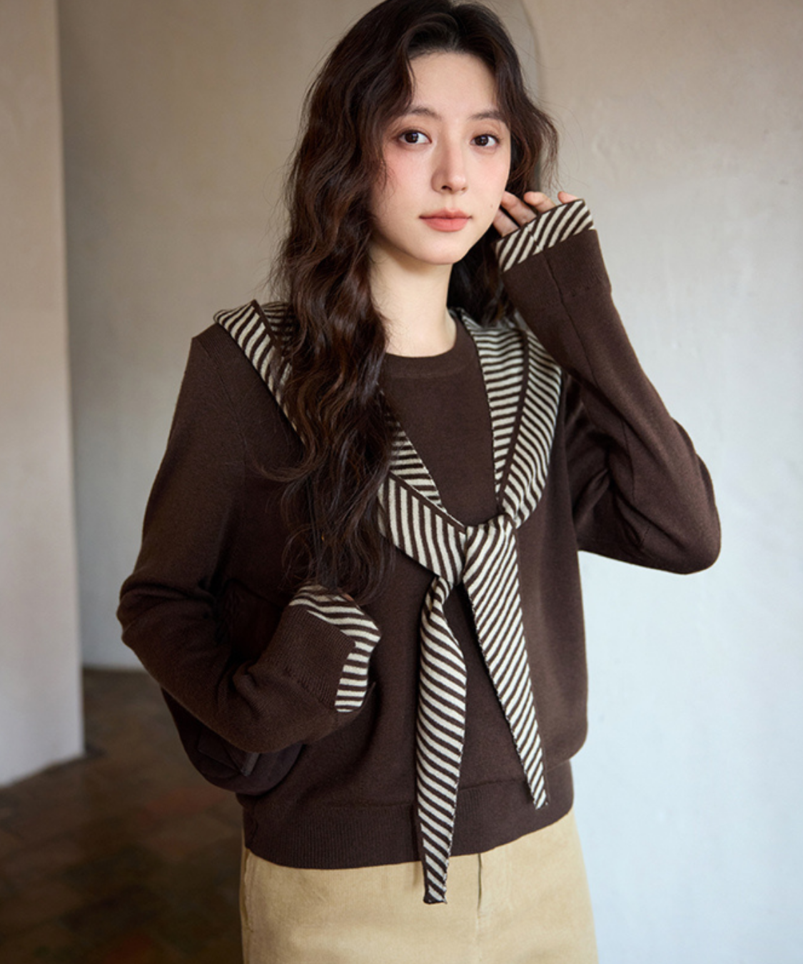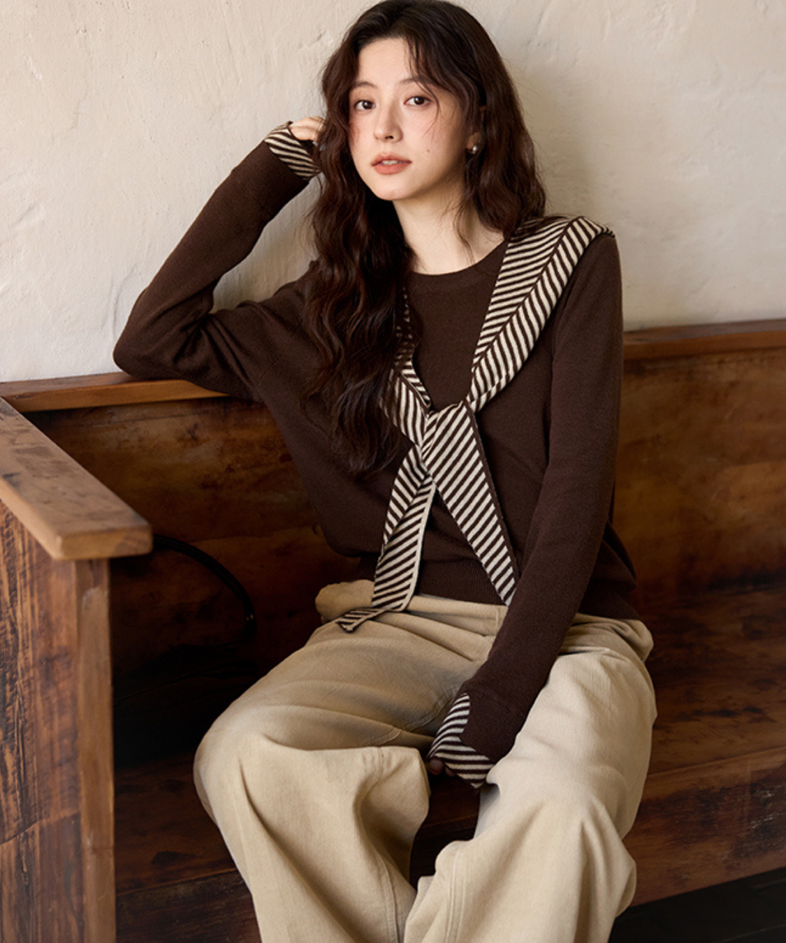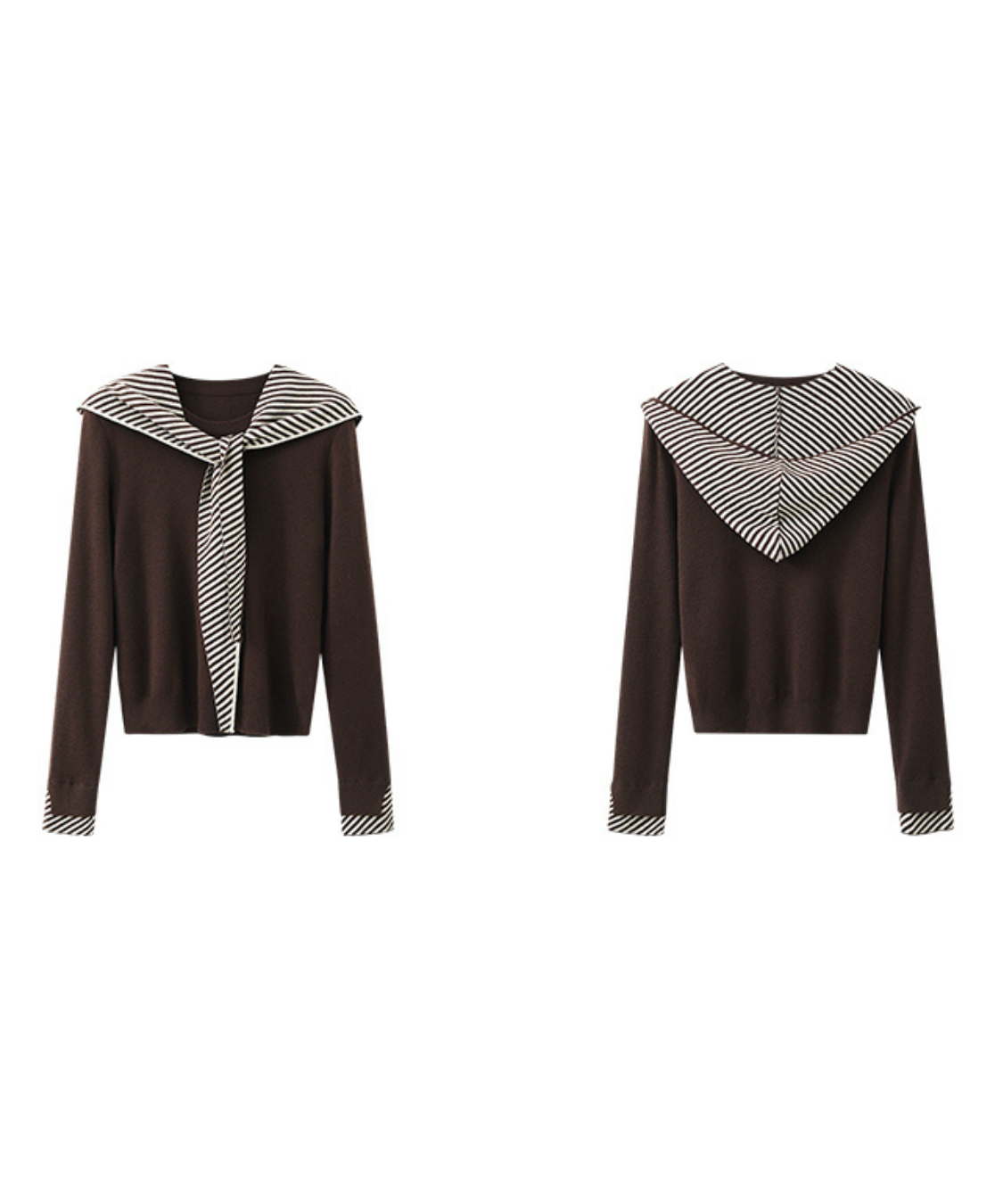 ボーダーフードショール付きクルーネックニットトップス