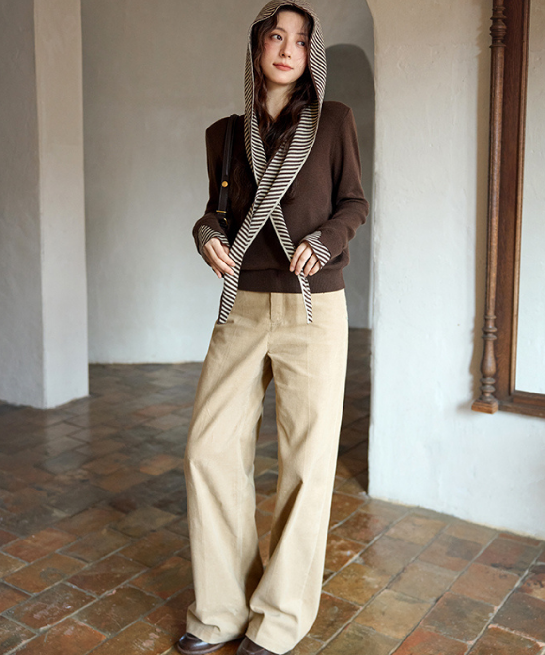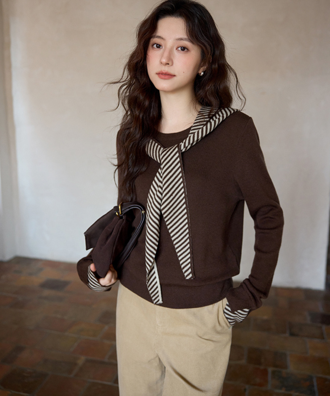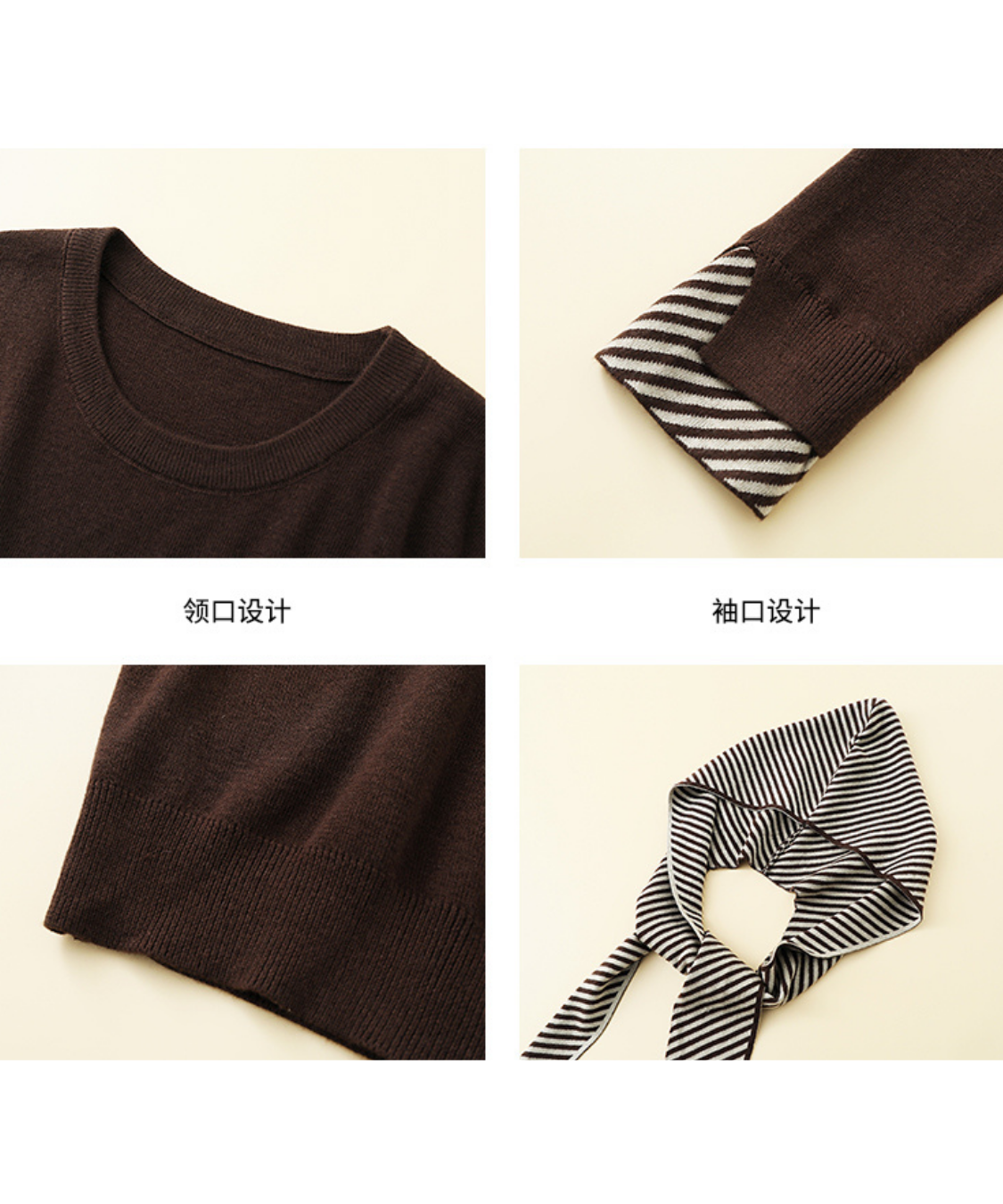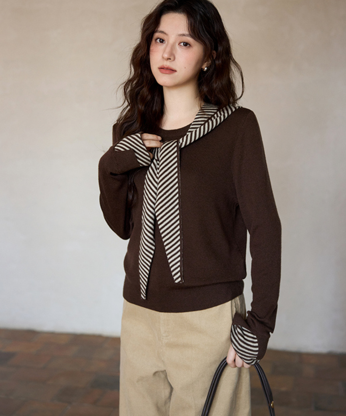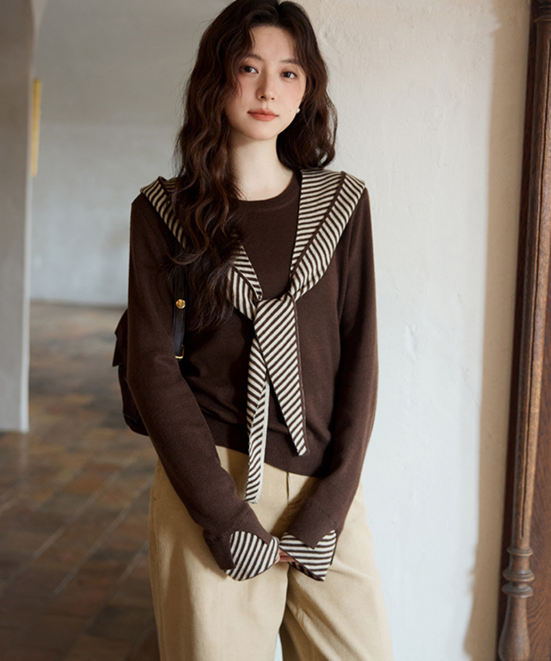ボーダーフードショール付きクルーネックニットトップス