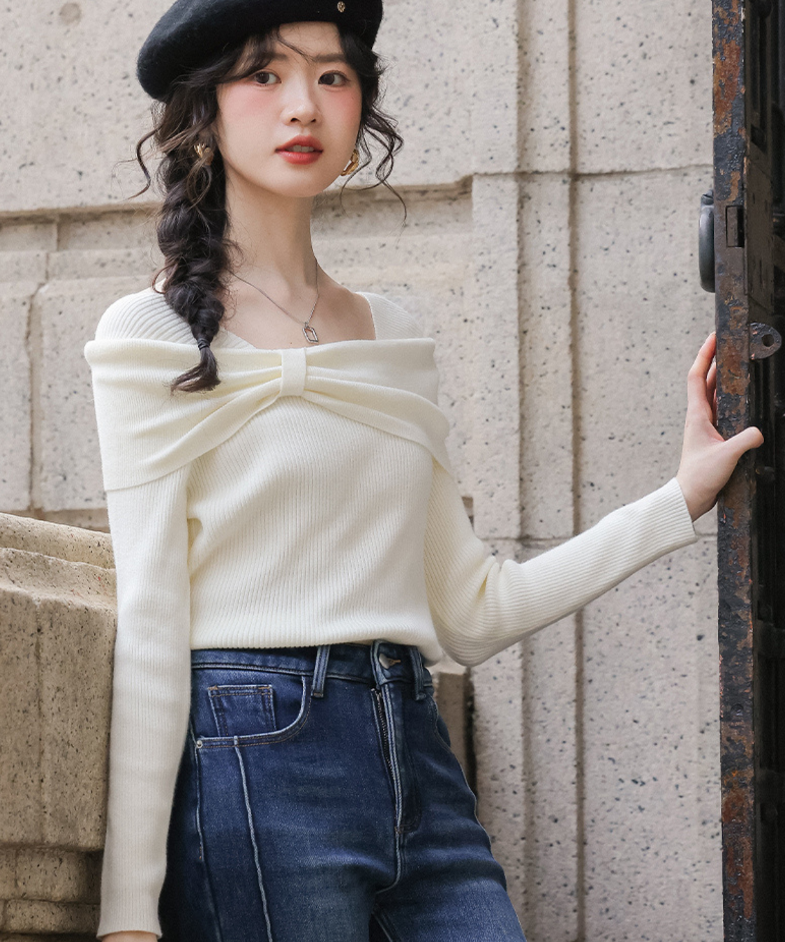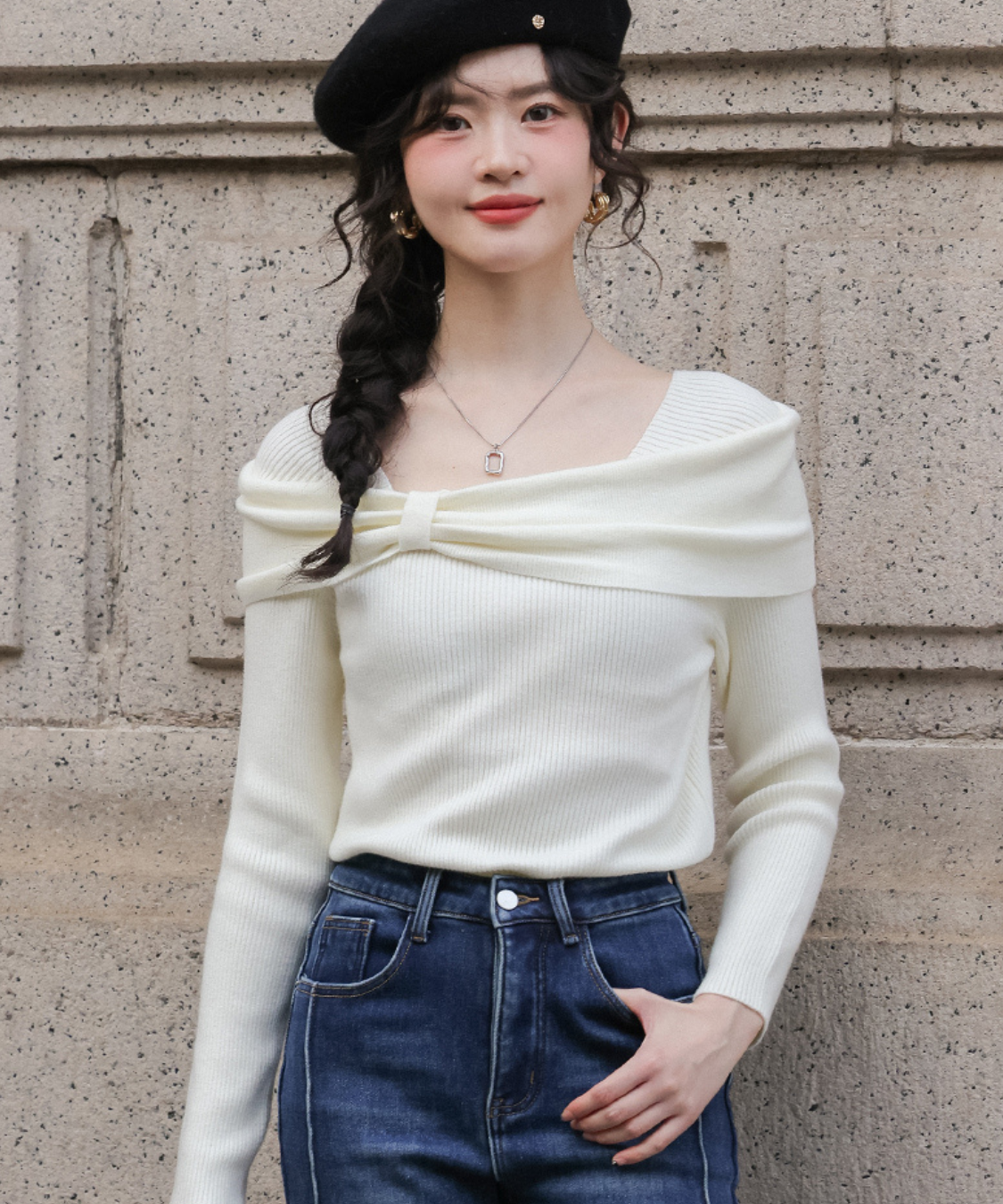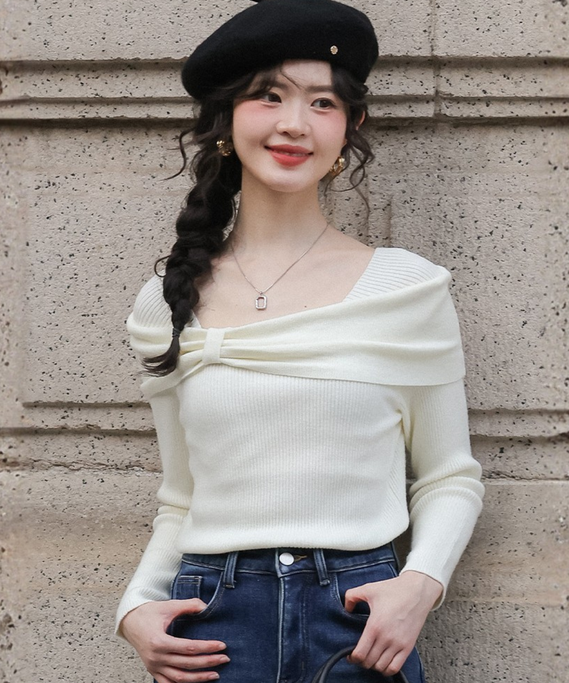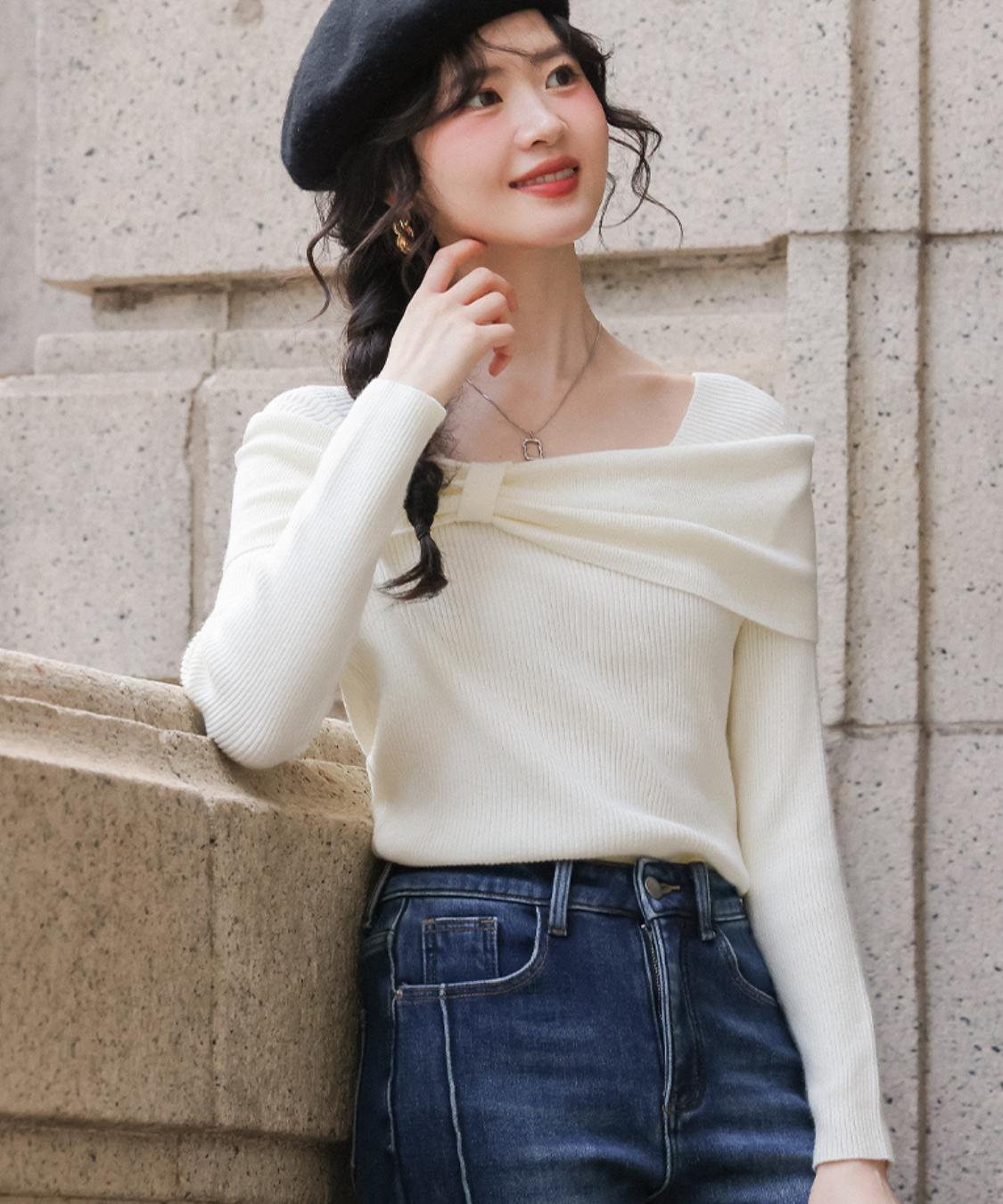 デコルテを美しく見せてくれるオフショルデザインのリブトップスです。