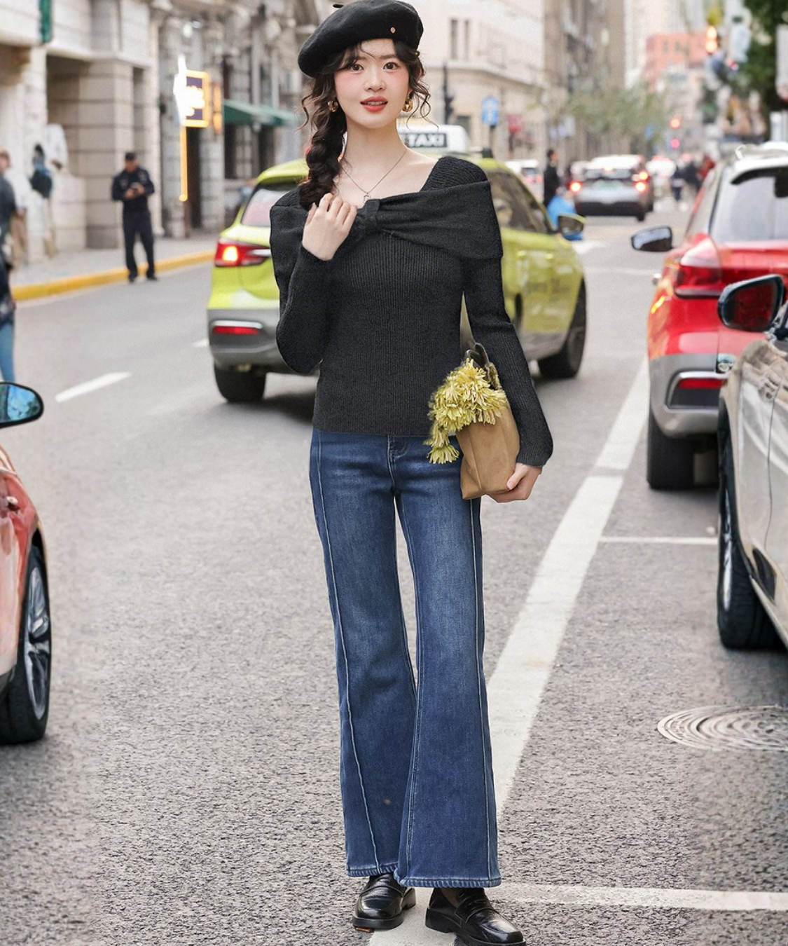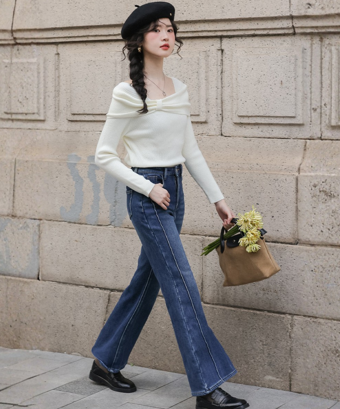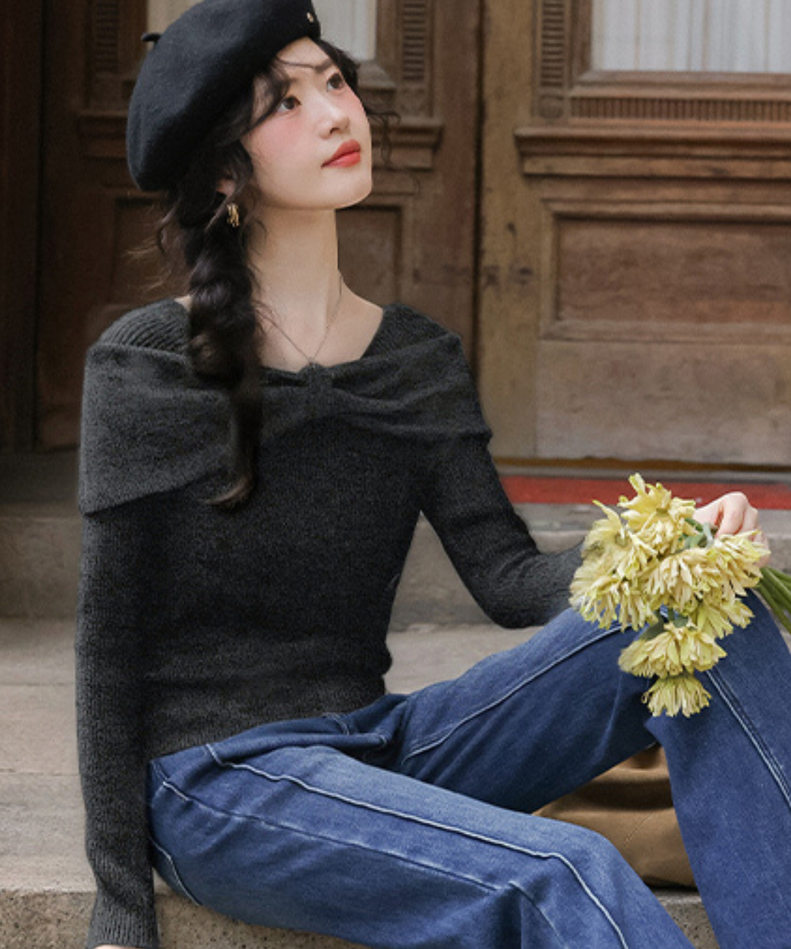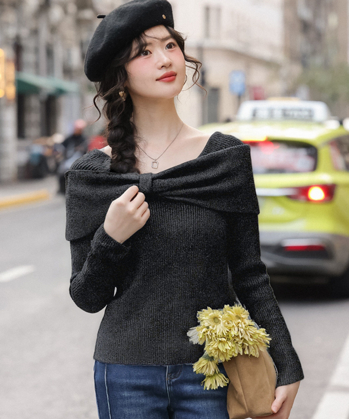 デコルテを美しく見せてくれるオフショルデザインのリブトップスです。