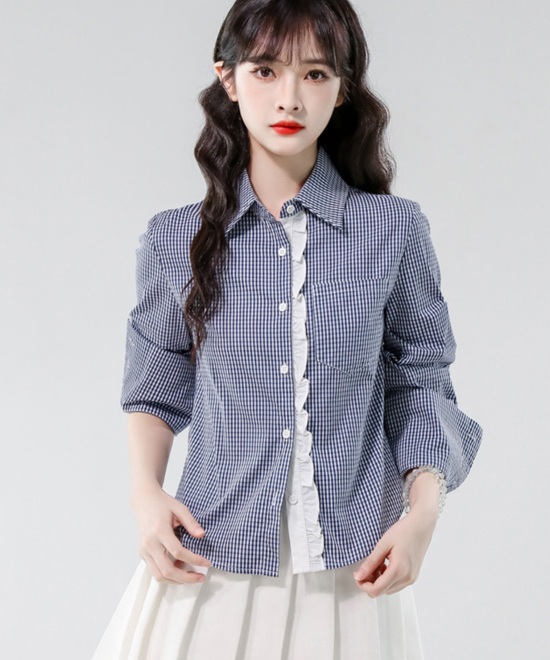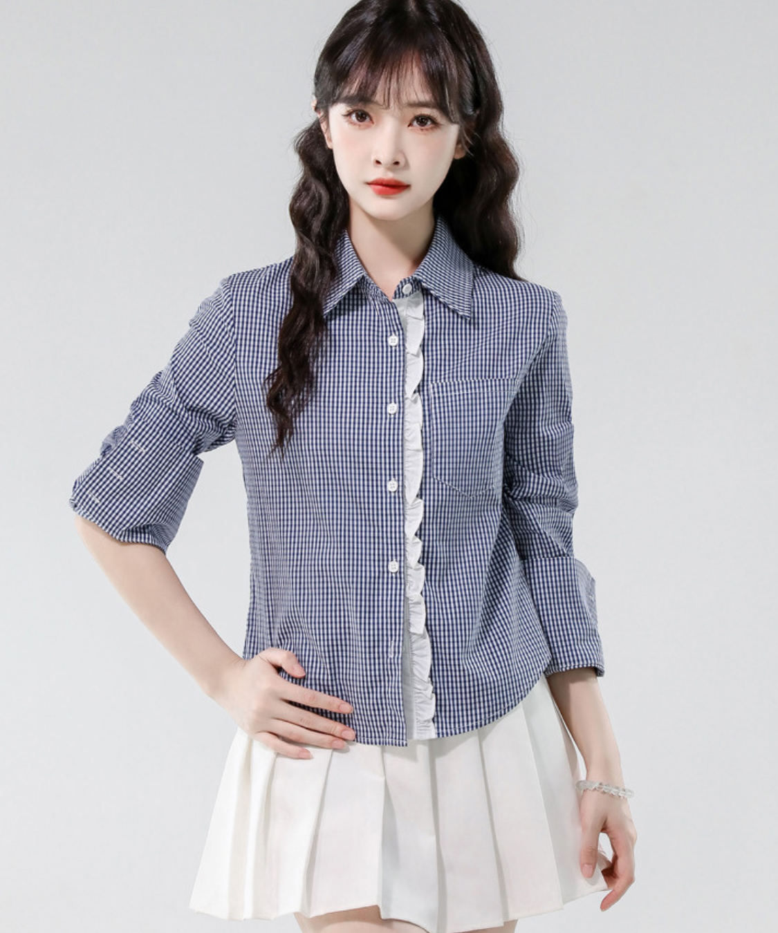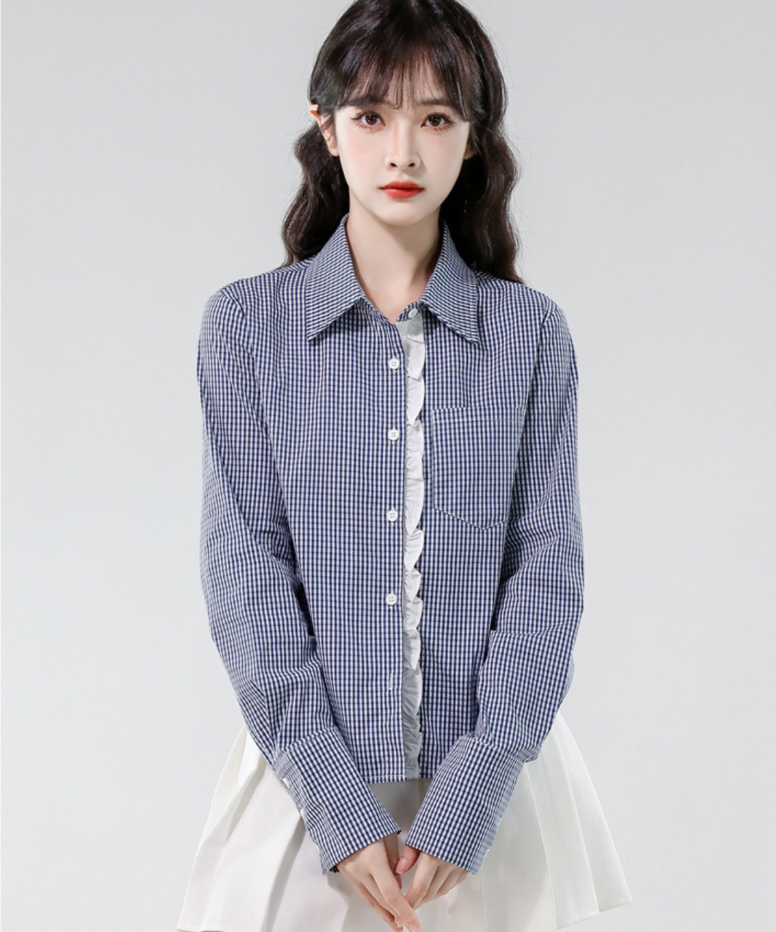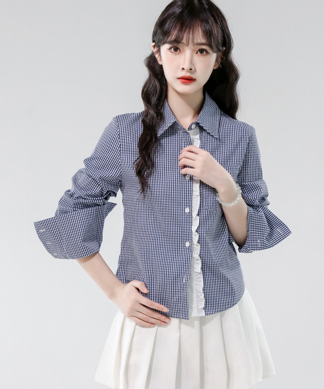 フロントのフリルがアクセントになったギンガムチェックシャツです。