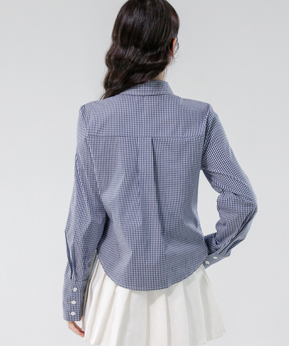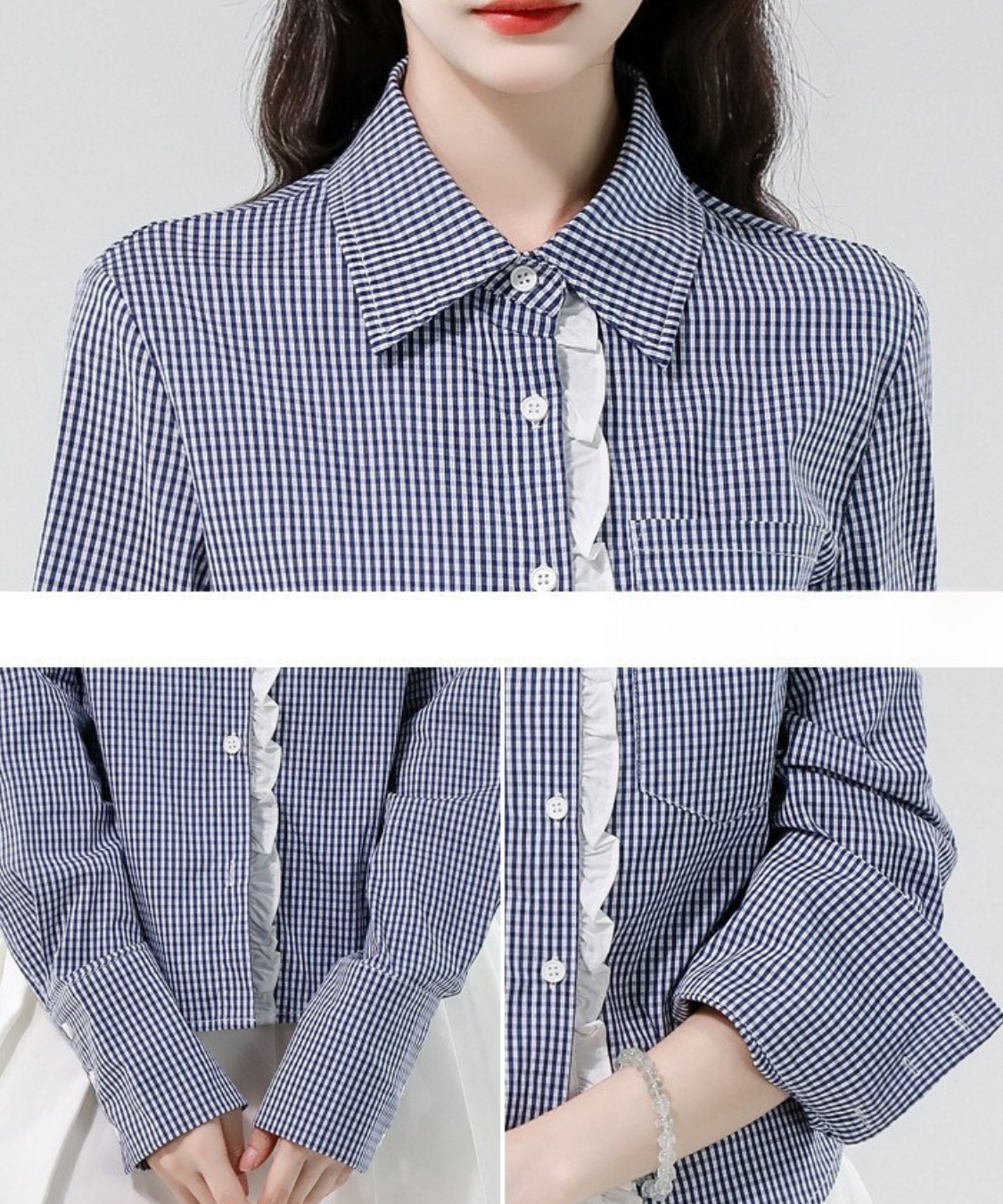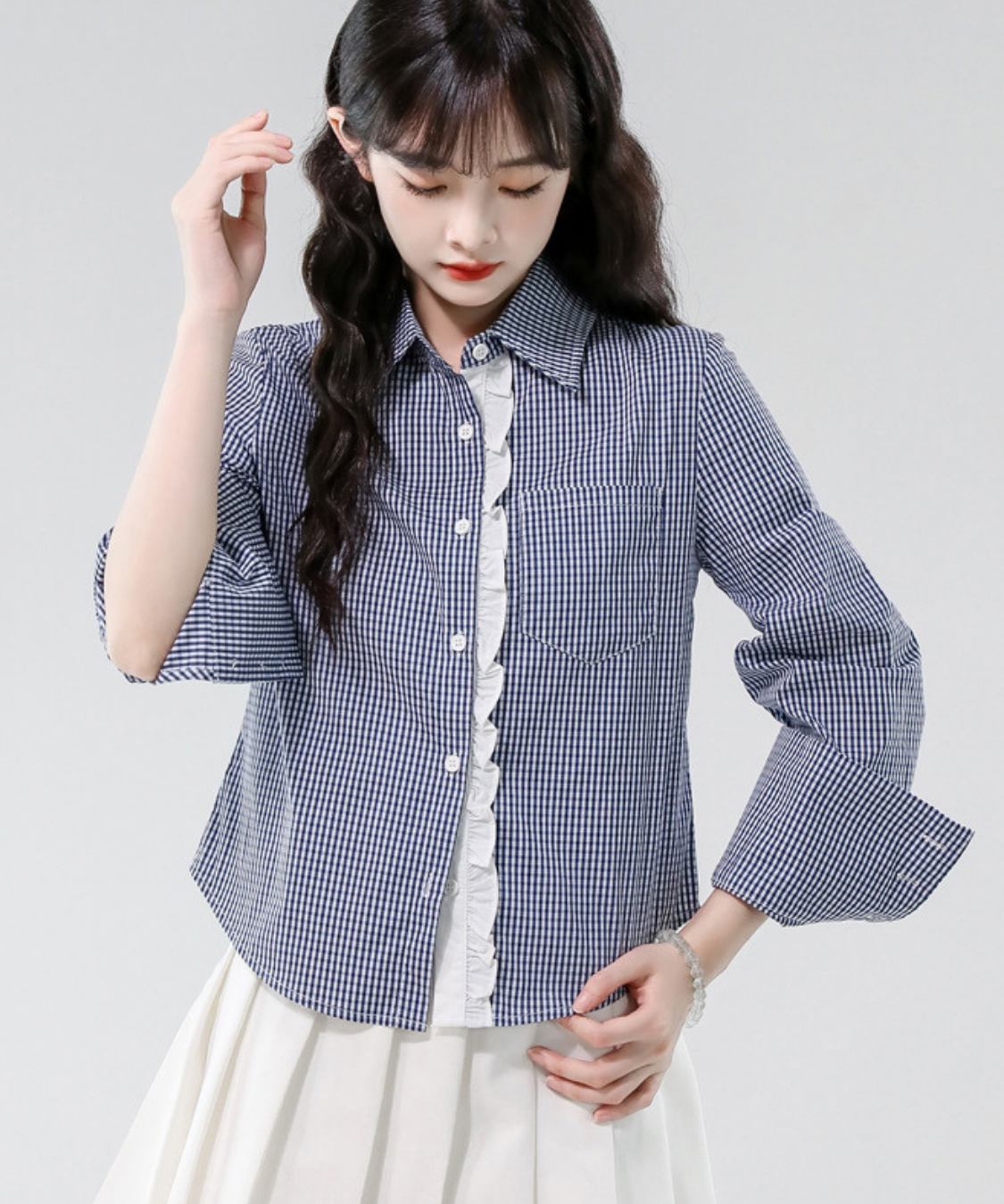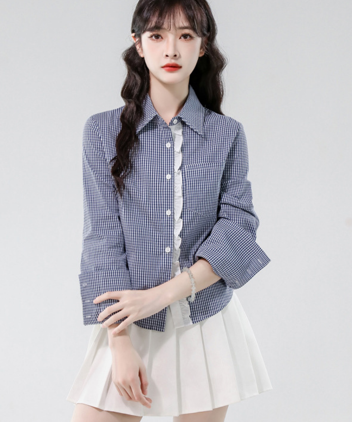 フロントのフリルがアクセントになったギンガムチェックシャツです。