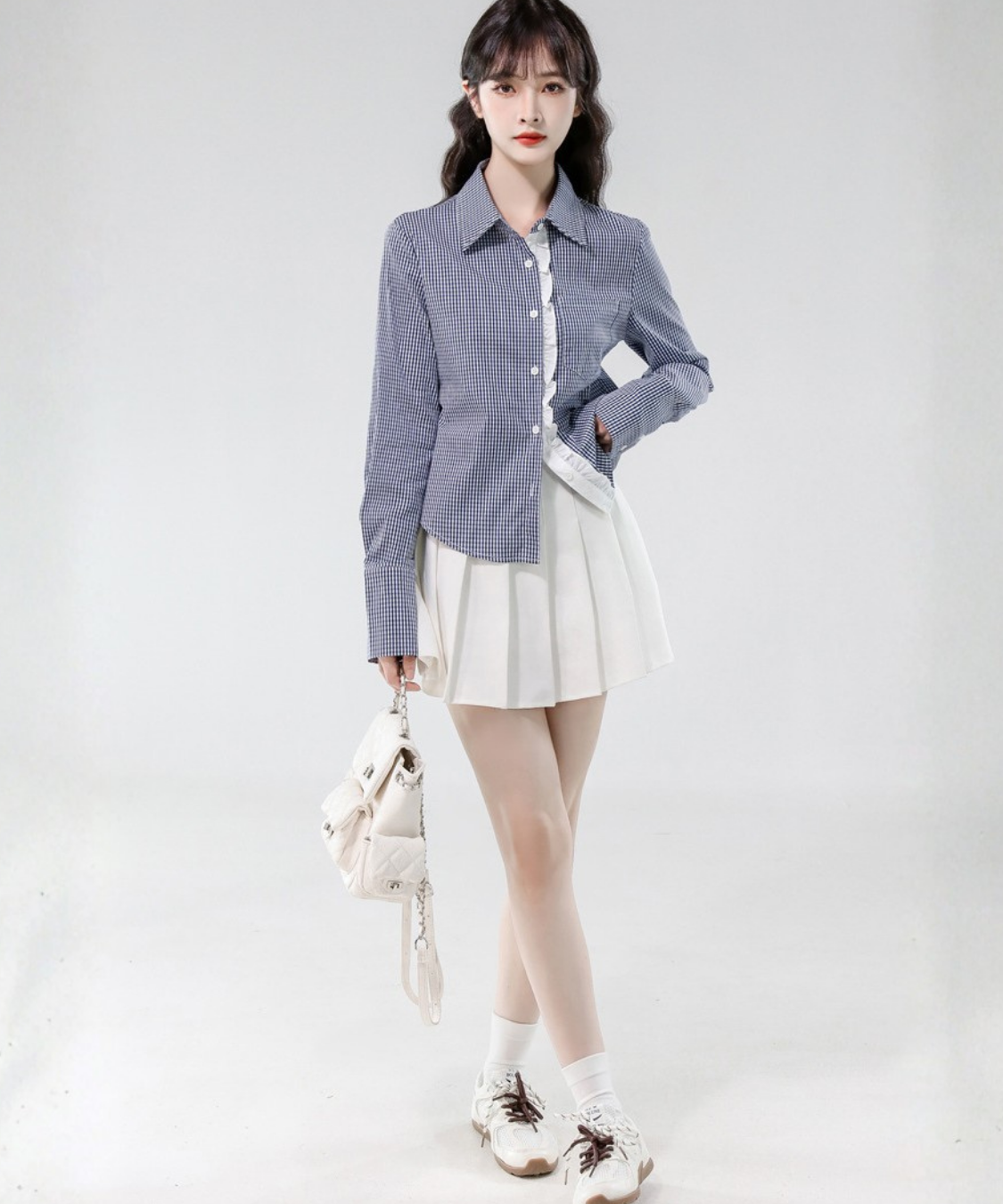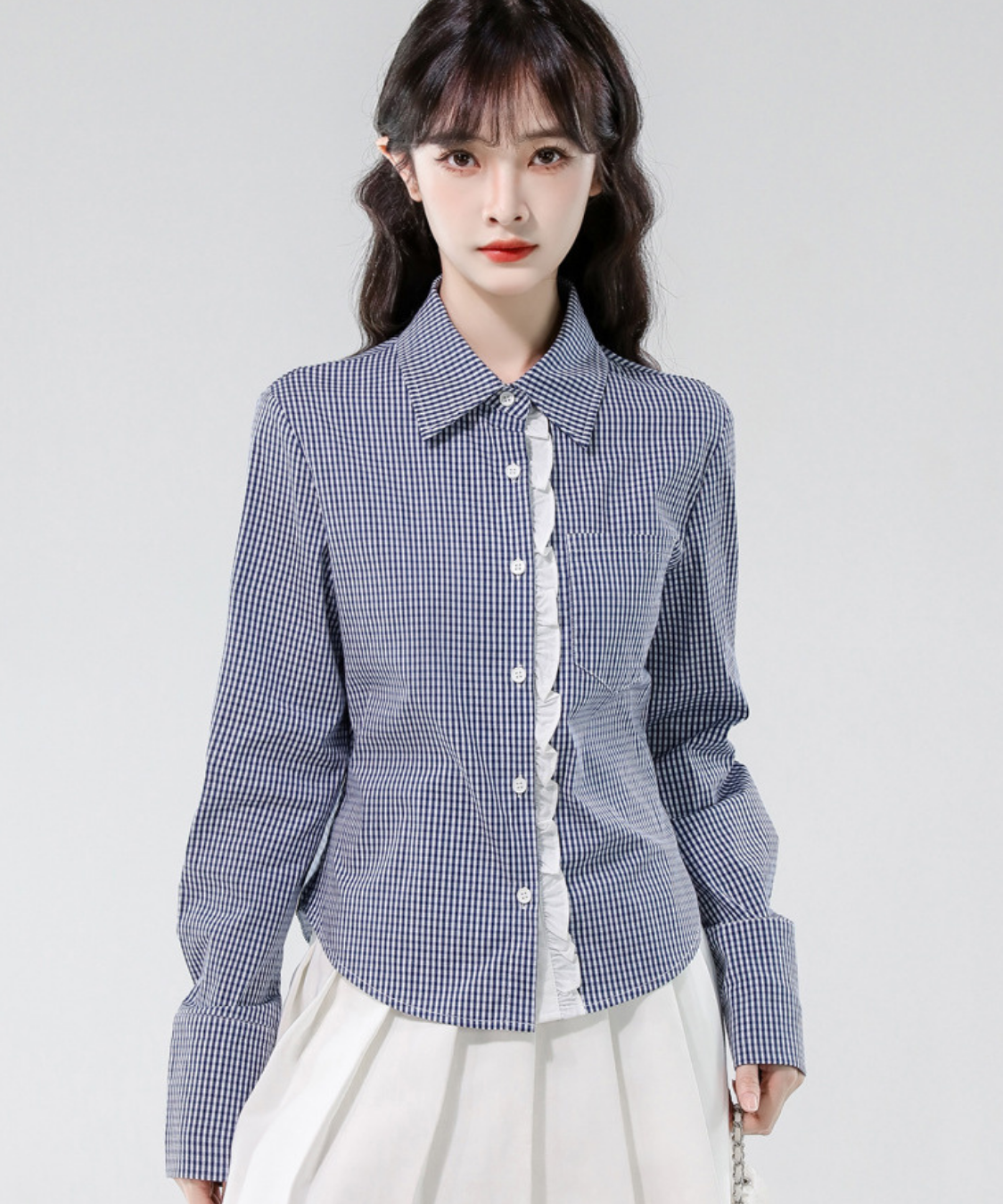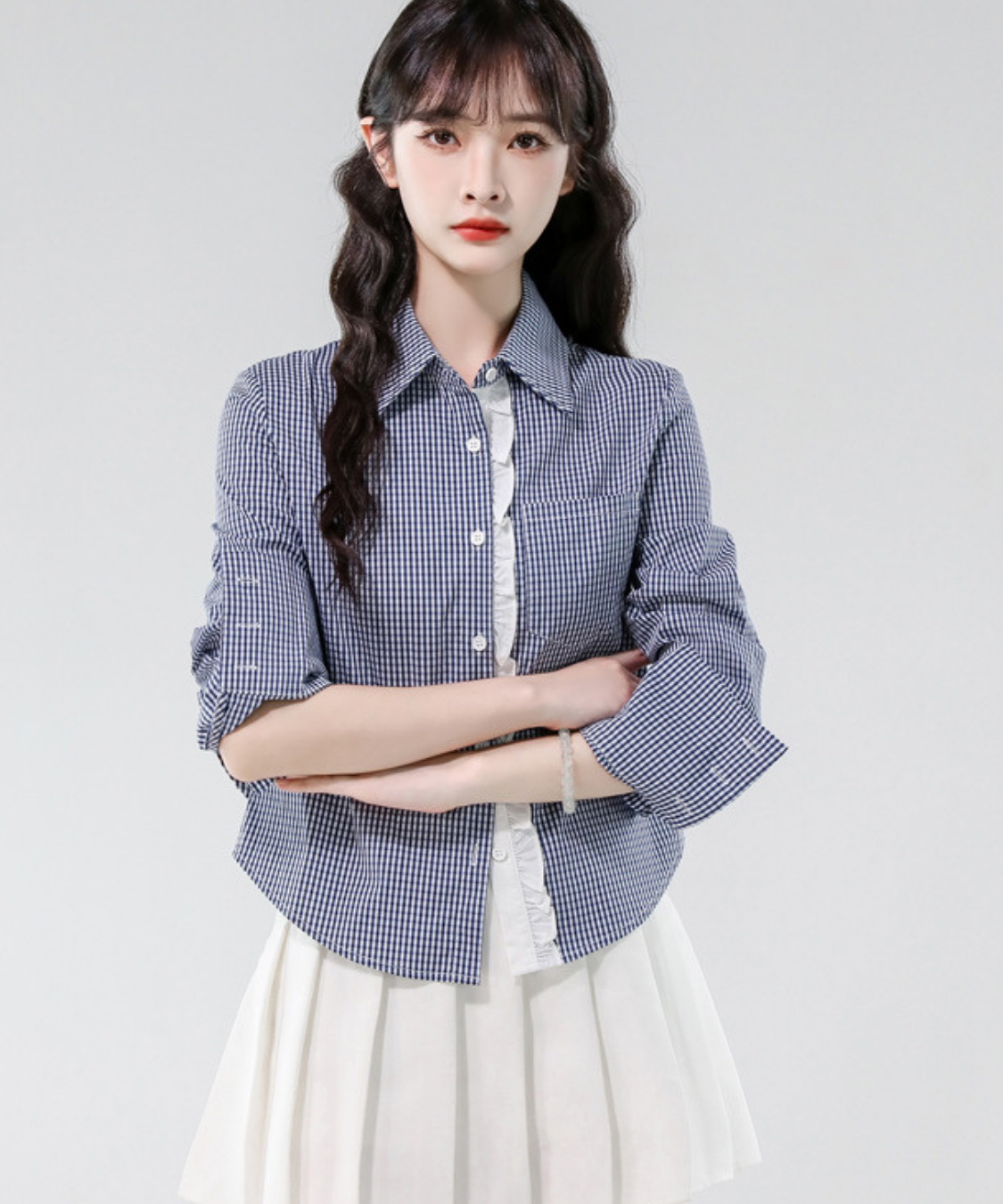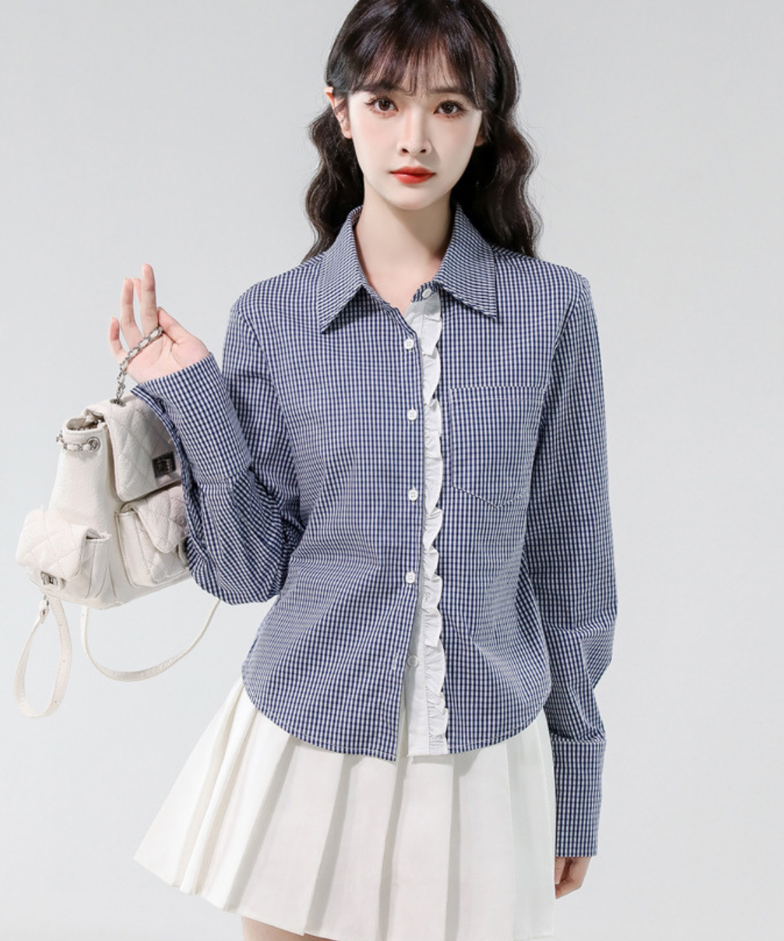 フロントのフリルがアクセントになったギンガムチェックシャツです。