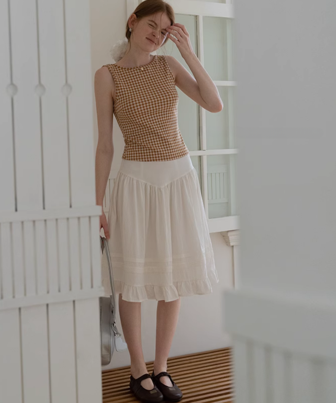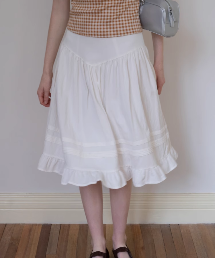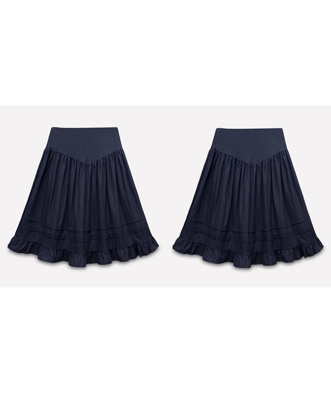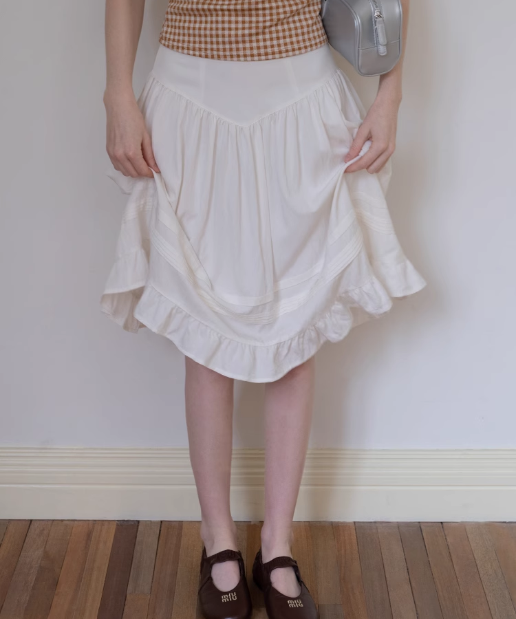 立体感のあるヨーク切り替えと裾のフリルが印象的なガーリースカートです。