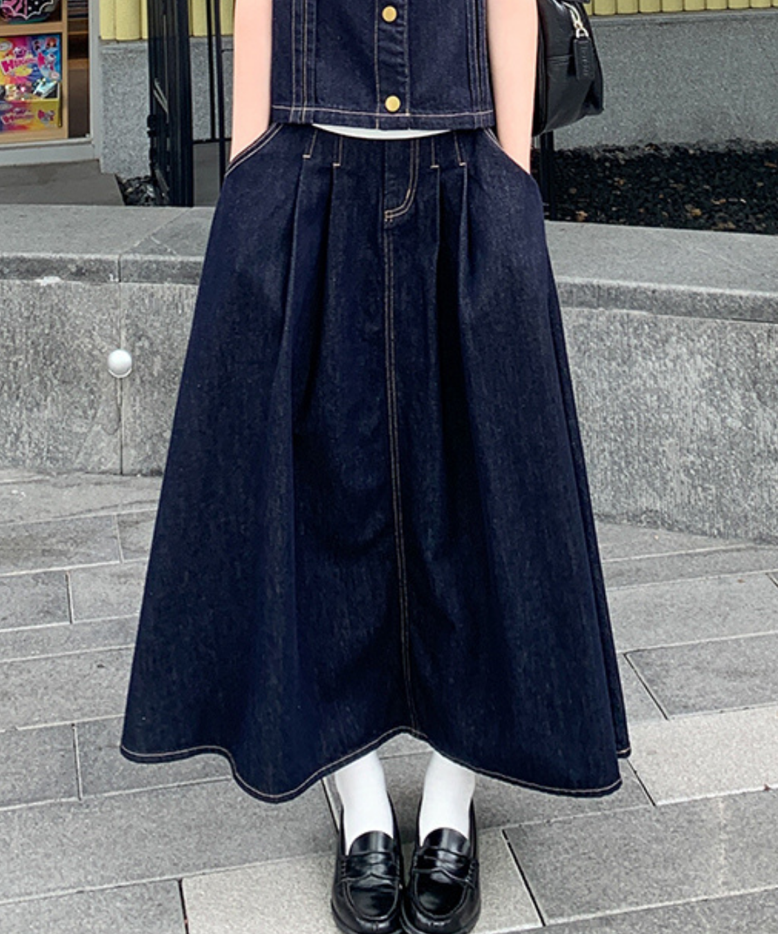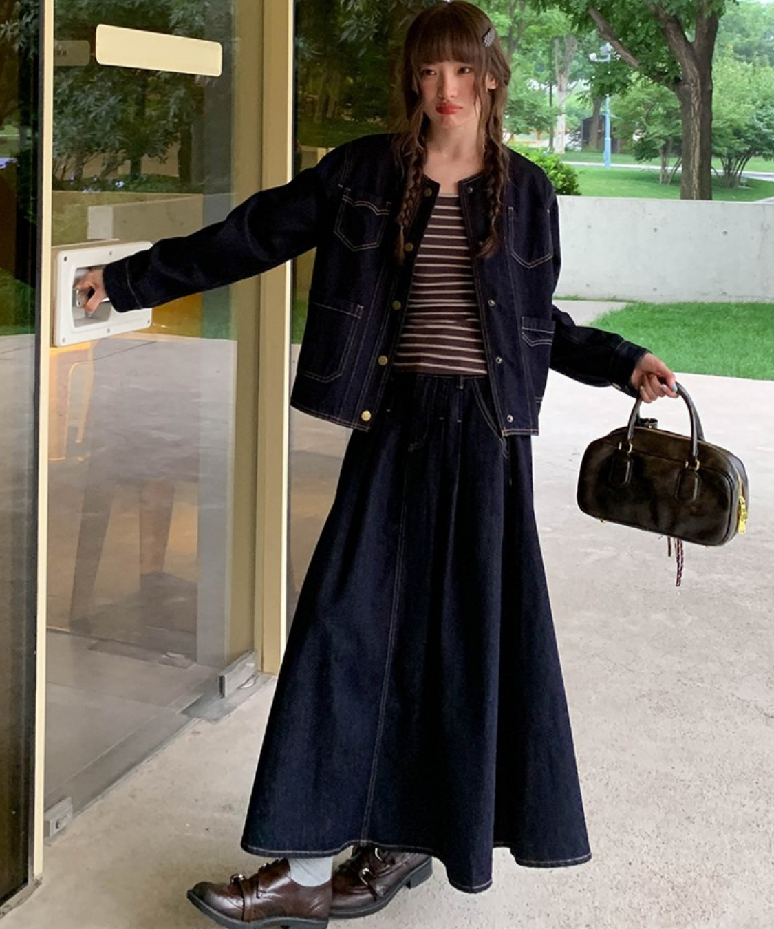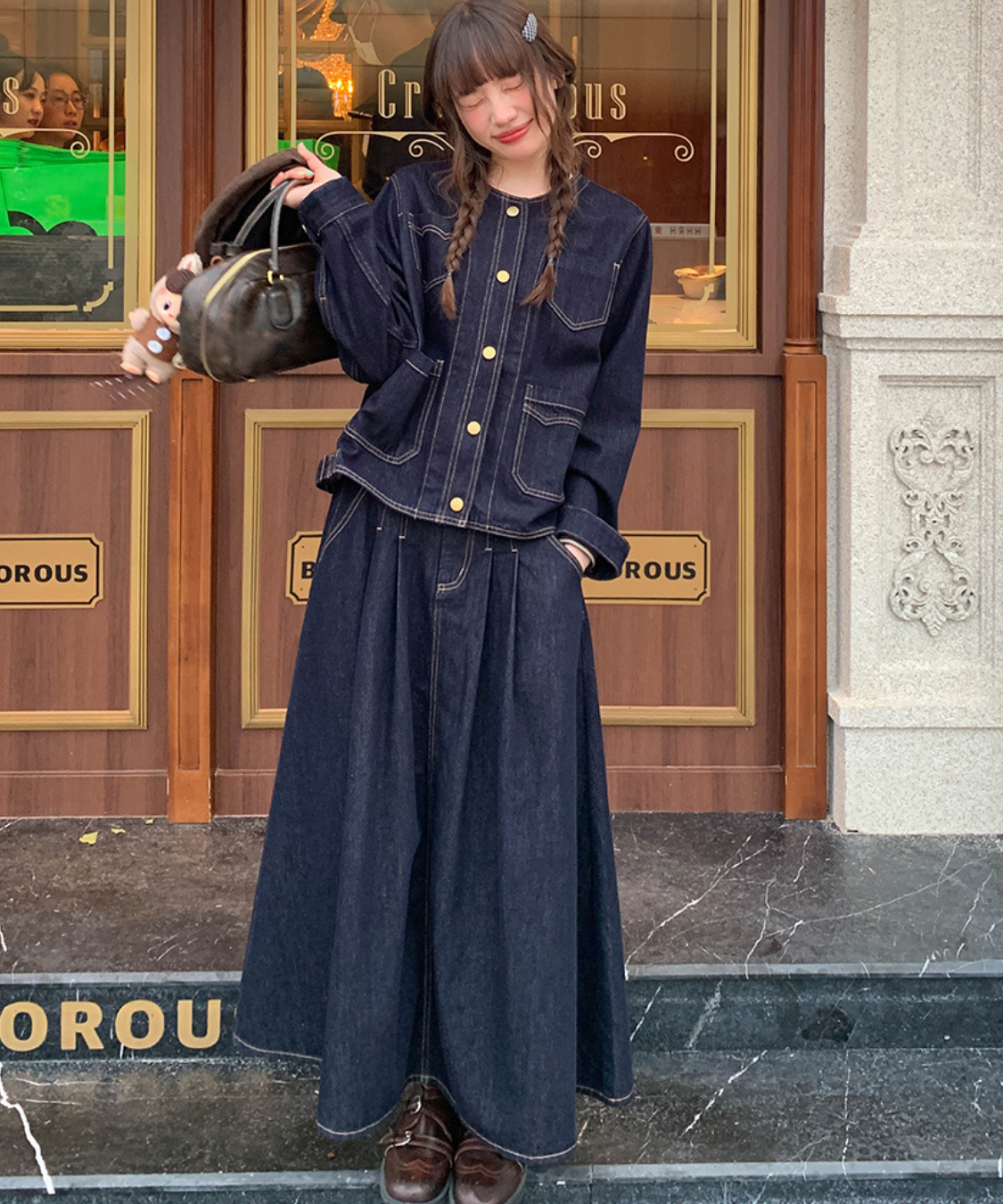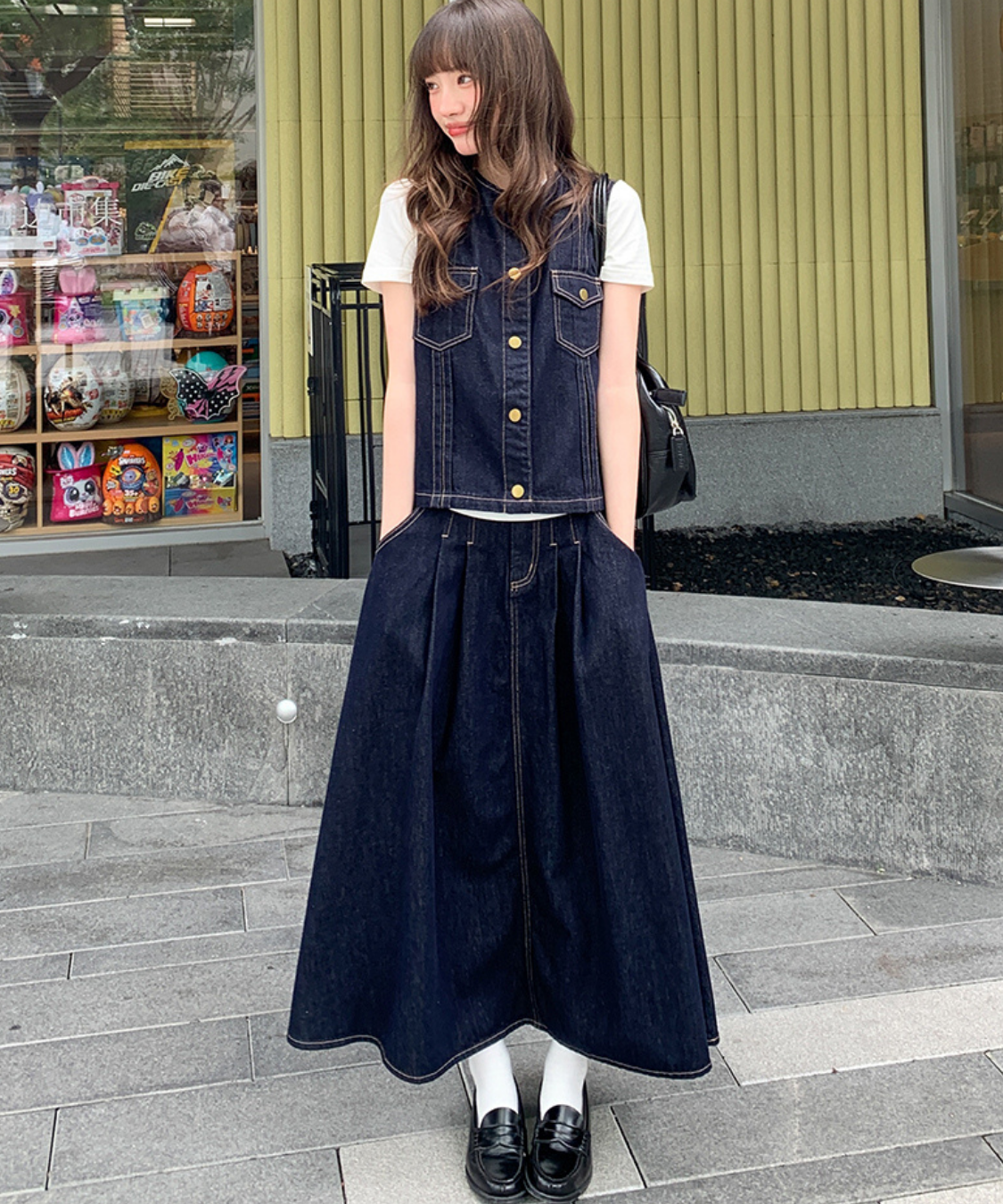 ステッチデザインAラインデニムスカート(セットアップ可)