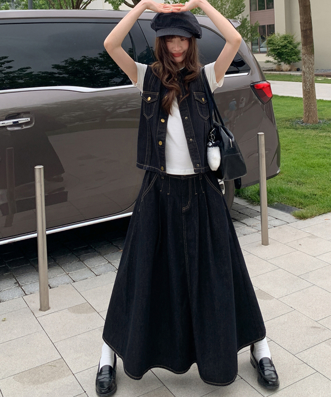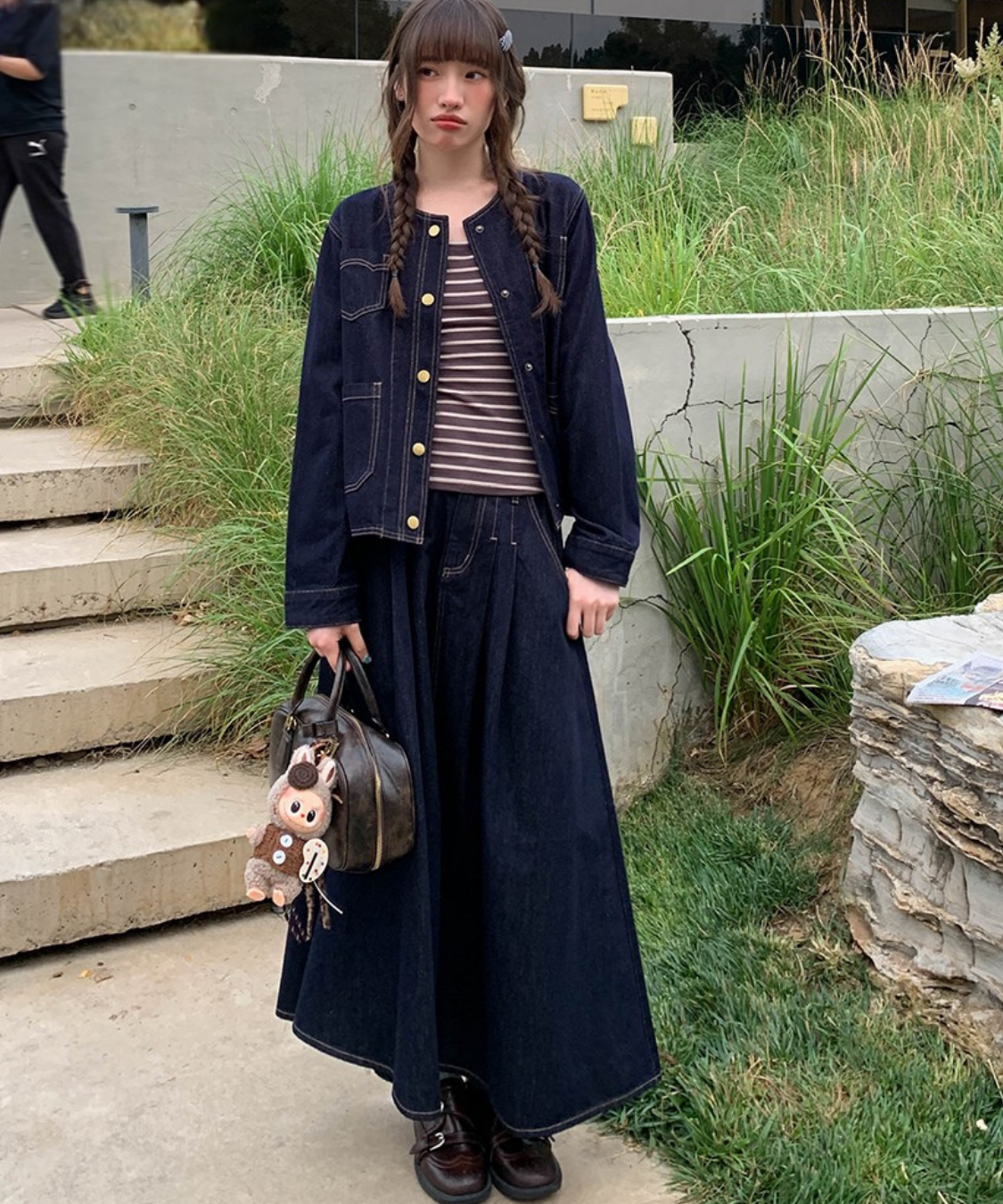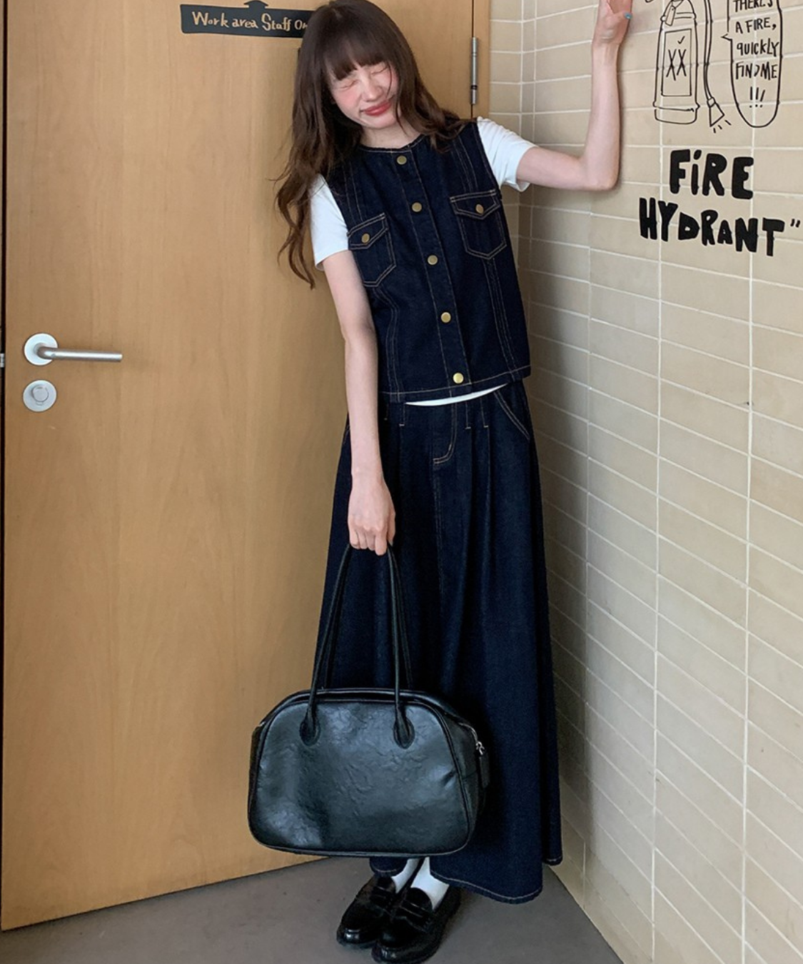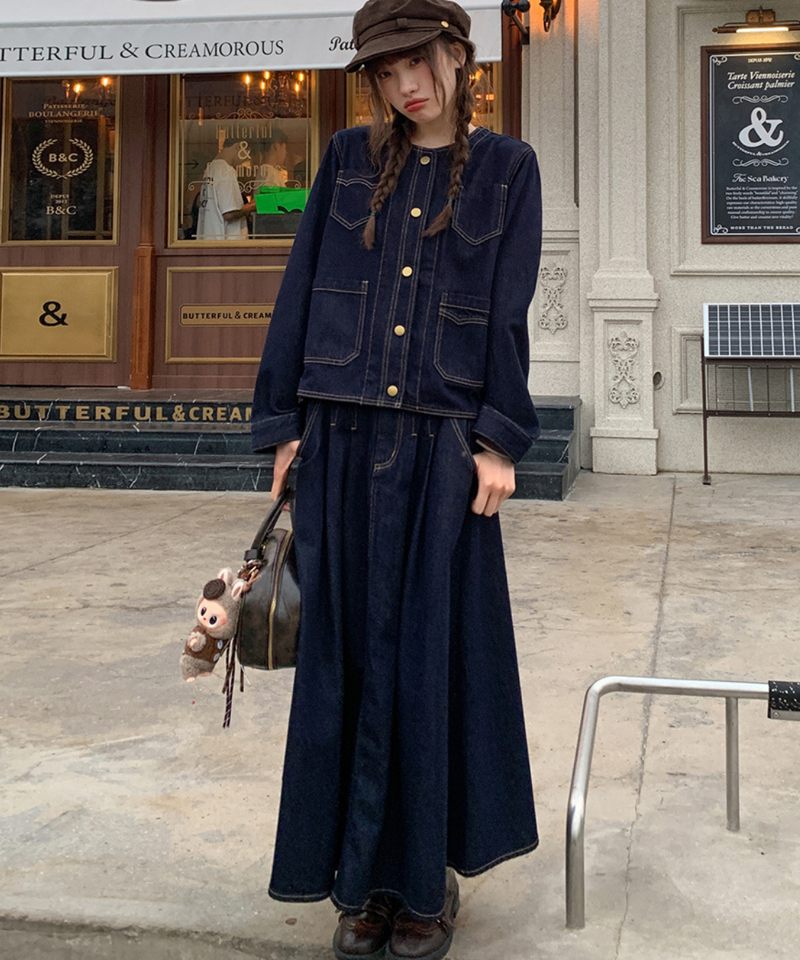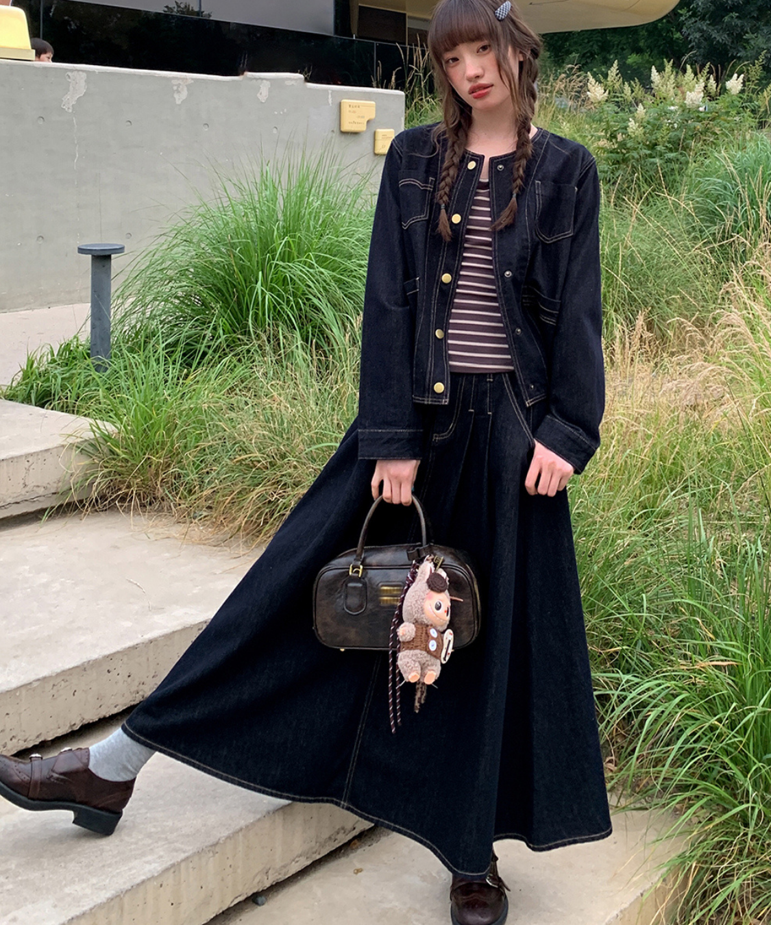 ステッチデザインAラインデニムスカート(セットアップ可)