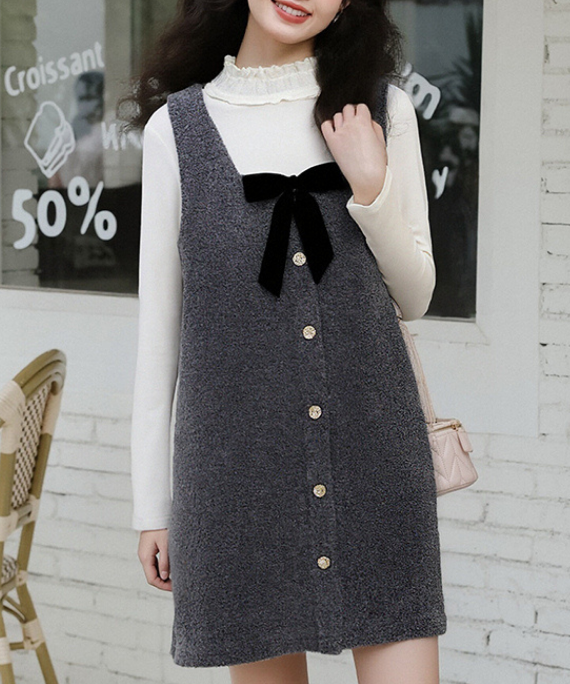フロントボタンと胸元のリボンがクラシカルな印象を与えるジャンパースカートです。