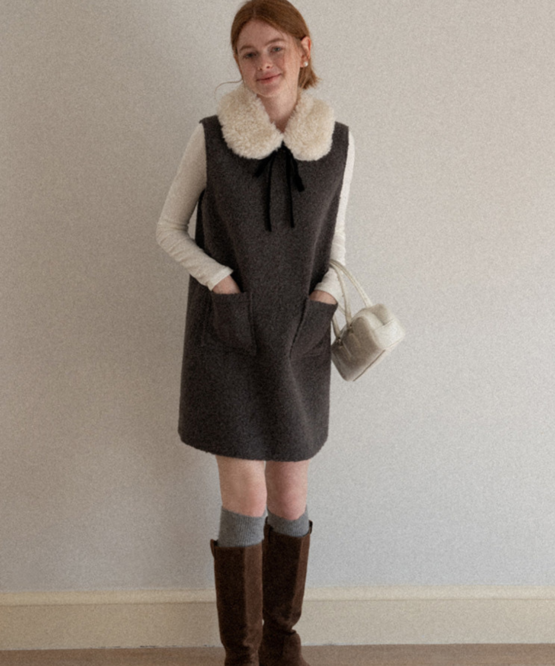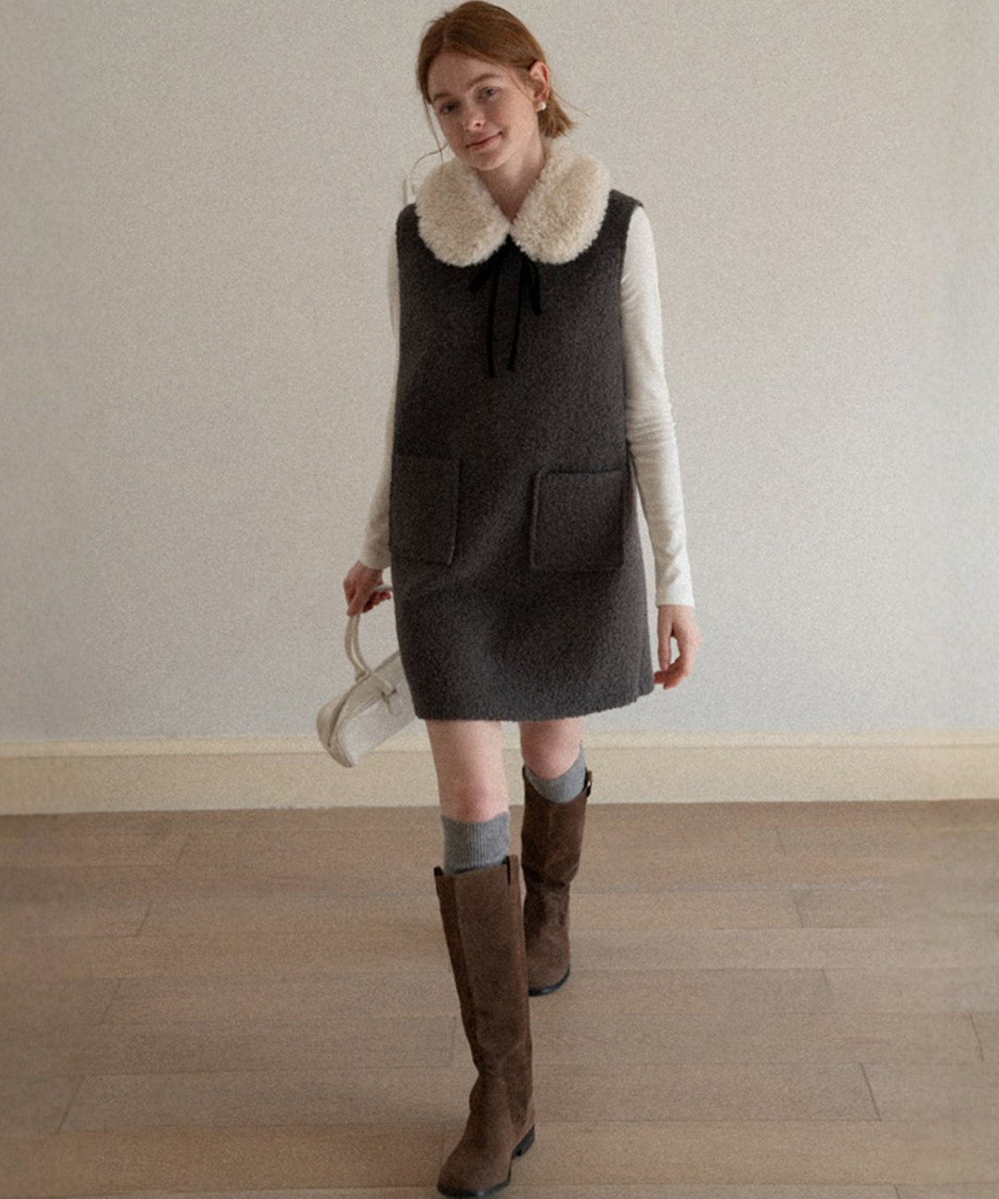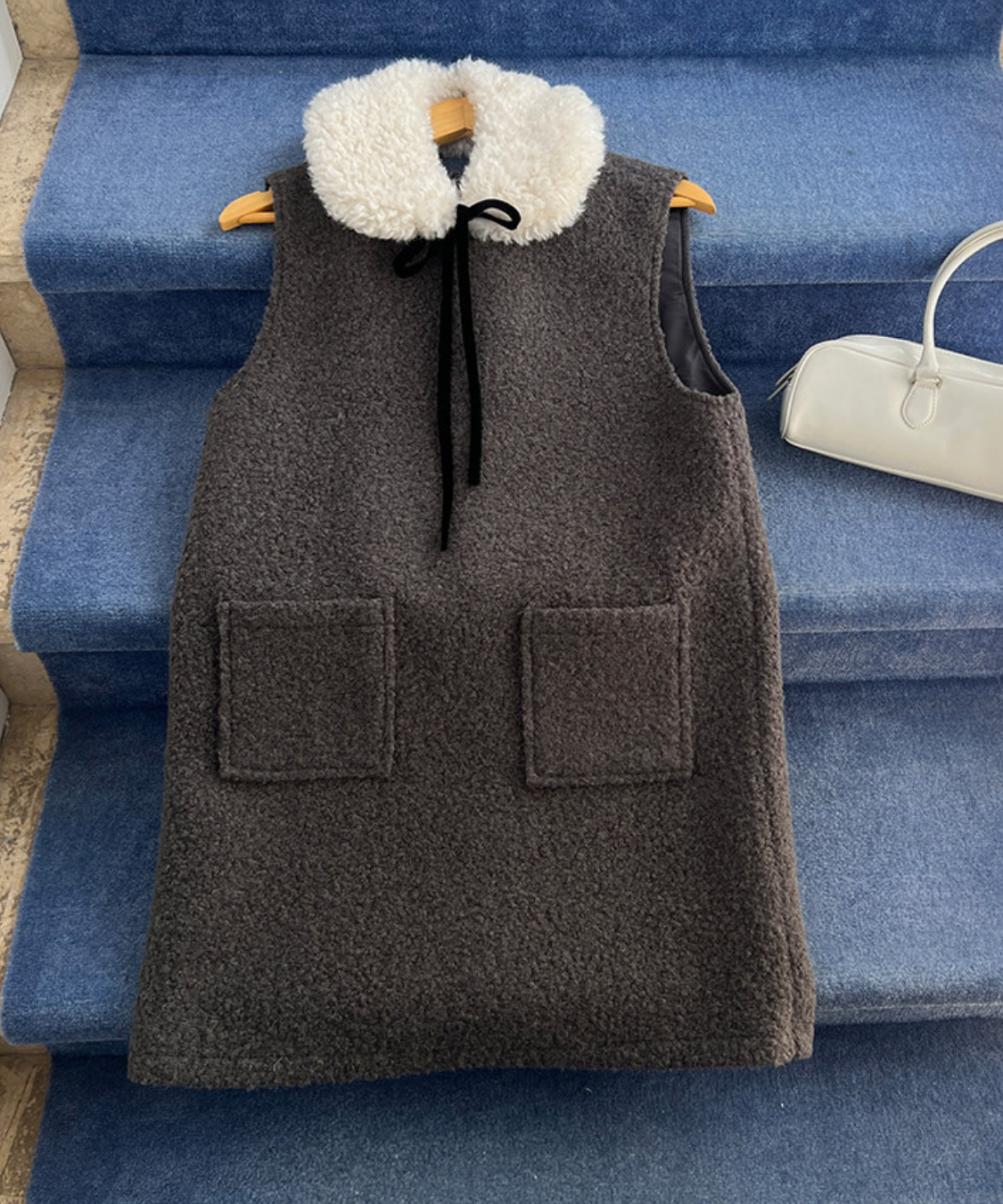 フェイクファーカラーリボンタイワンピース