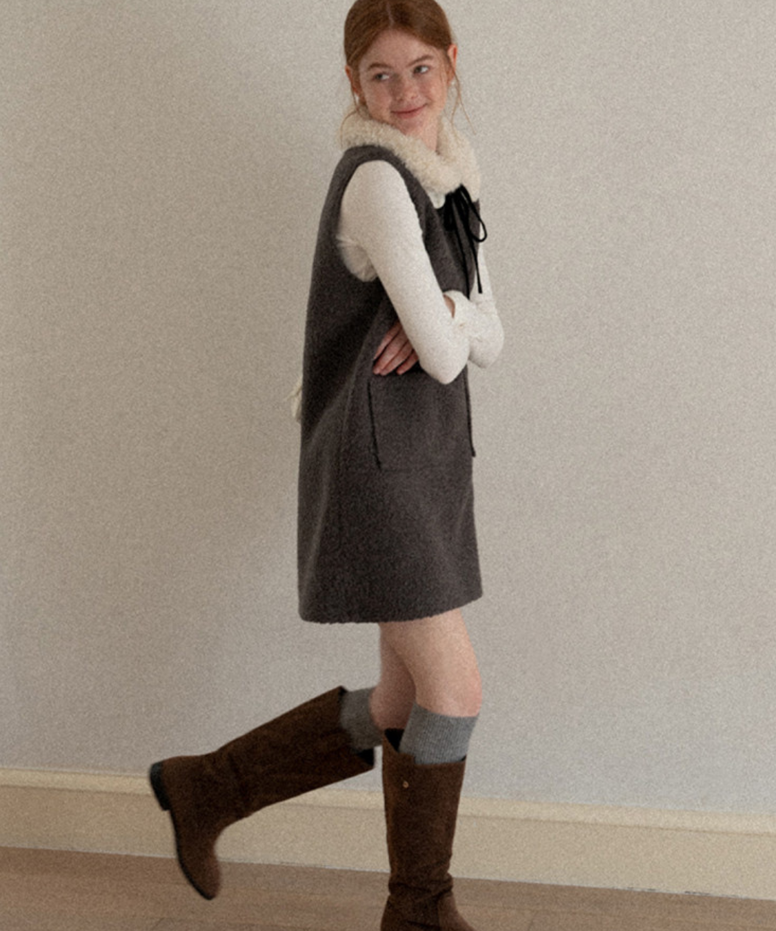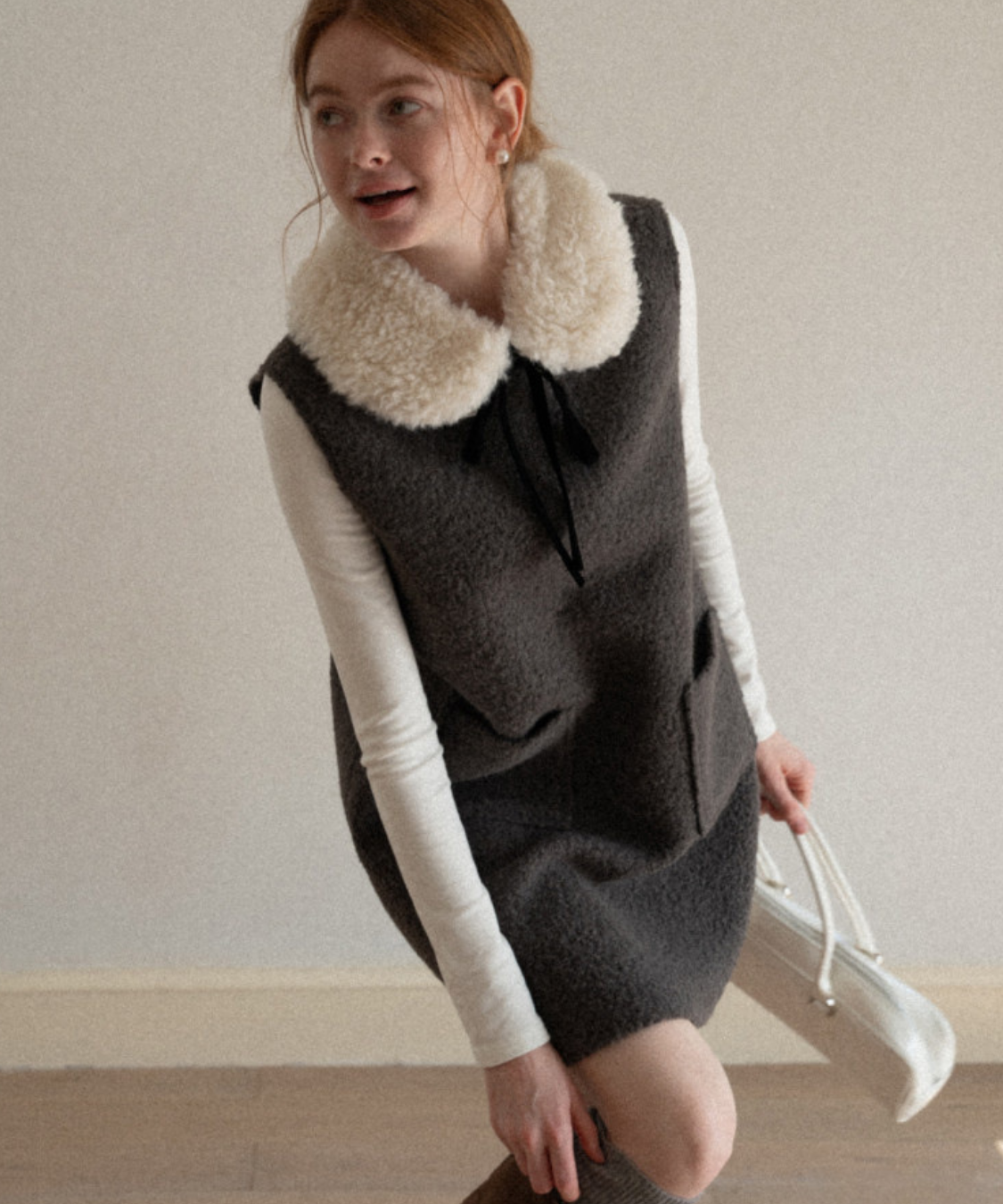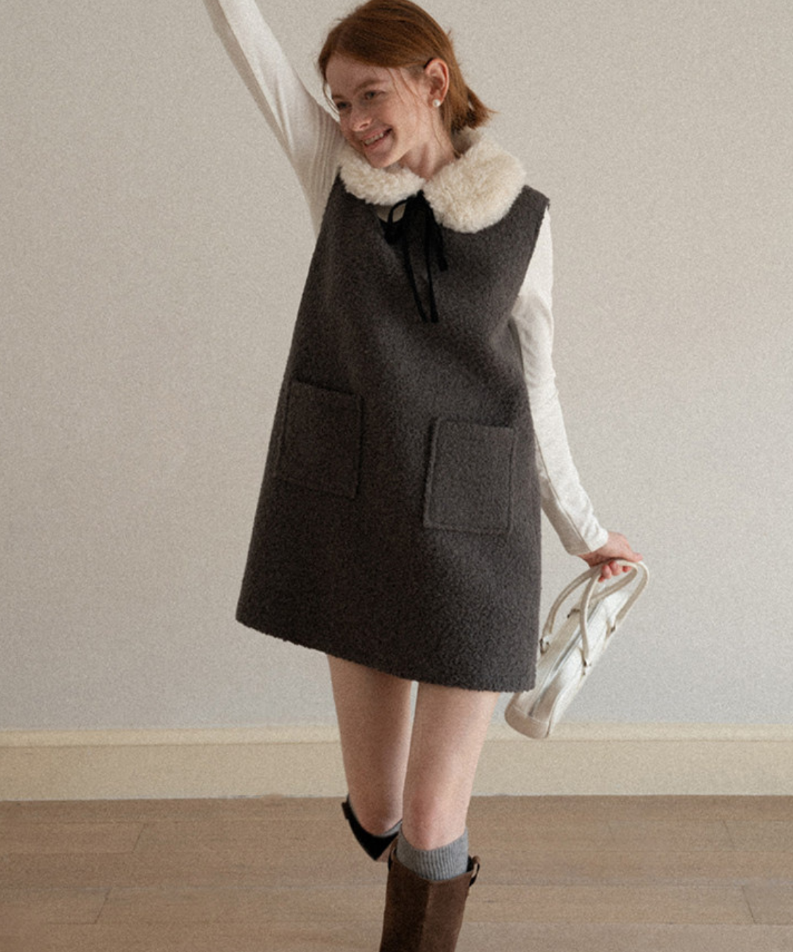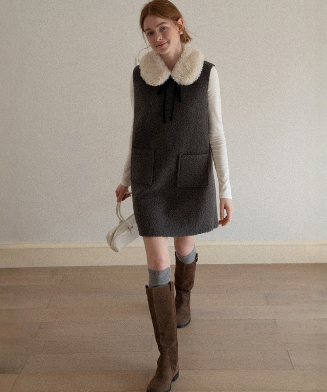 フェイクファーカラーリボンタイワンピース