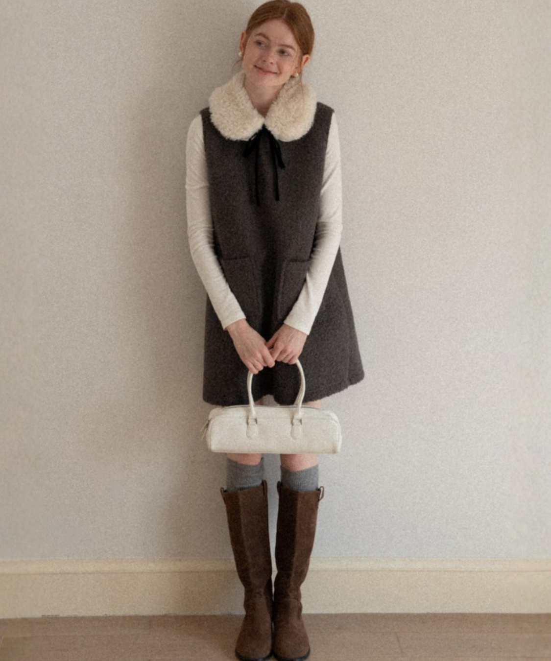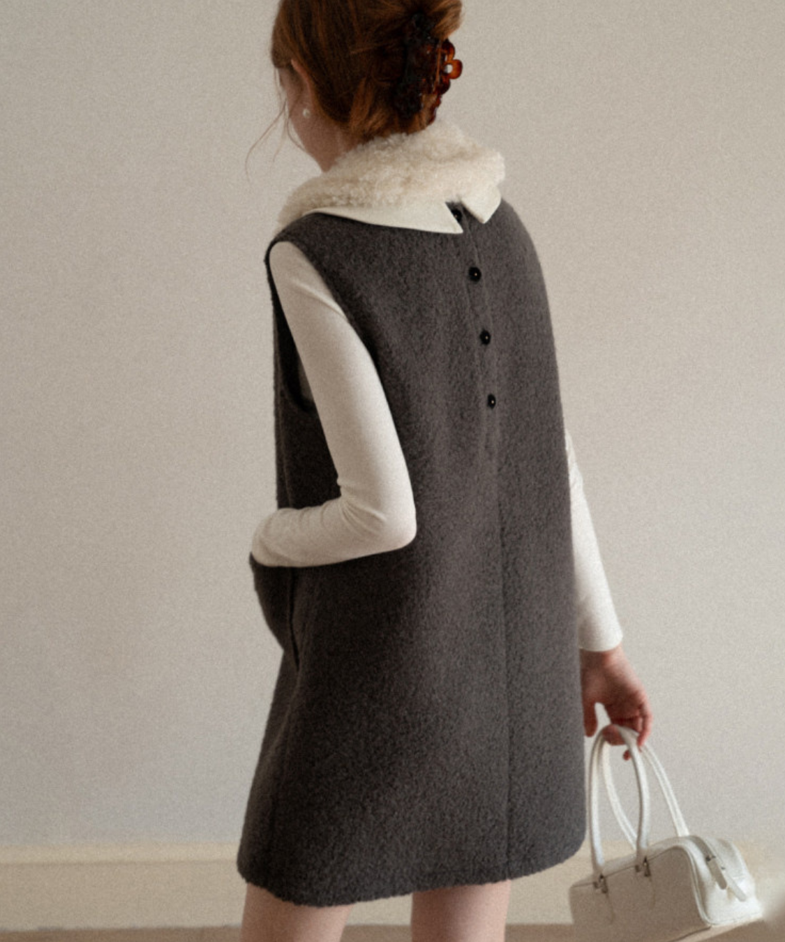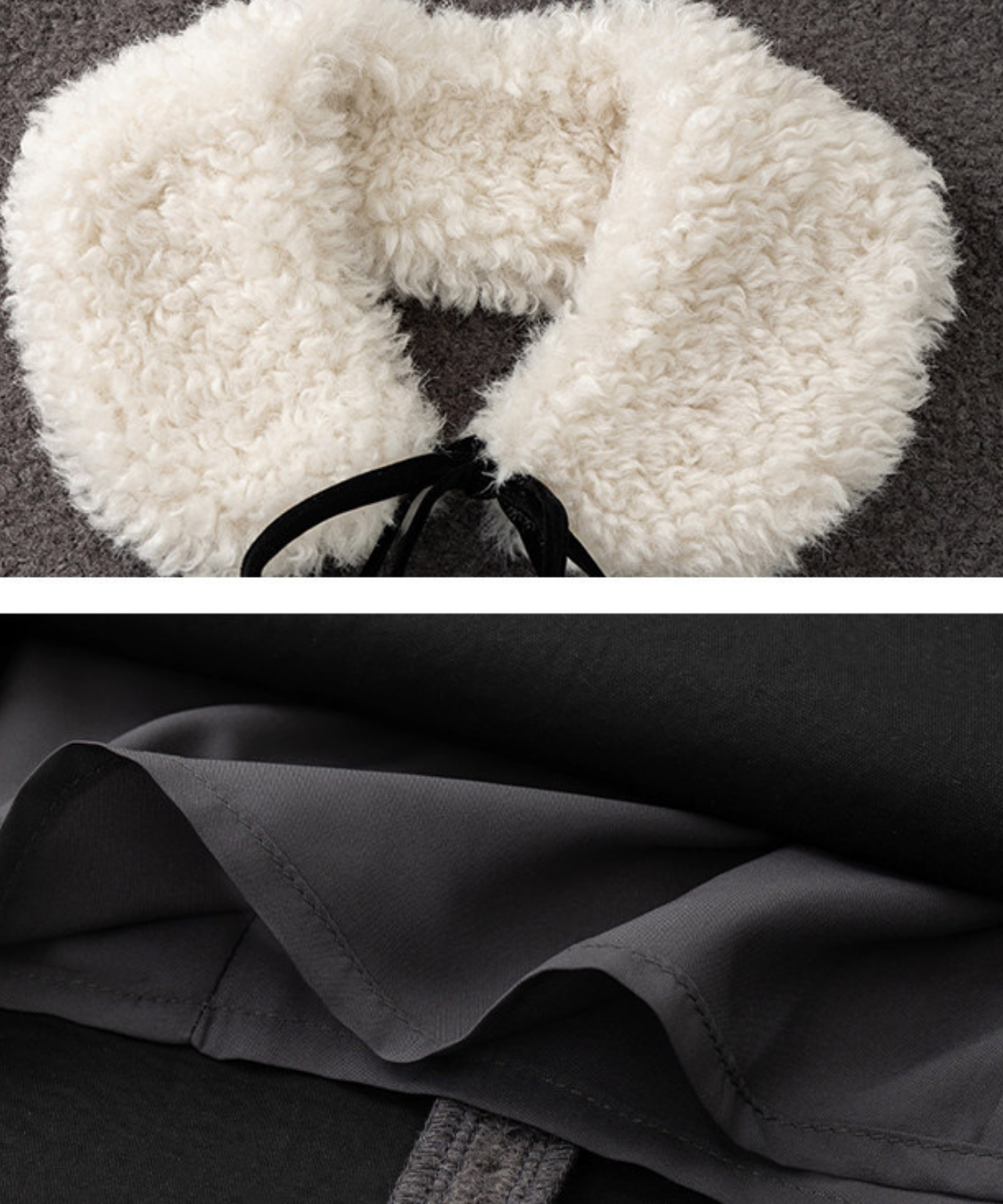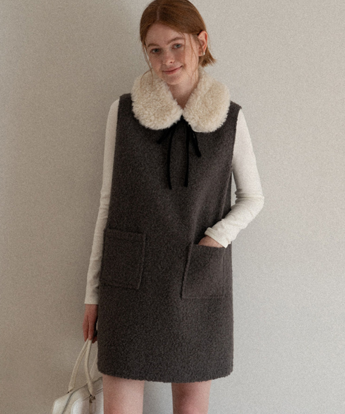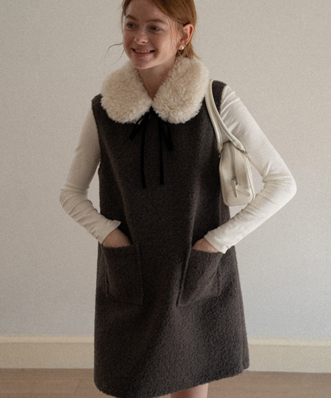 ふわふわのフェイクファーカラーとリボンタイがポイントのクラシカルなワンピースです。