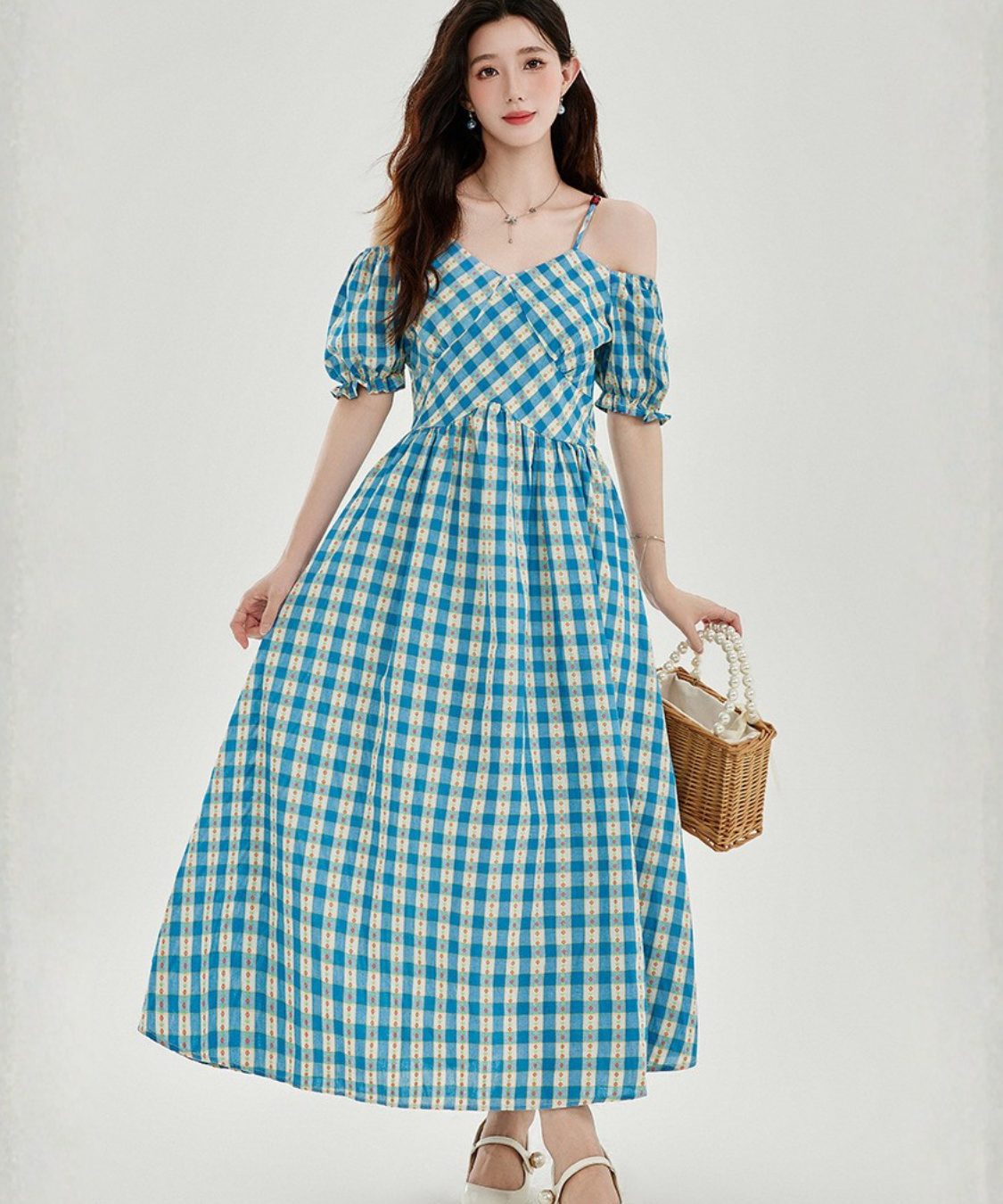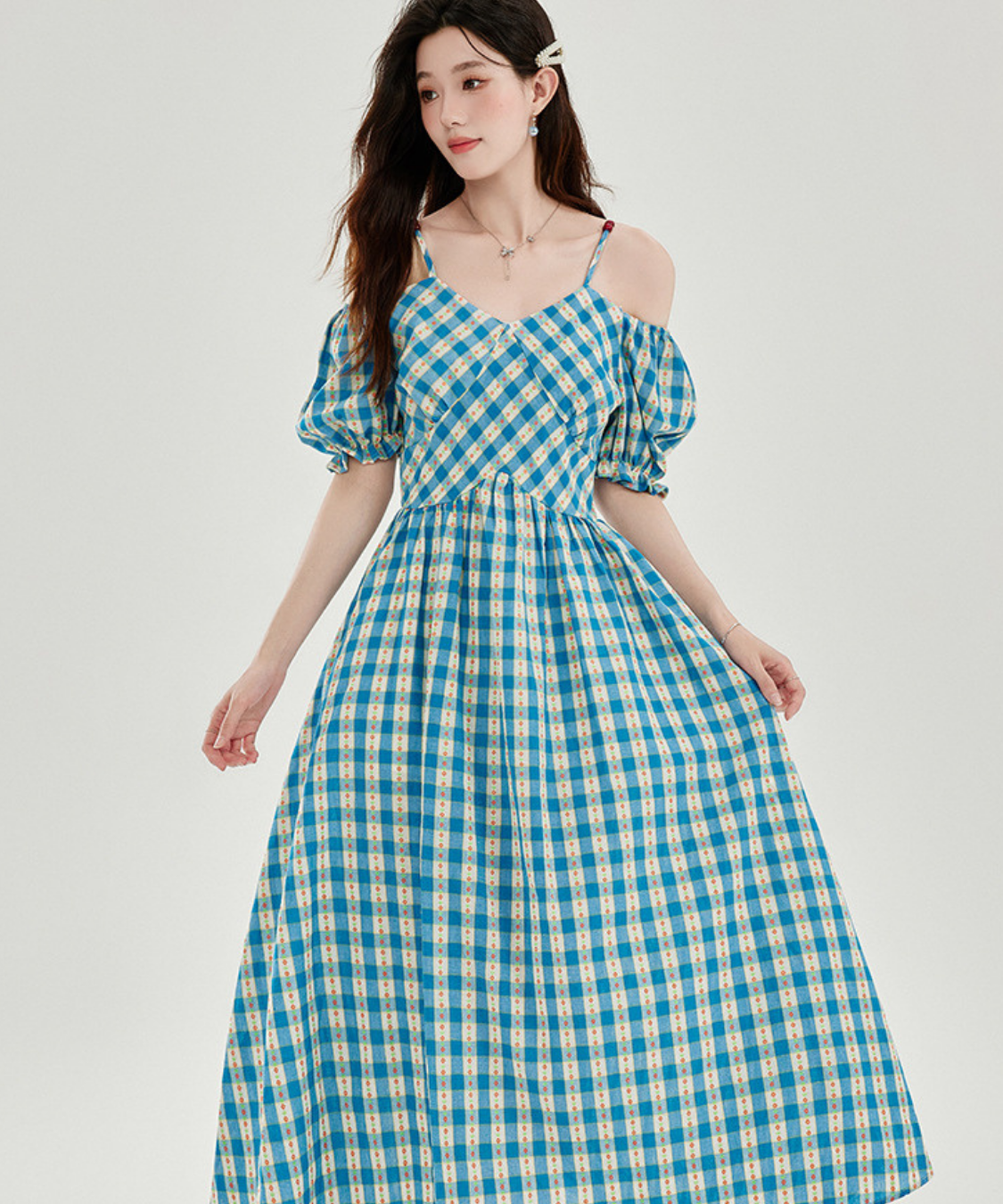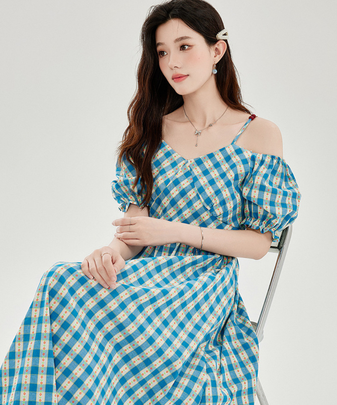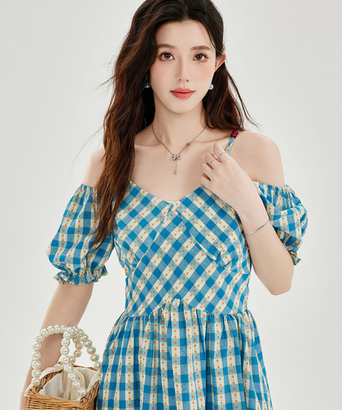 爽やかなチェック柄とオフショルダーデザインが目を惹くワンピースです。