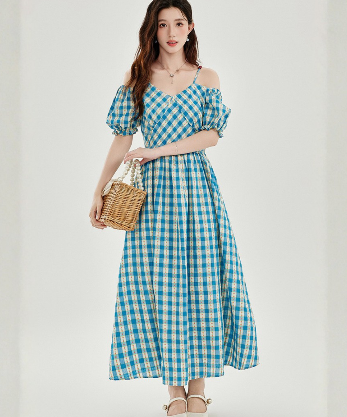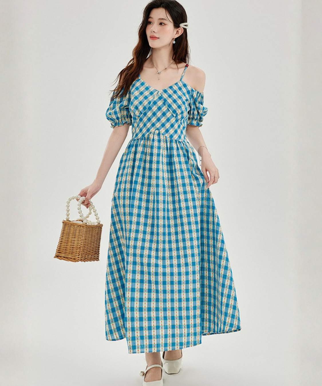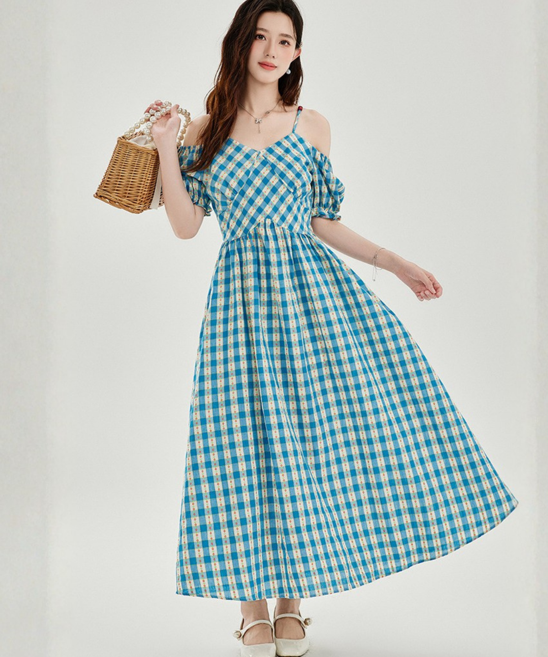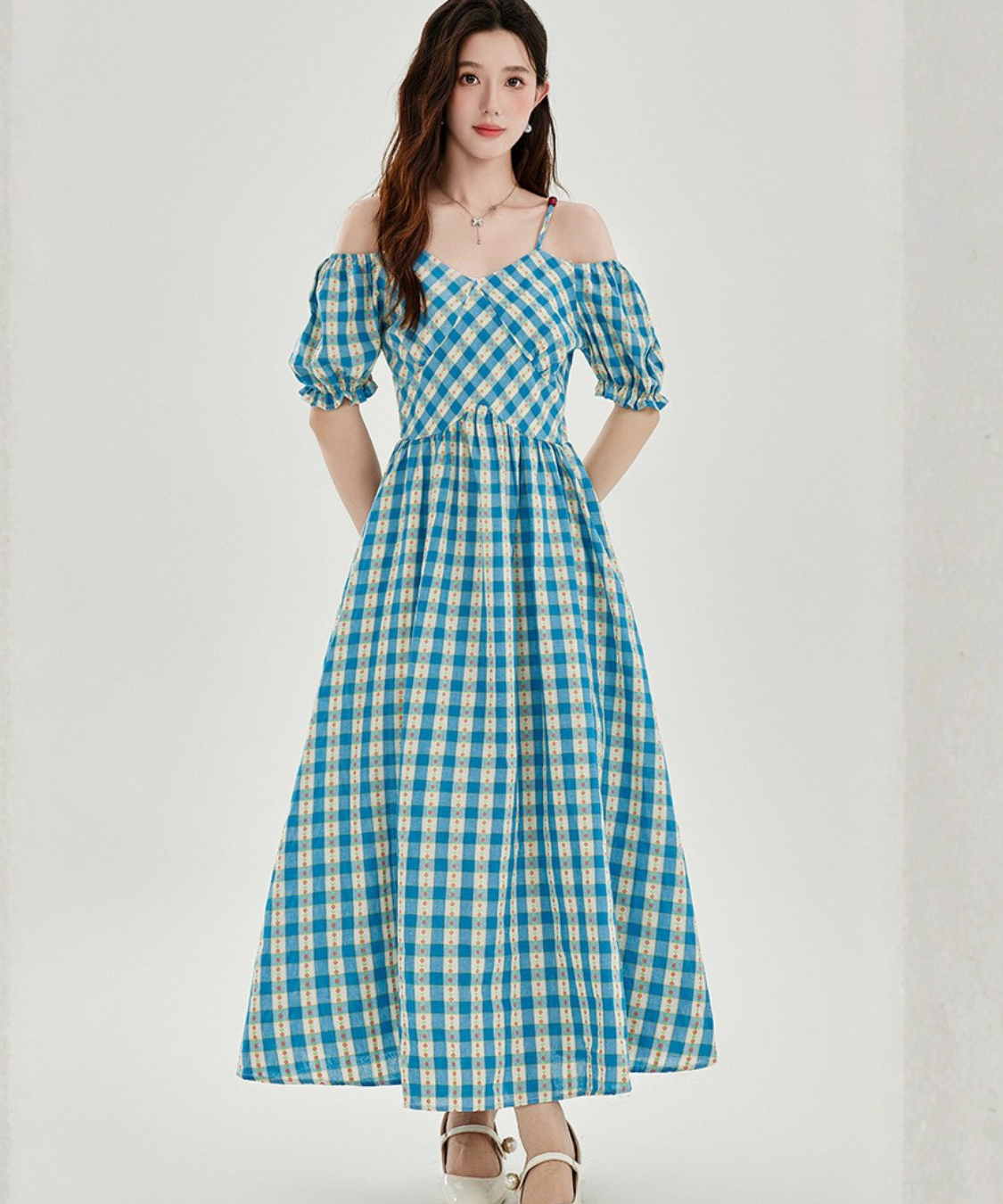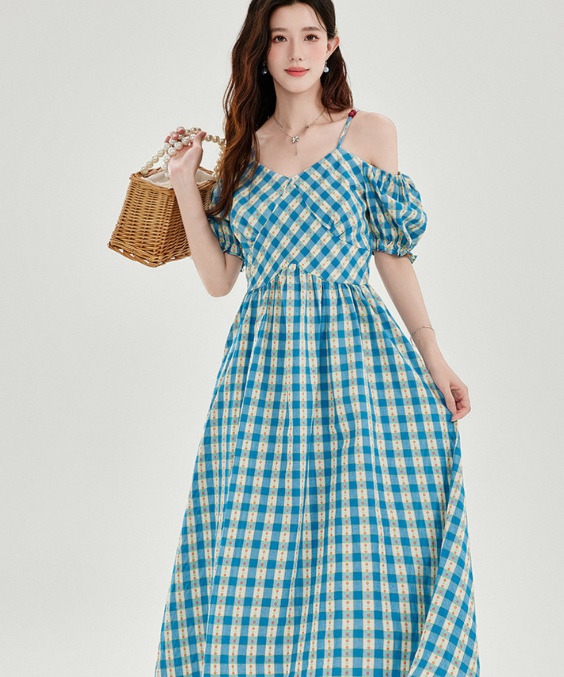 爽やかなチェック柄とオフショルダーデザインが目を惹くワンピースです。
