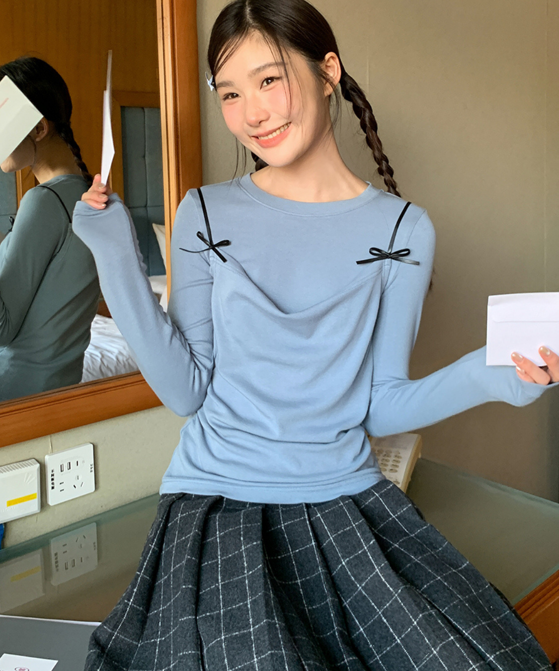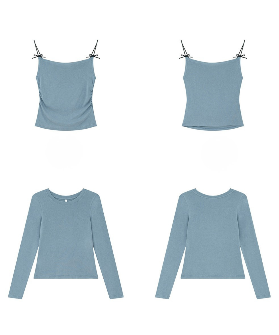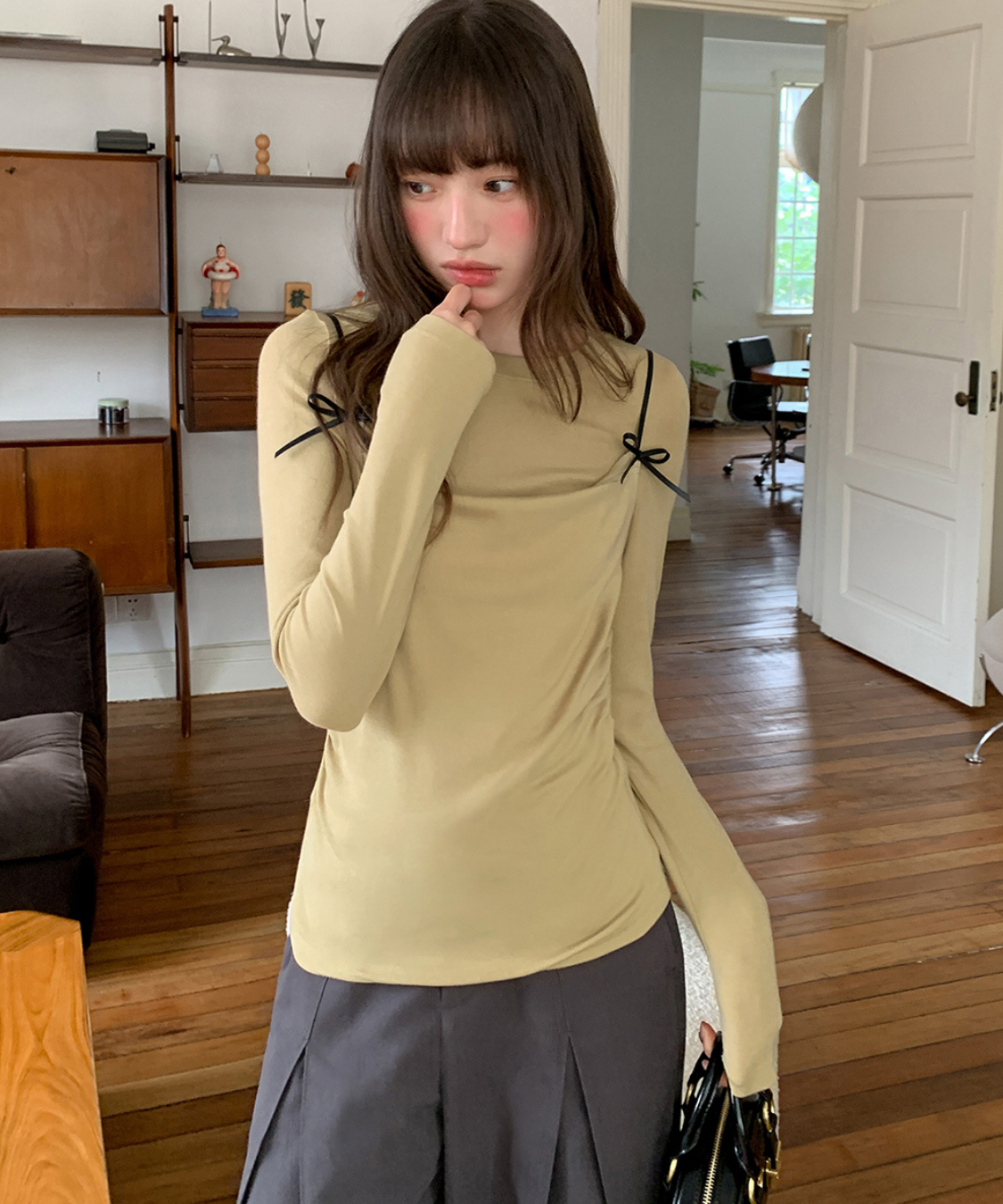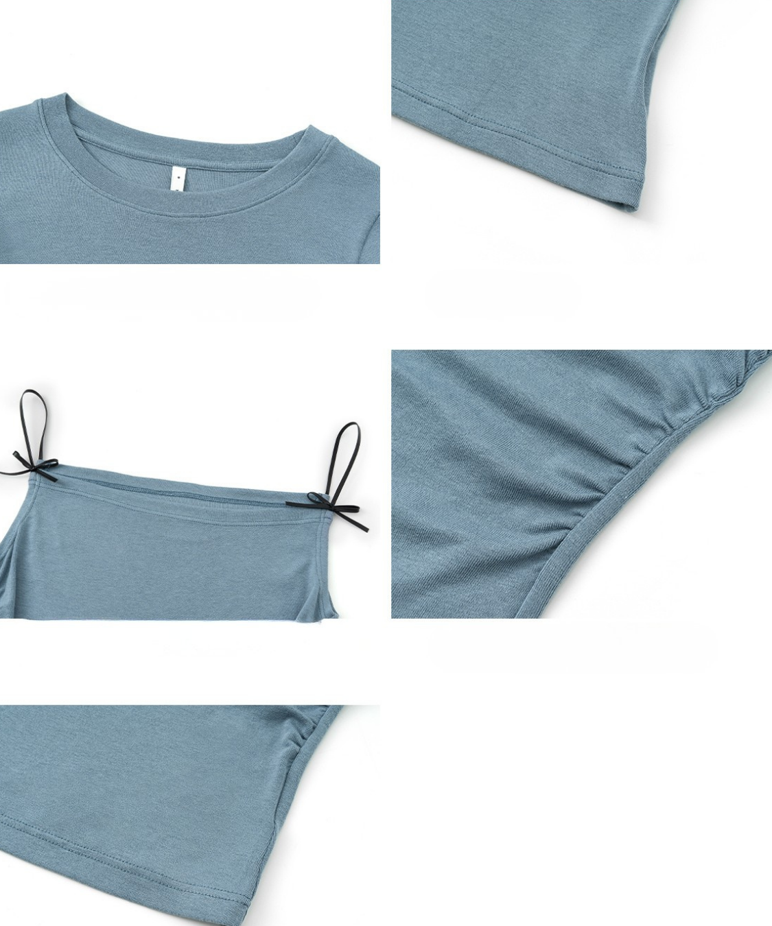 肩リボンが可愛いキャミ風トップスと、シンプルなカットソーのレイヤードセットです。