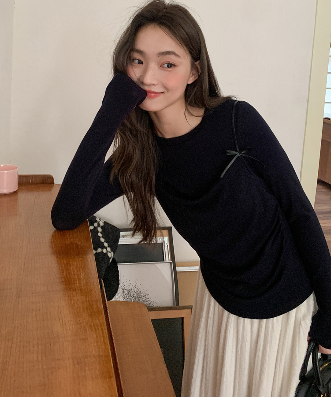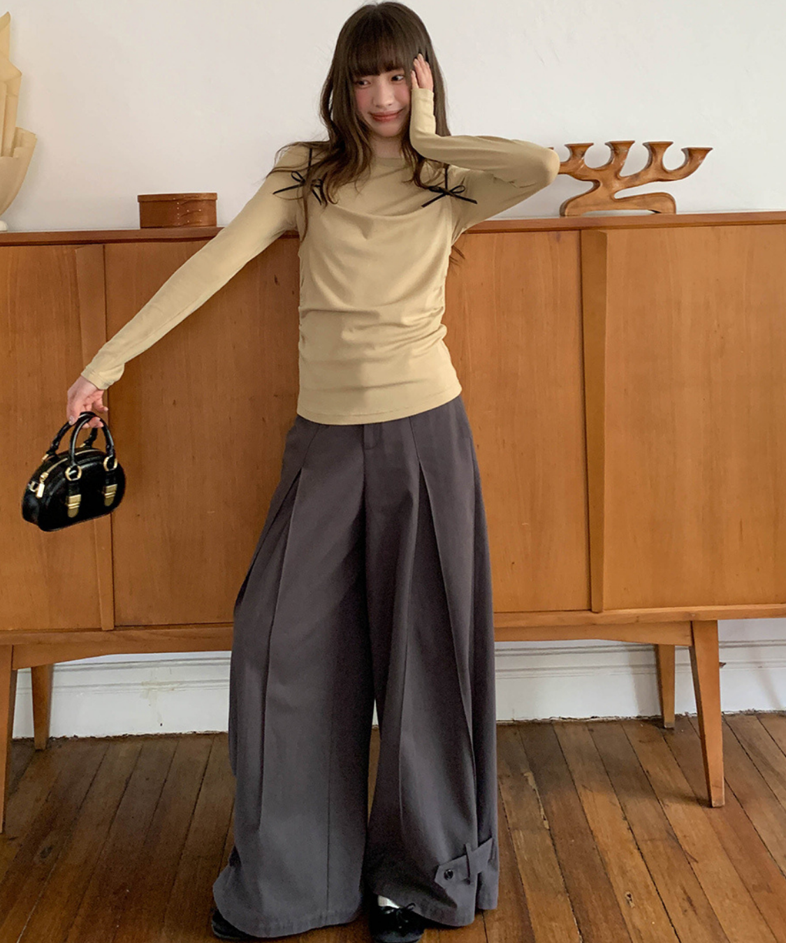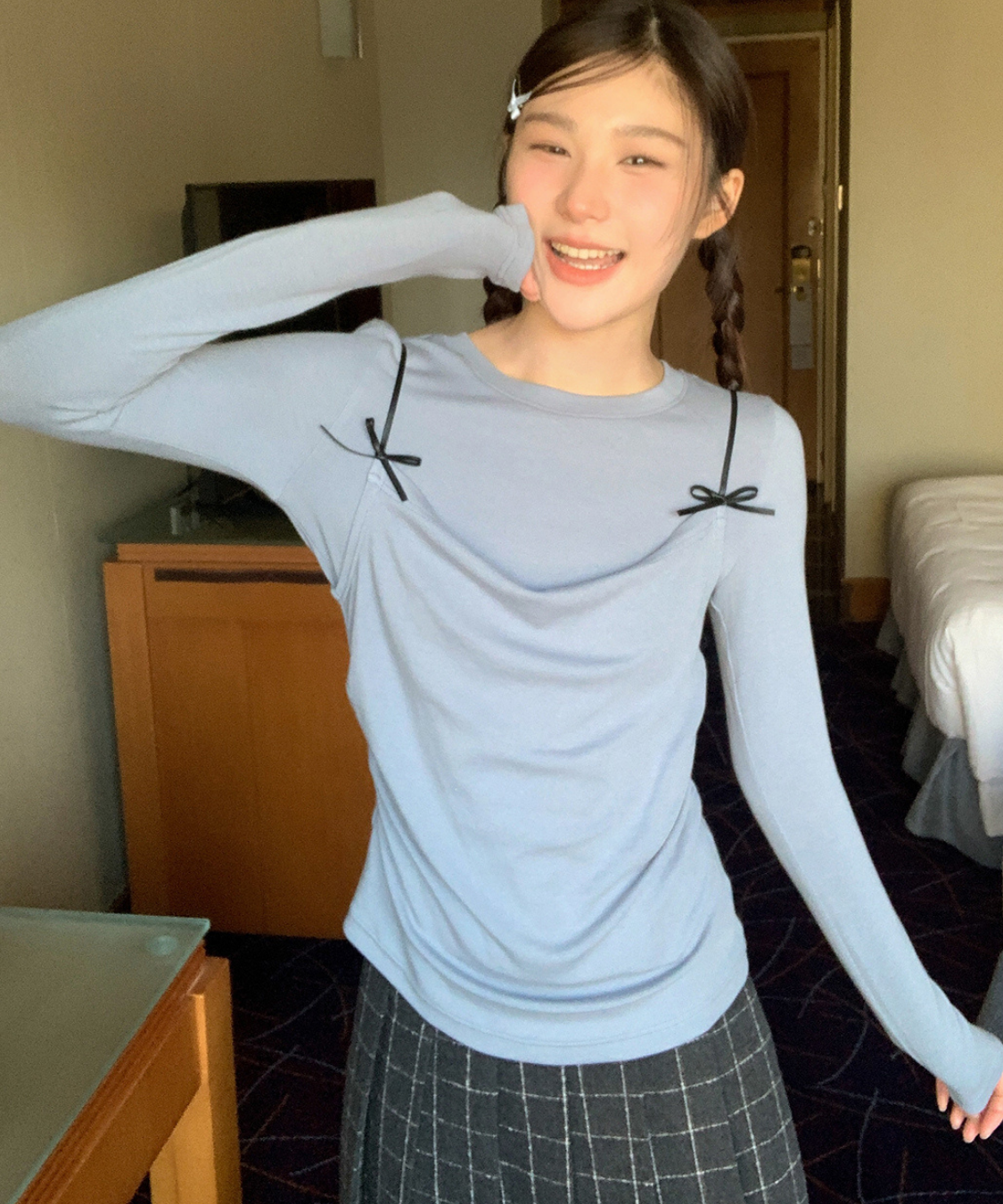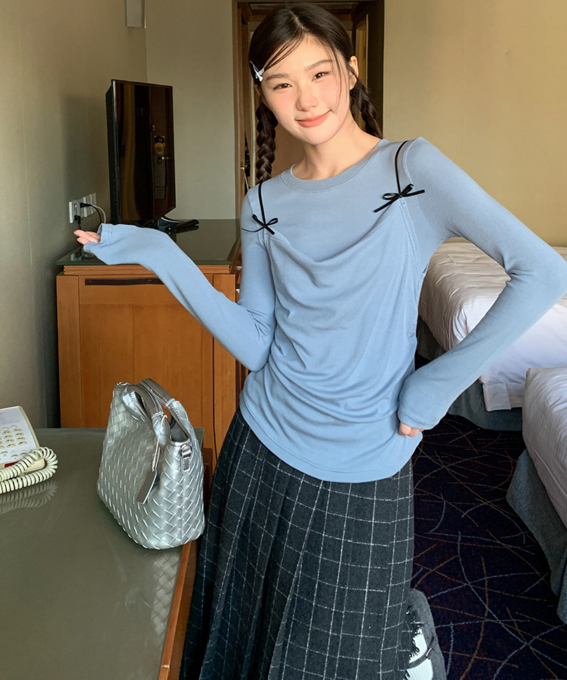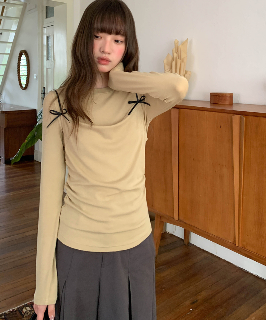 肩リボンが可愛いキャミ風トップスと、シンプルなカットソーのレイヤードセットです。