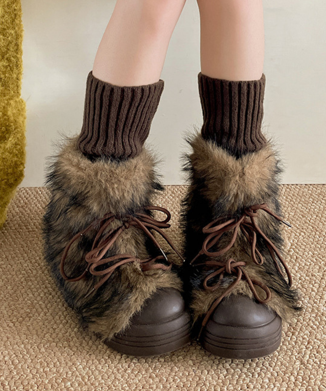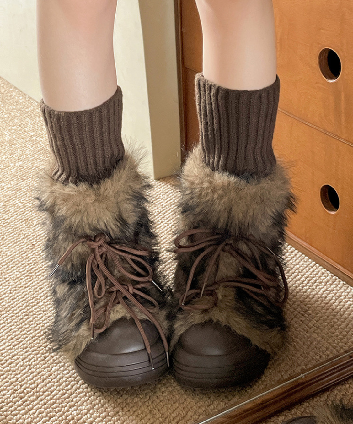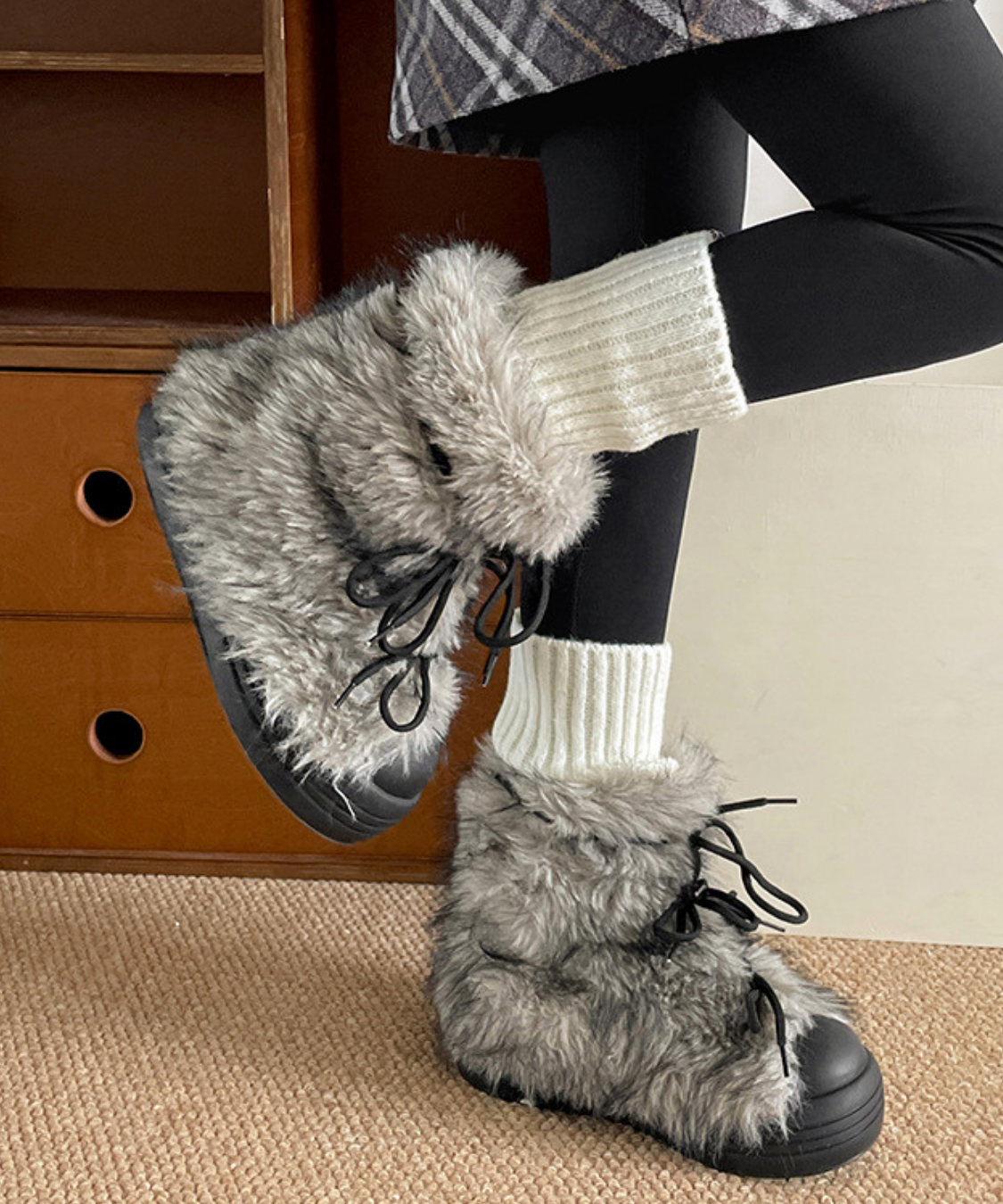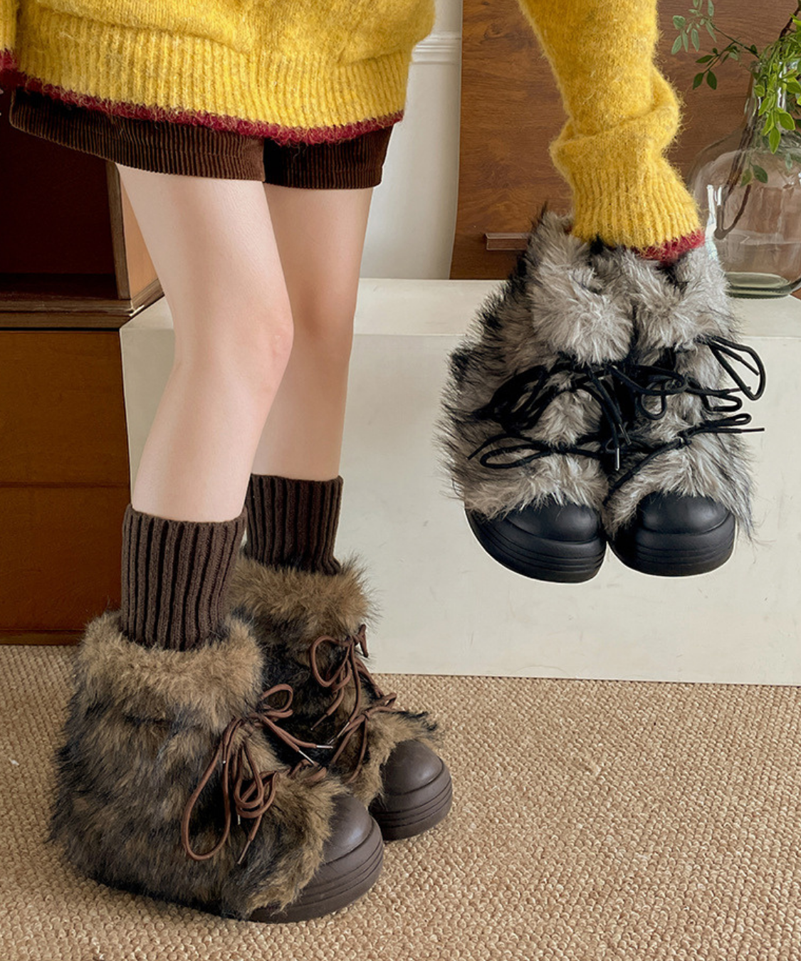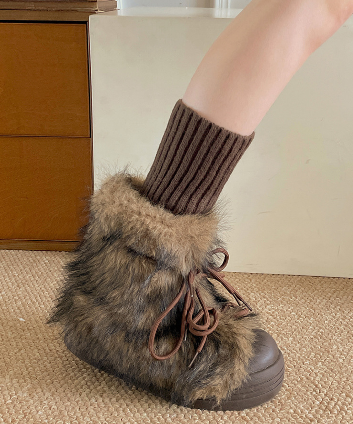 フェイクファーレースアップ厚底ショートブーツ