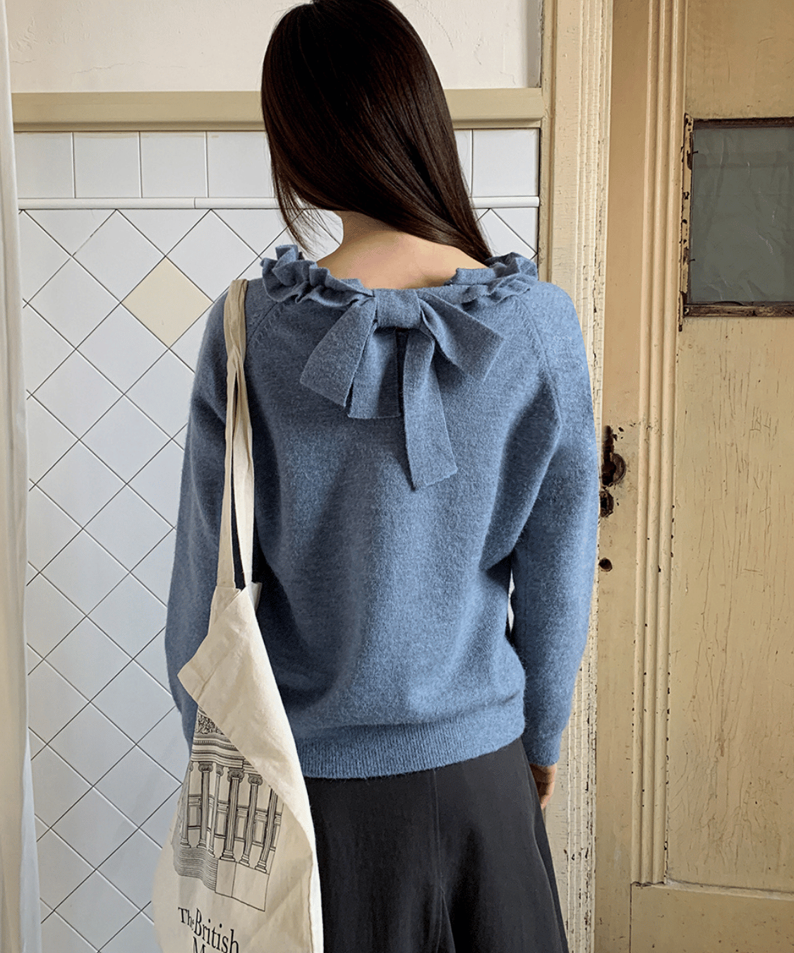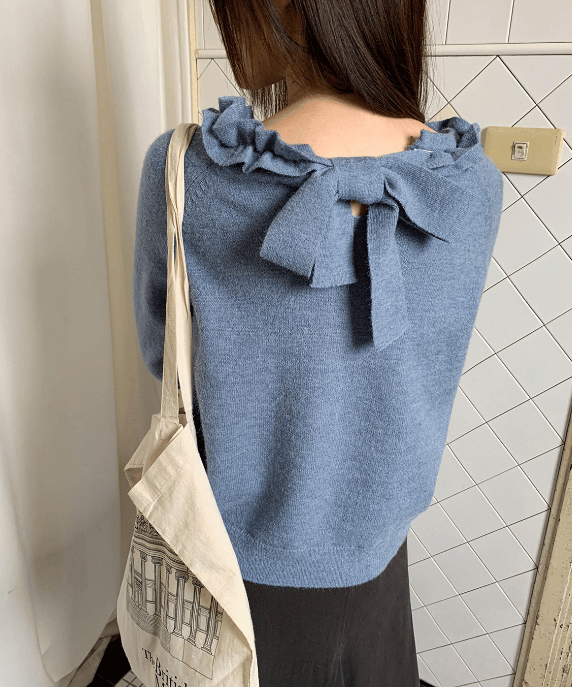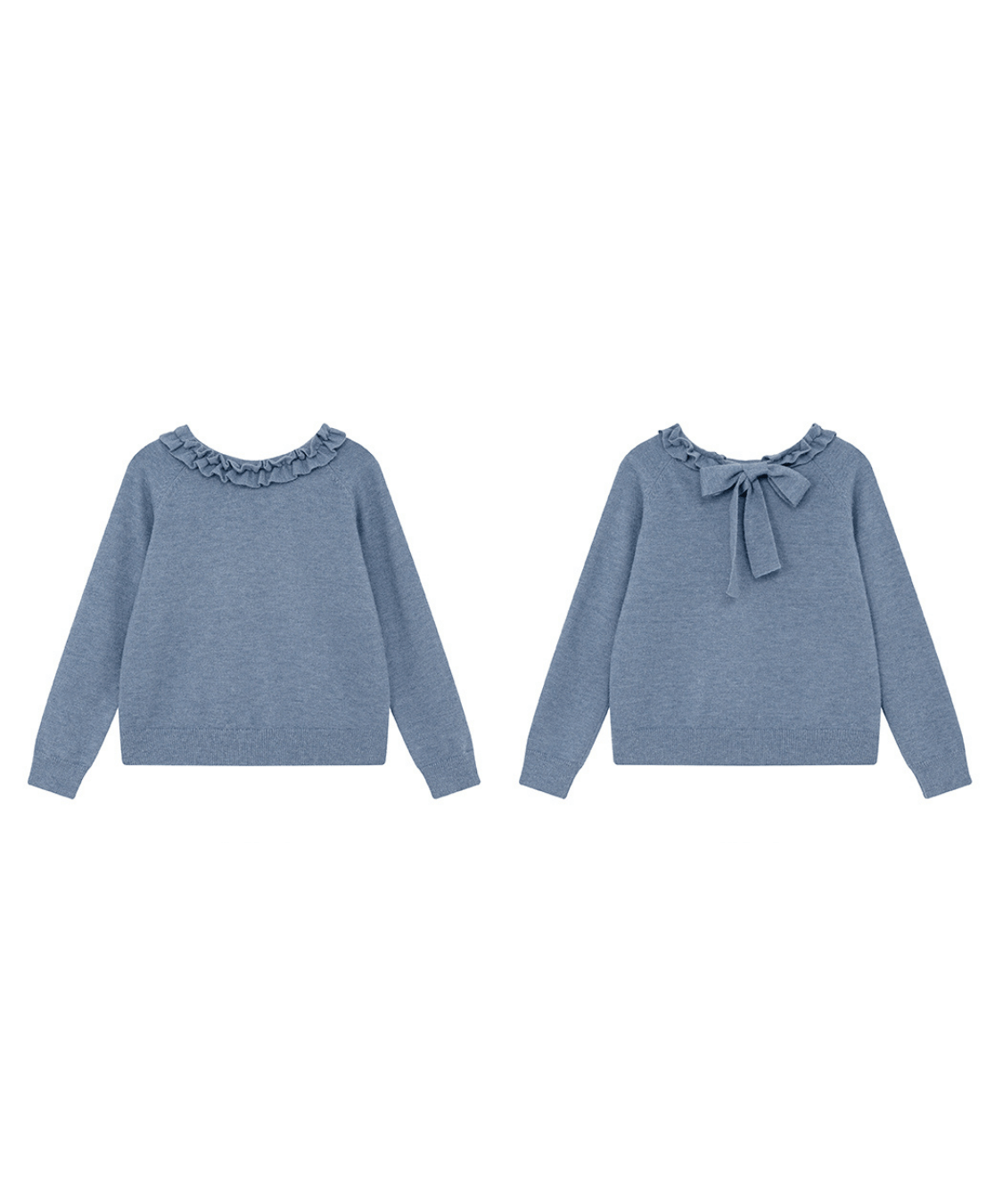 フリルネックとバックリボンデザインが後ろ姿まで可愛く見せてくれるニットトップスです。