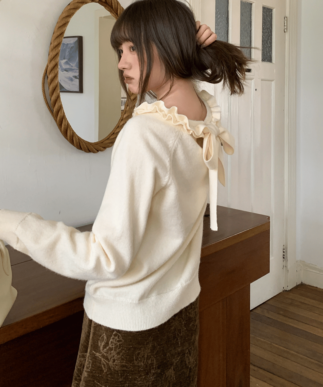 フリルネックバックリボンニットトップス