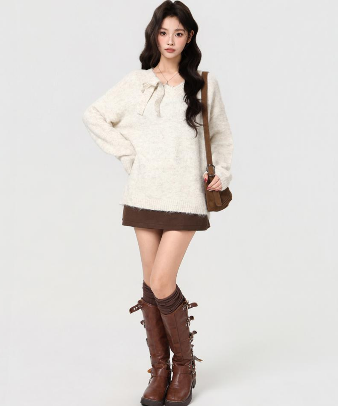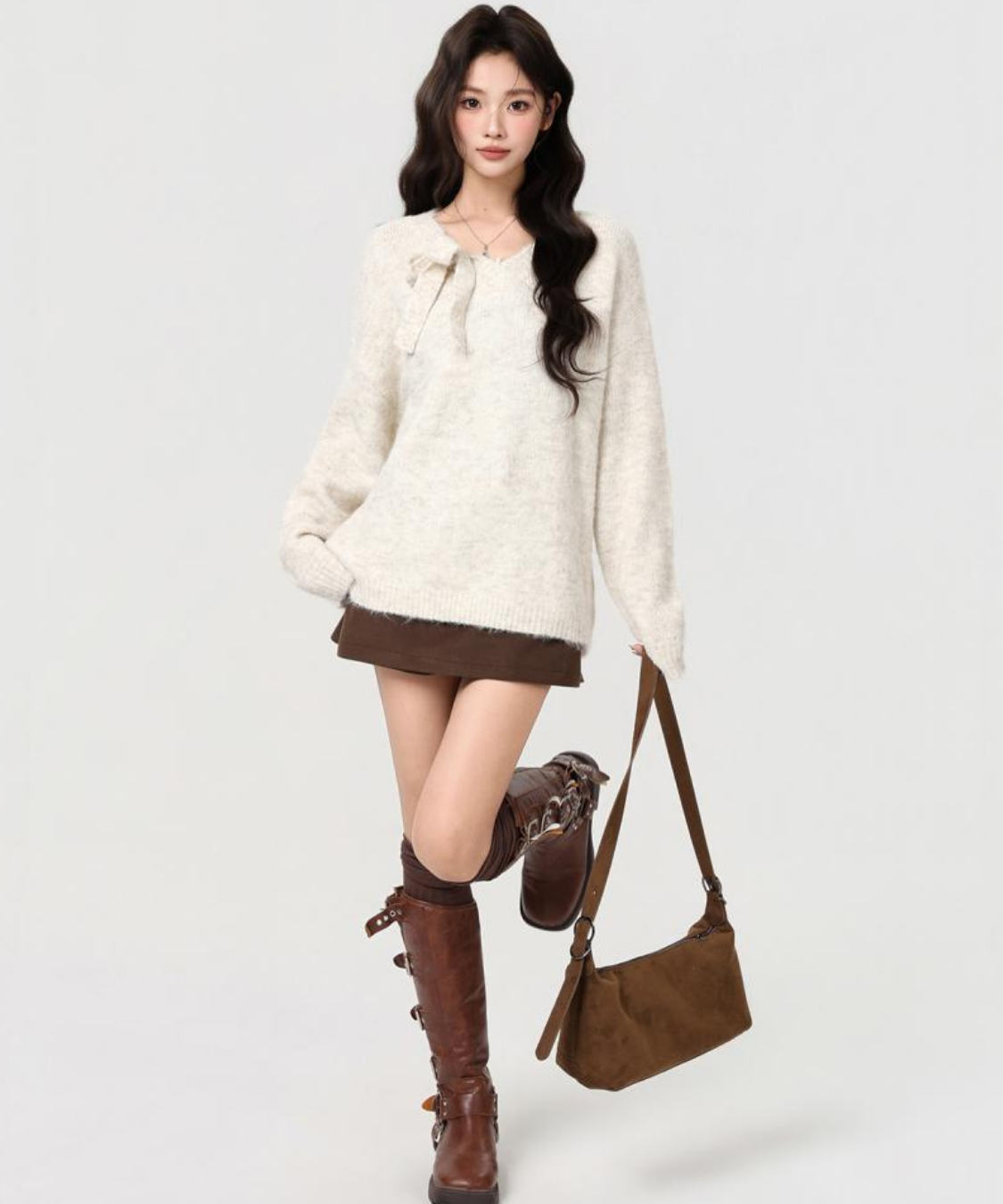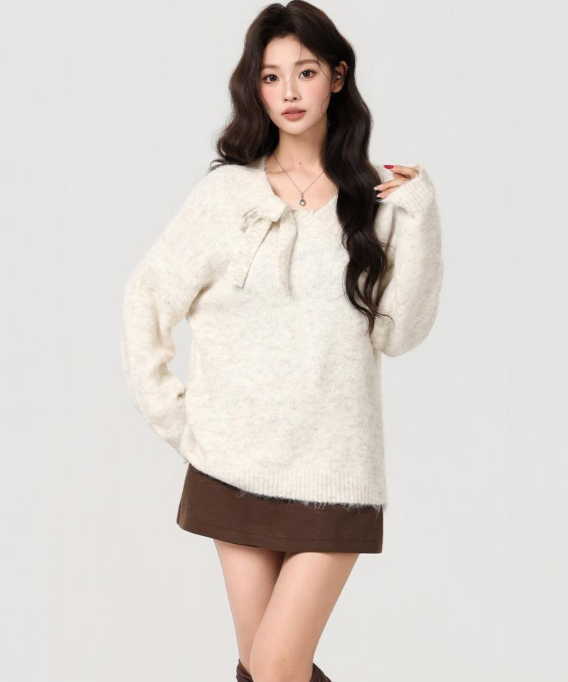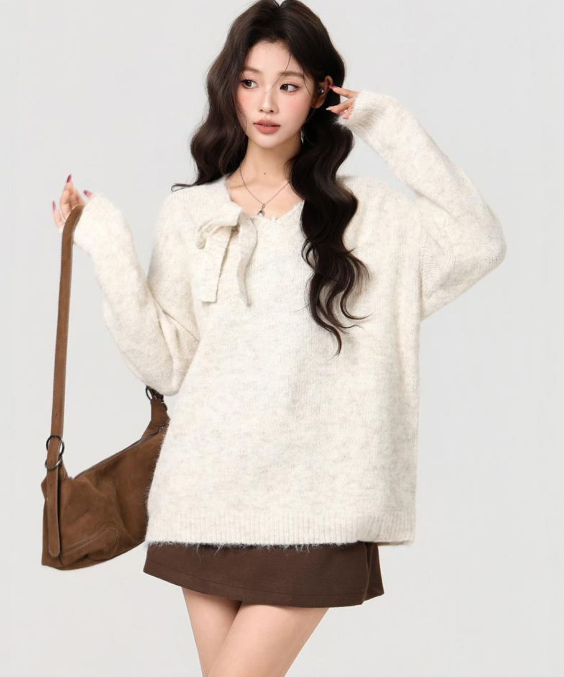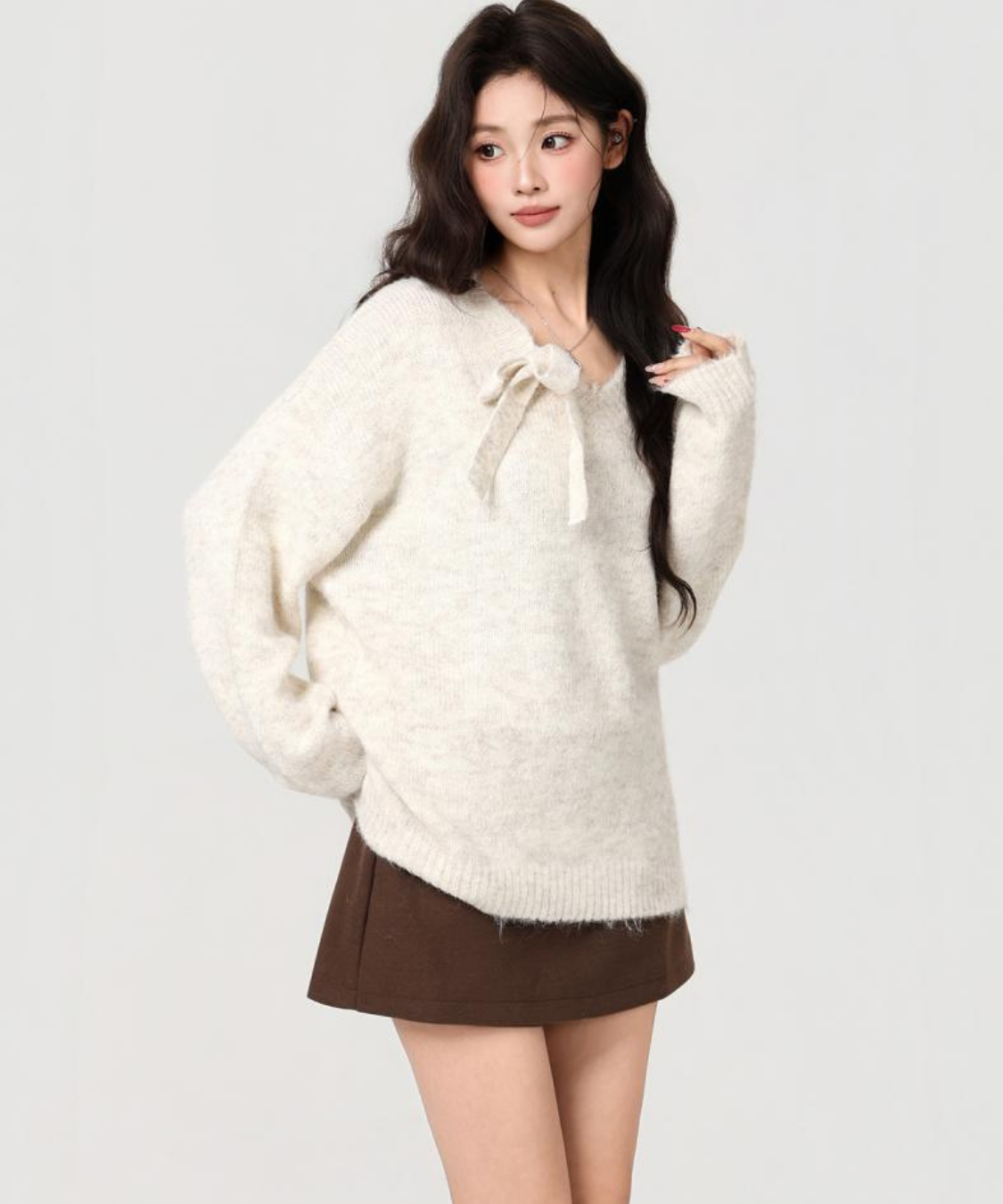 Vネックに添えたリボンが顔まわりをさりげなく華やかにしてくれます♡