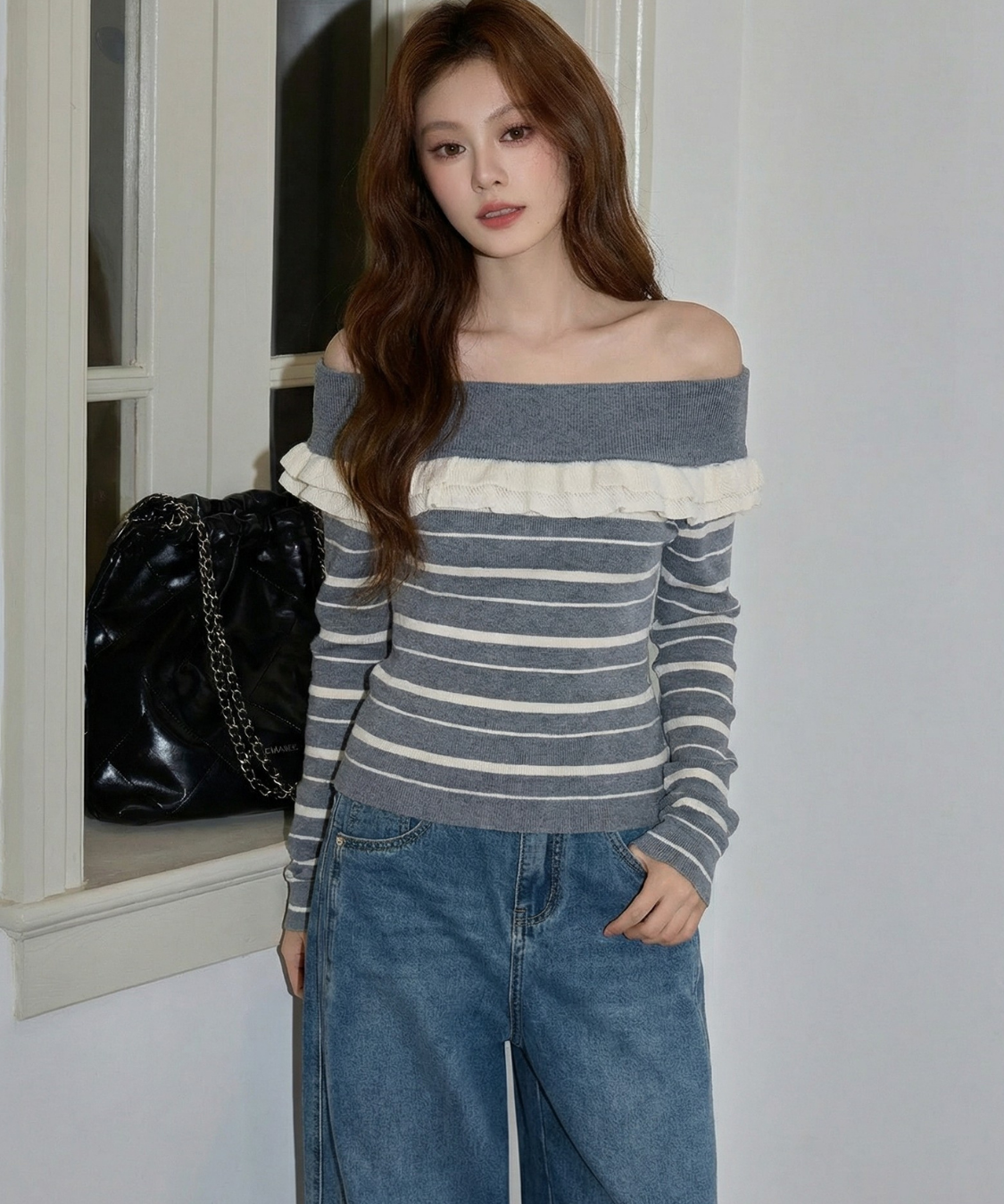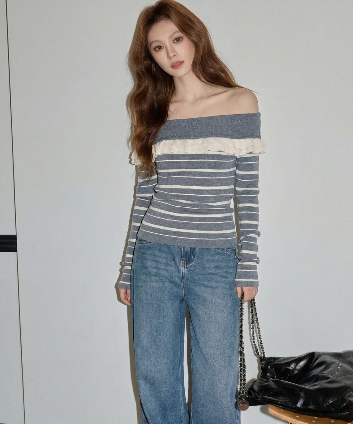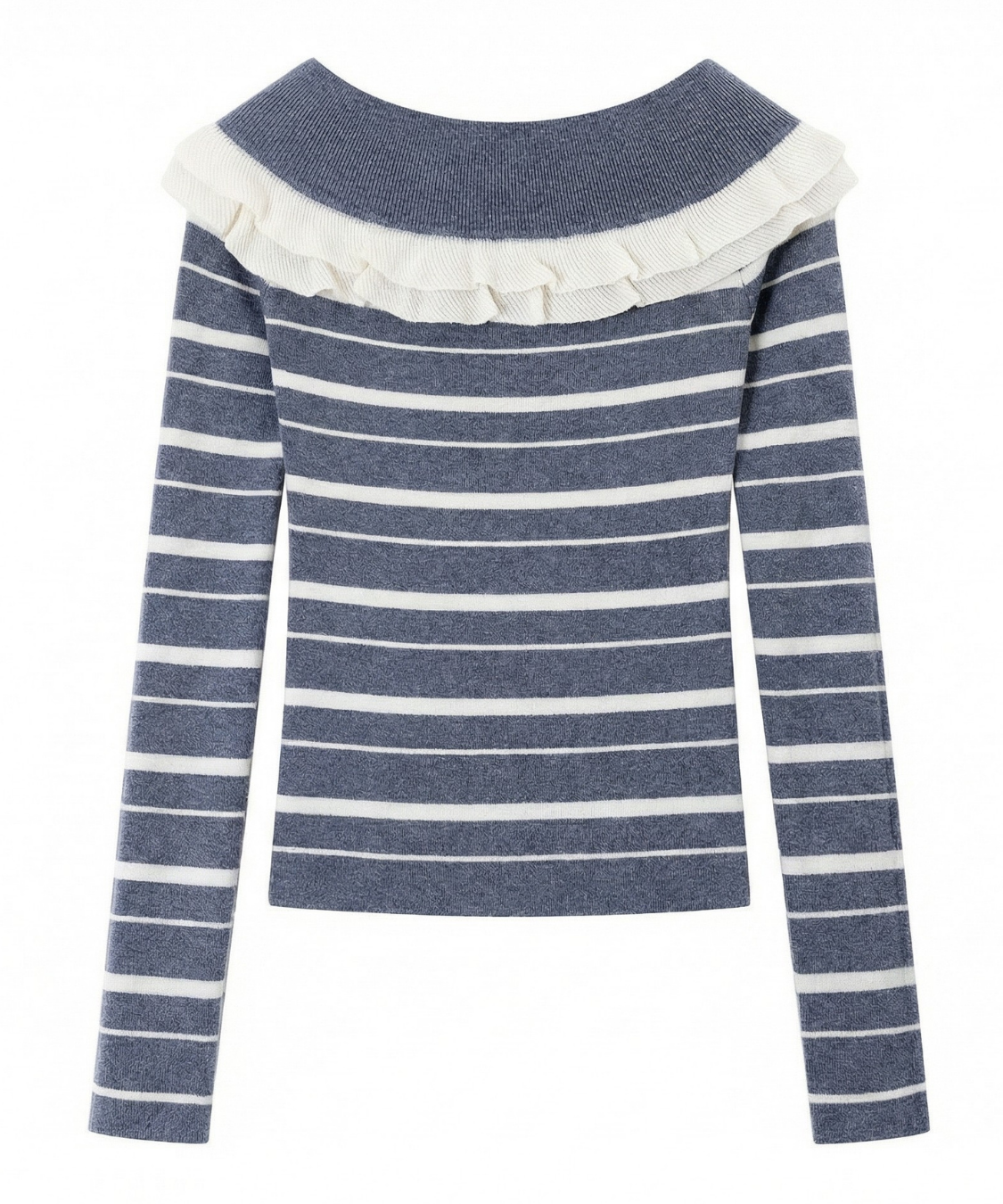 オフショルダーフリルボーダーニット