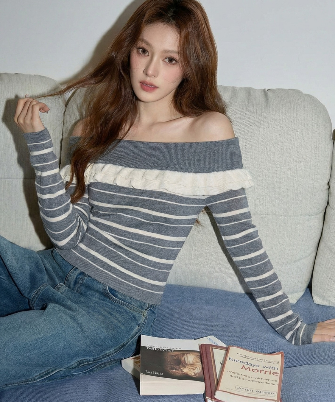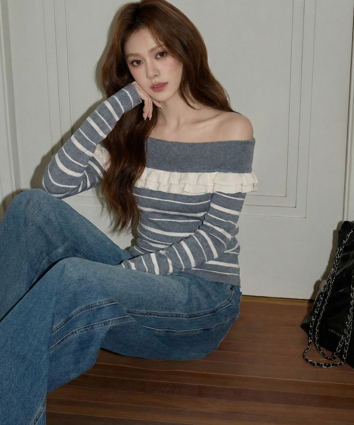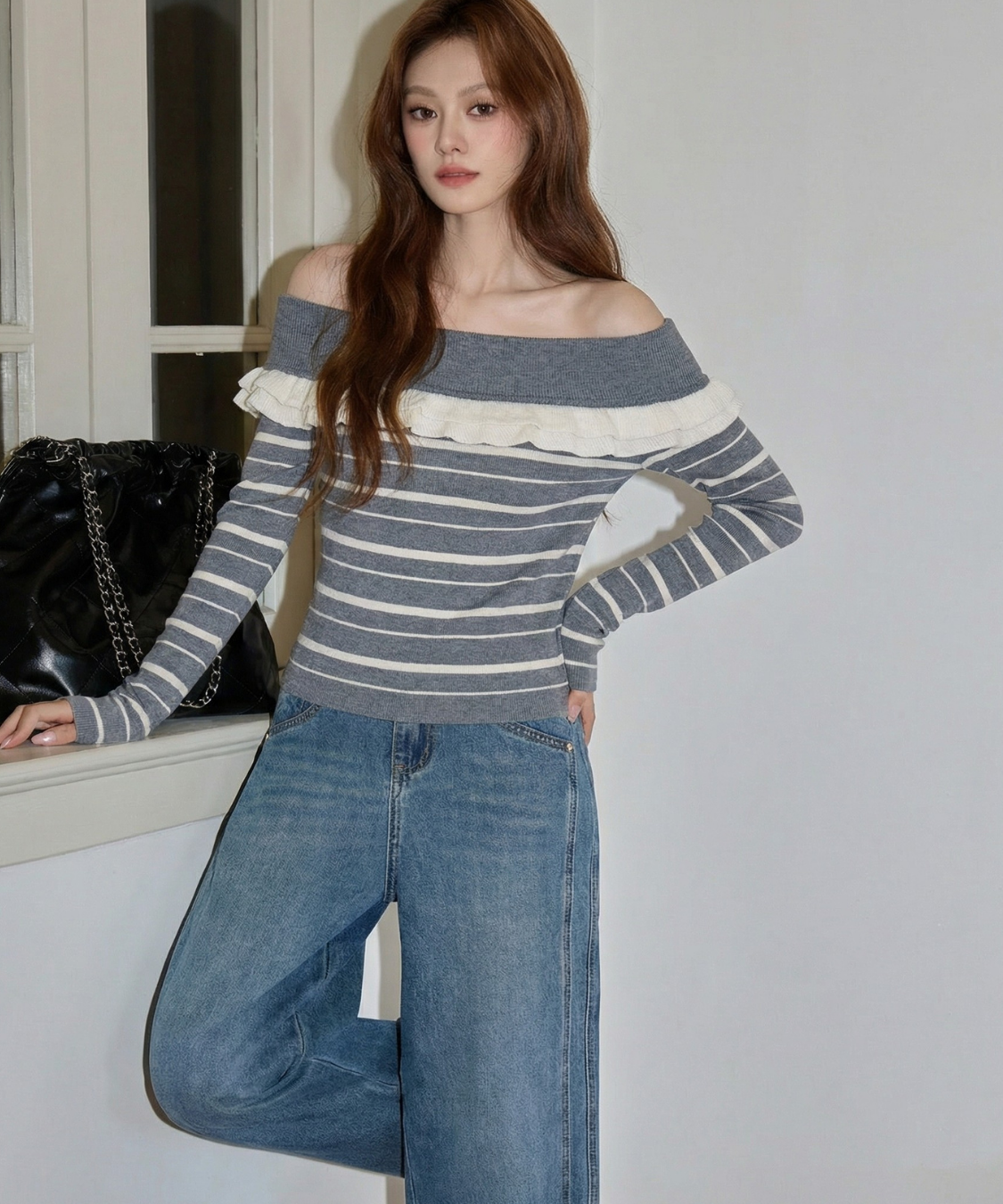 オフショルダーフリルボーダーニット