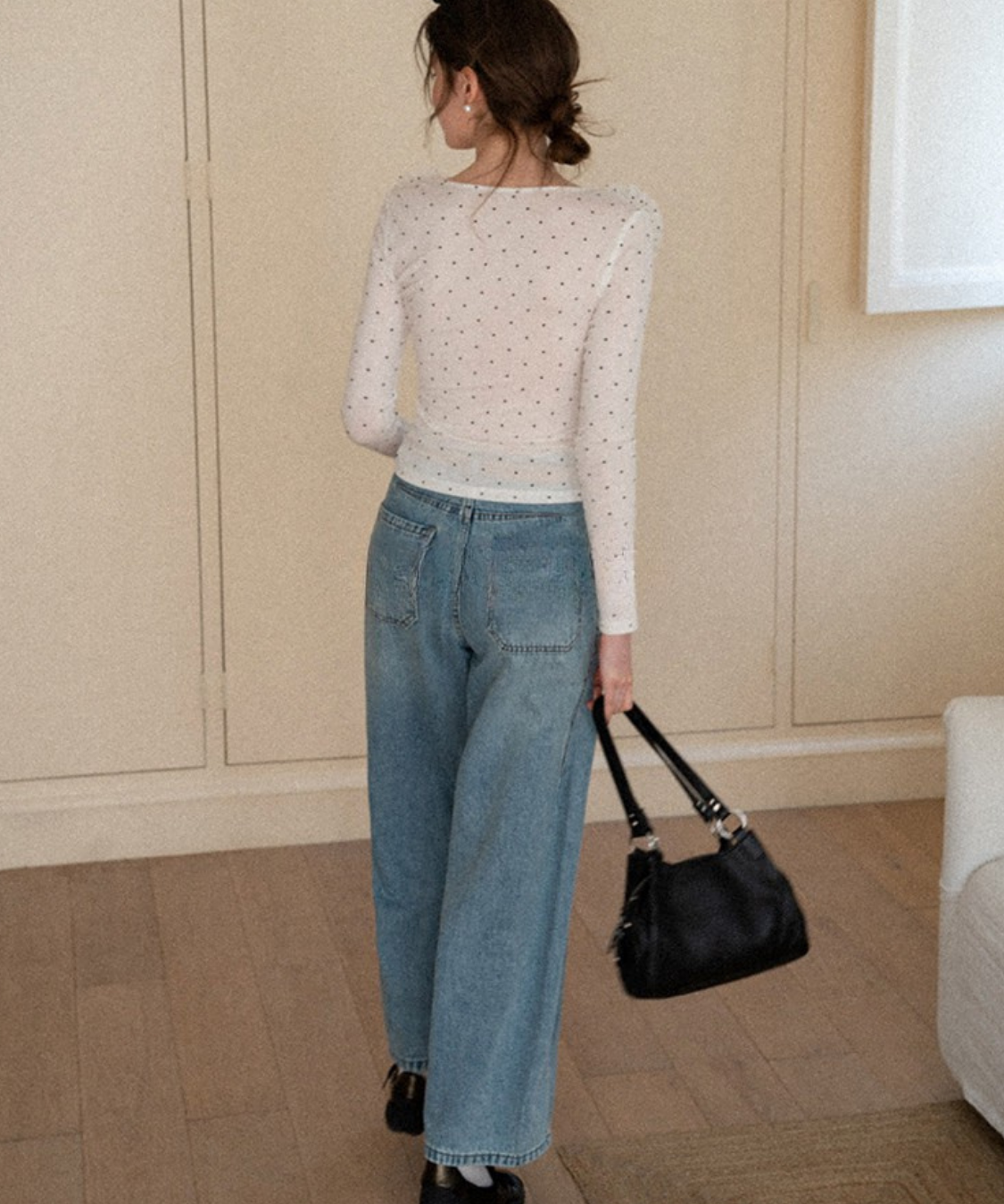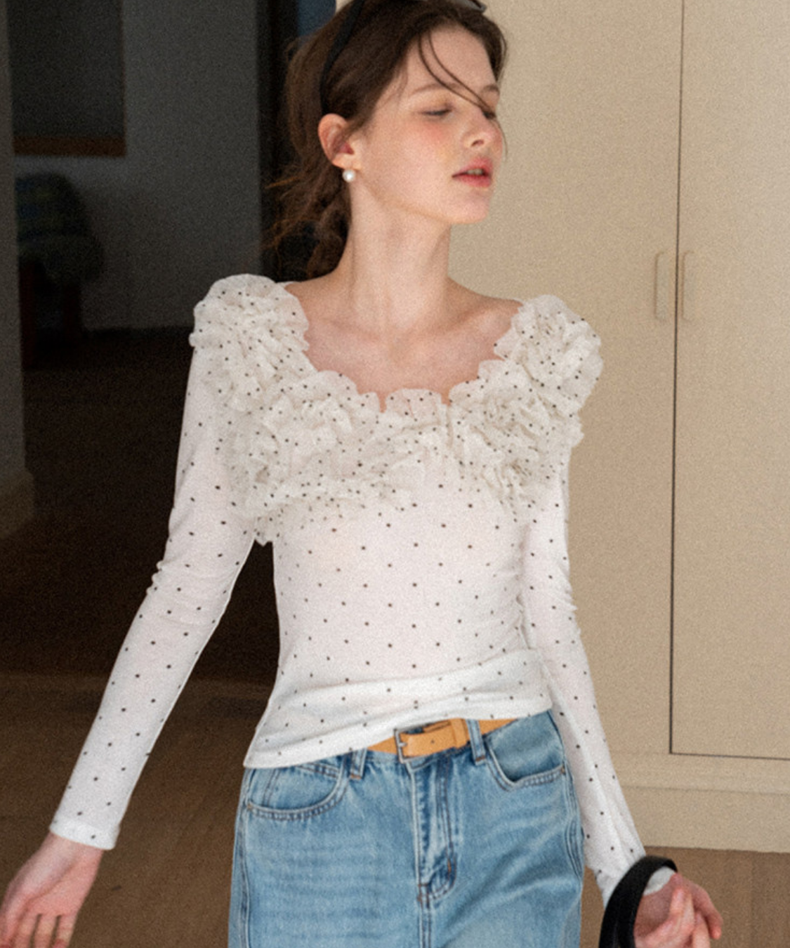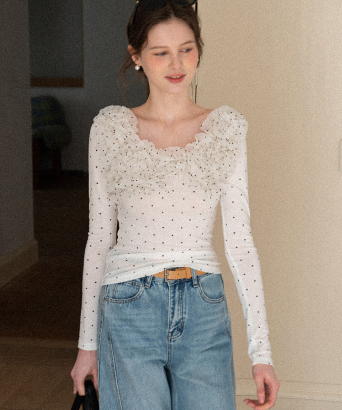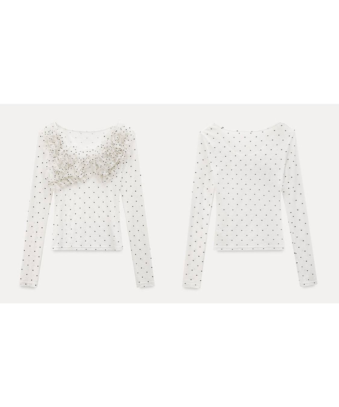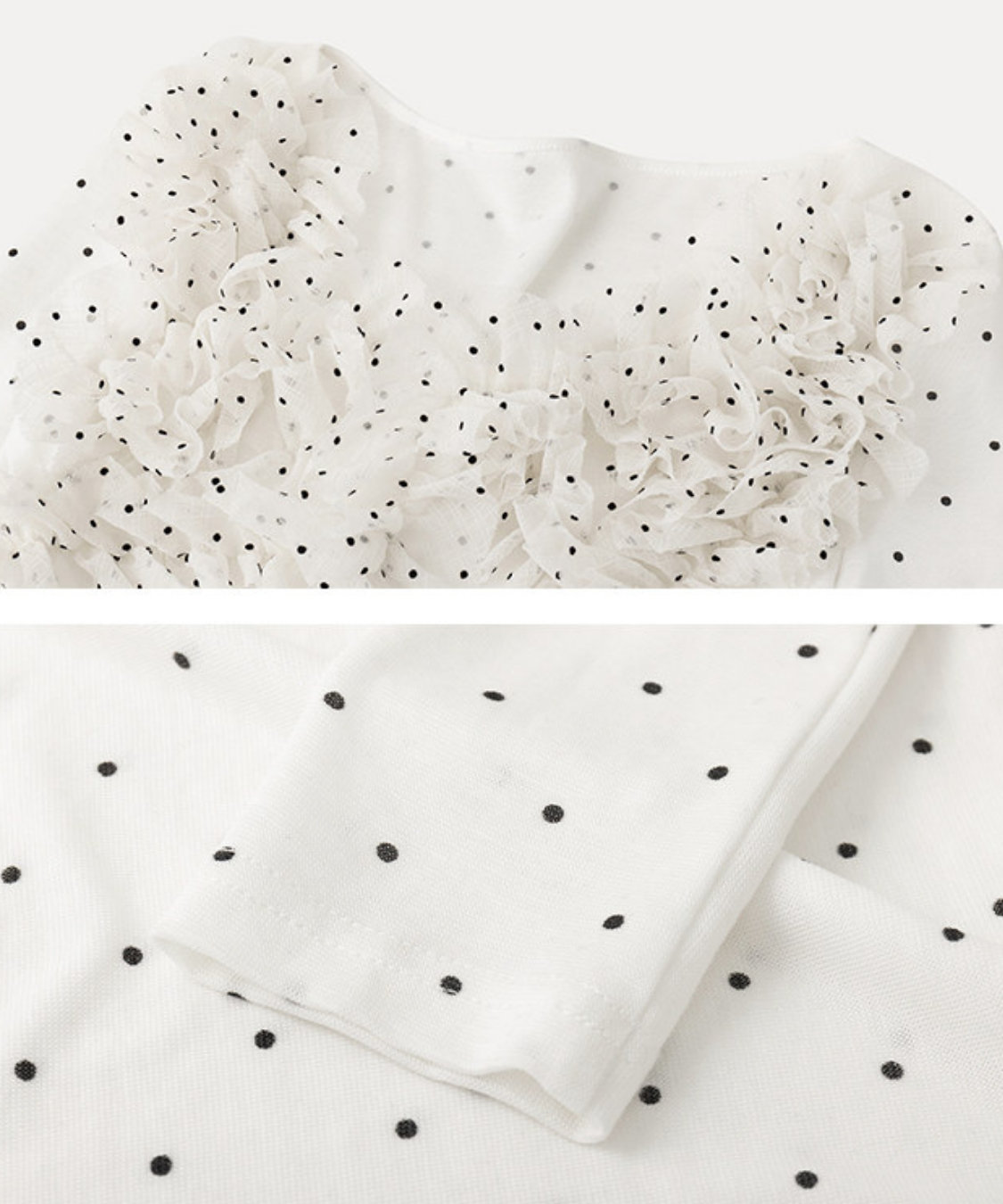 繊細なシアー素材にドット柄を散りばめた、フェミニンムード漂うトップスです。