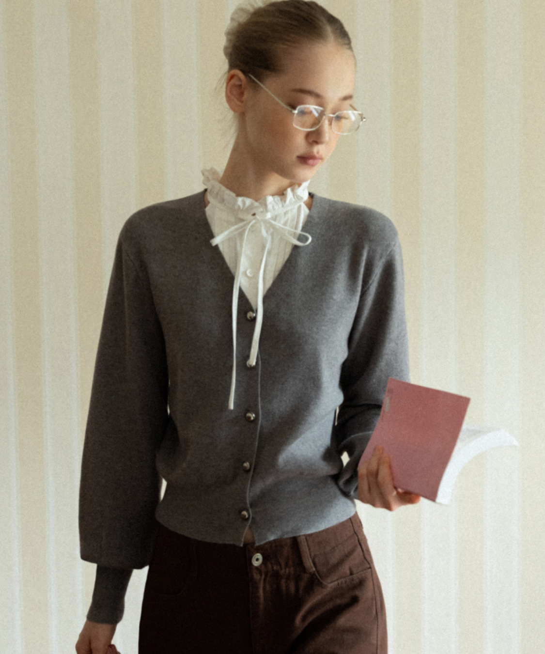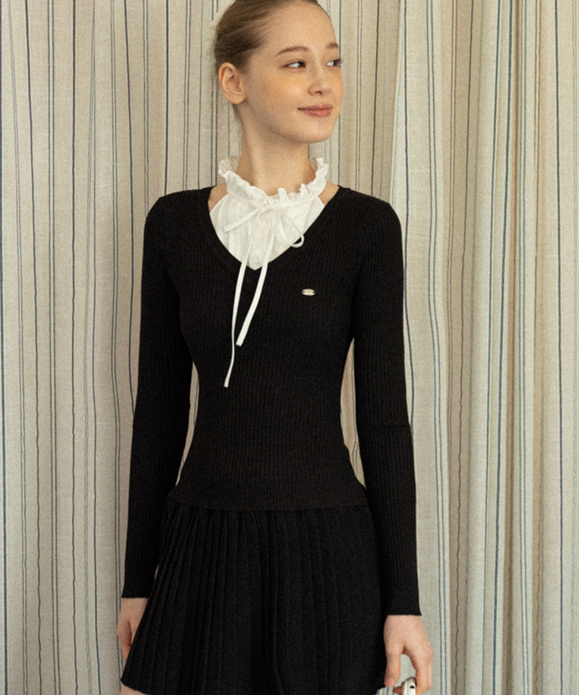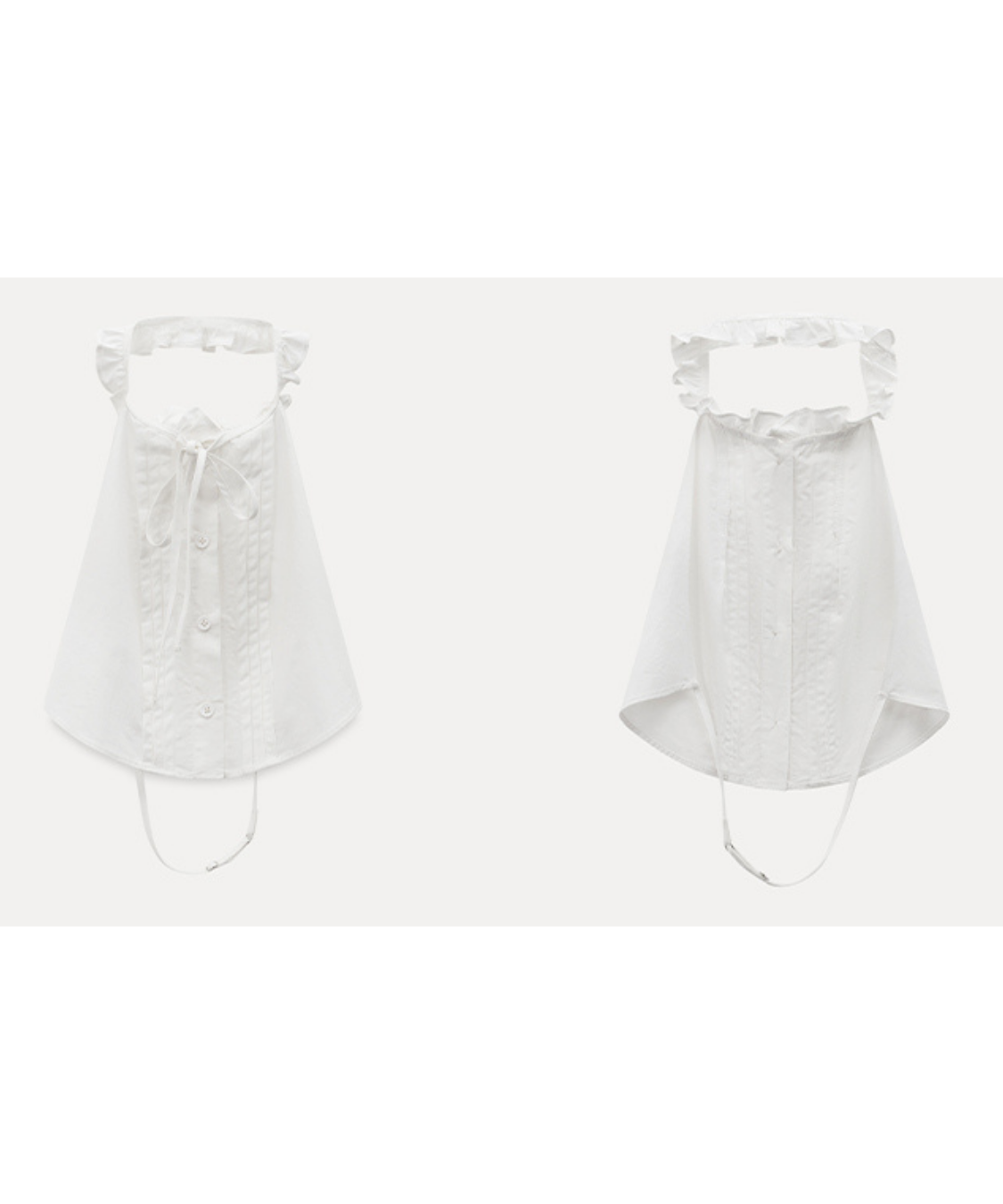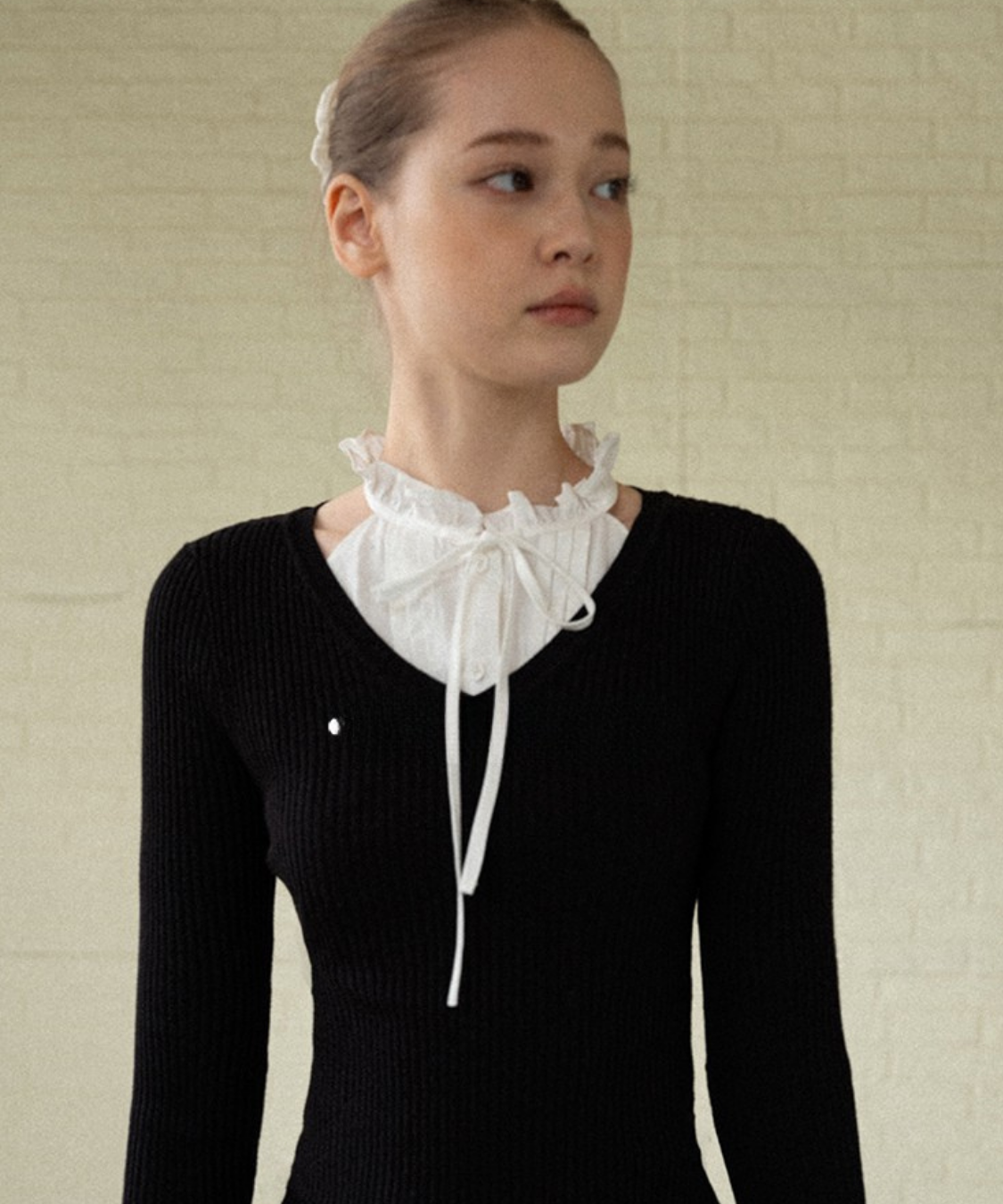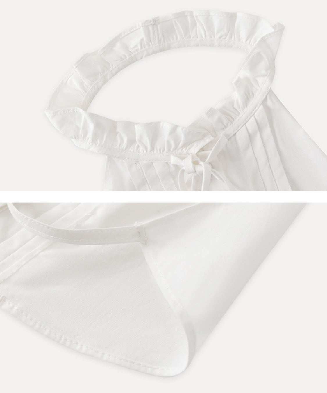 フリルとリボンが顔まわりを華やかに彩る、付け襟タイプのショートブラウスです。